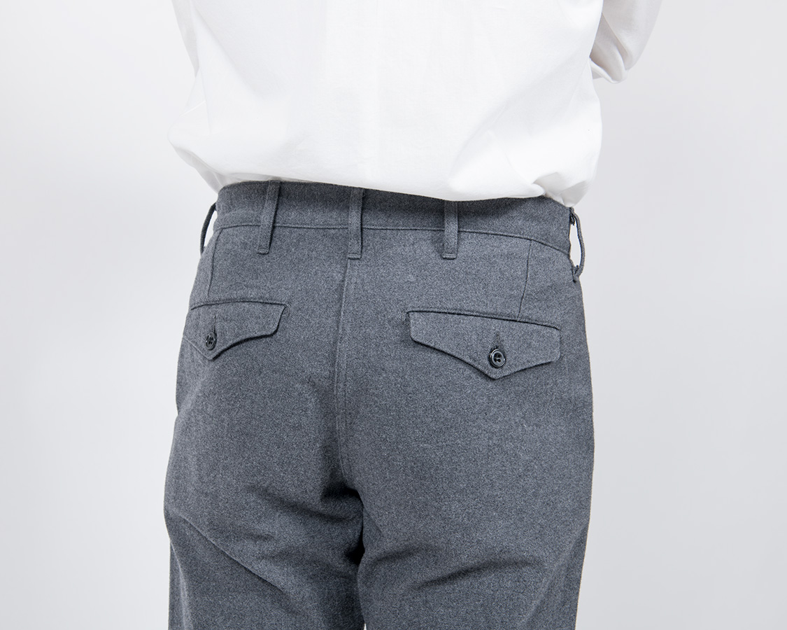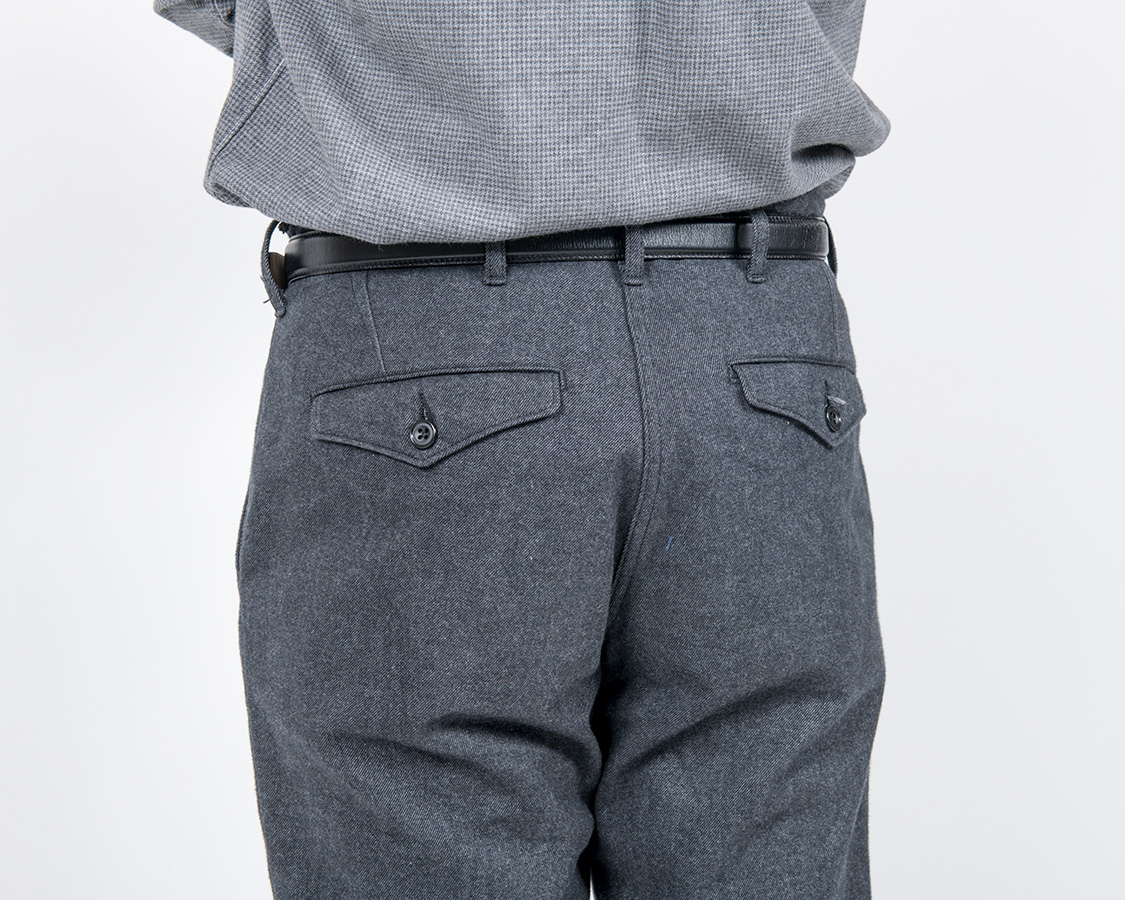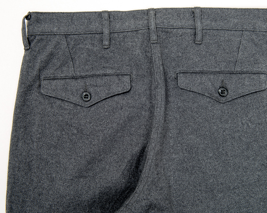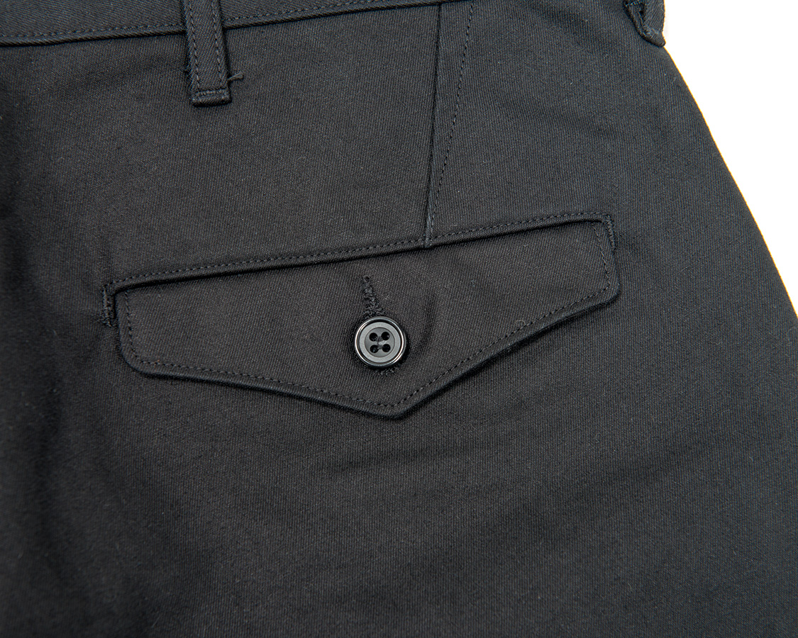 背面、Officer Trousersと同じく、ダーツでヒップの丸みを出す。尻ぐりはあえての巻縫い。やはり地縫いより強度があるため。