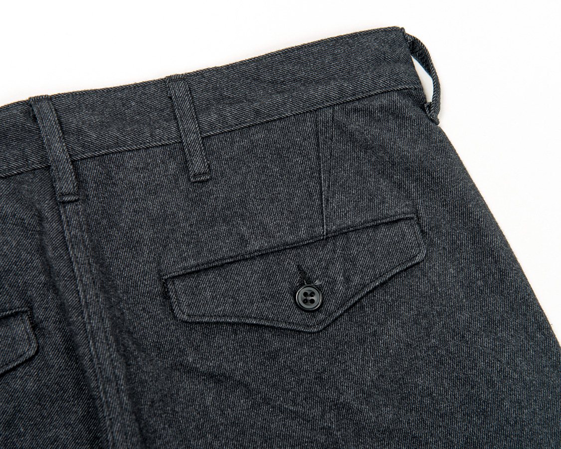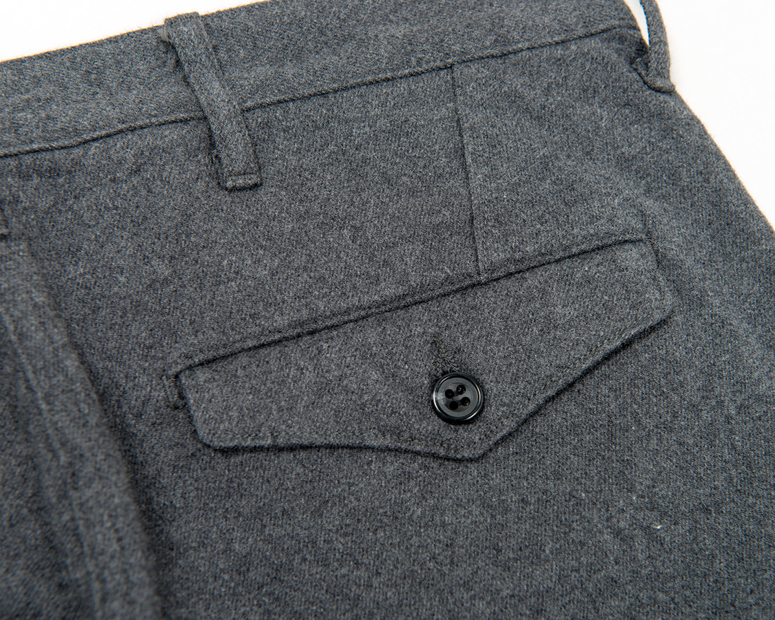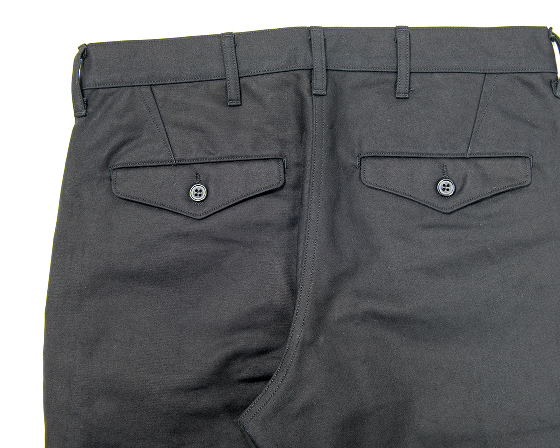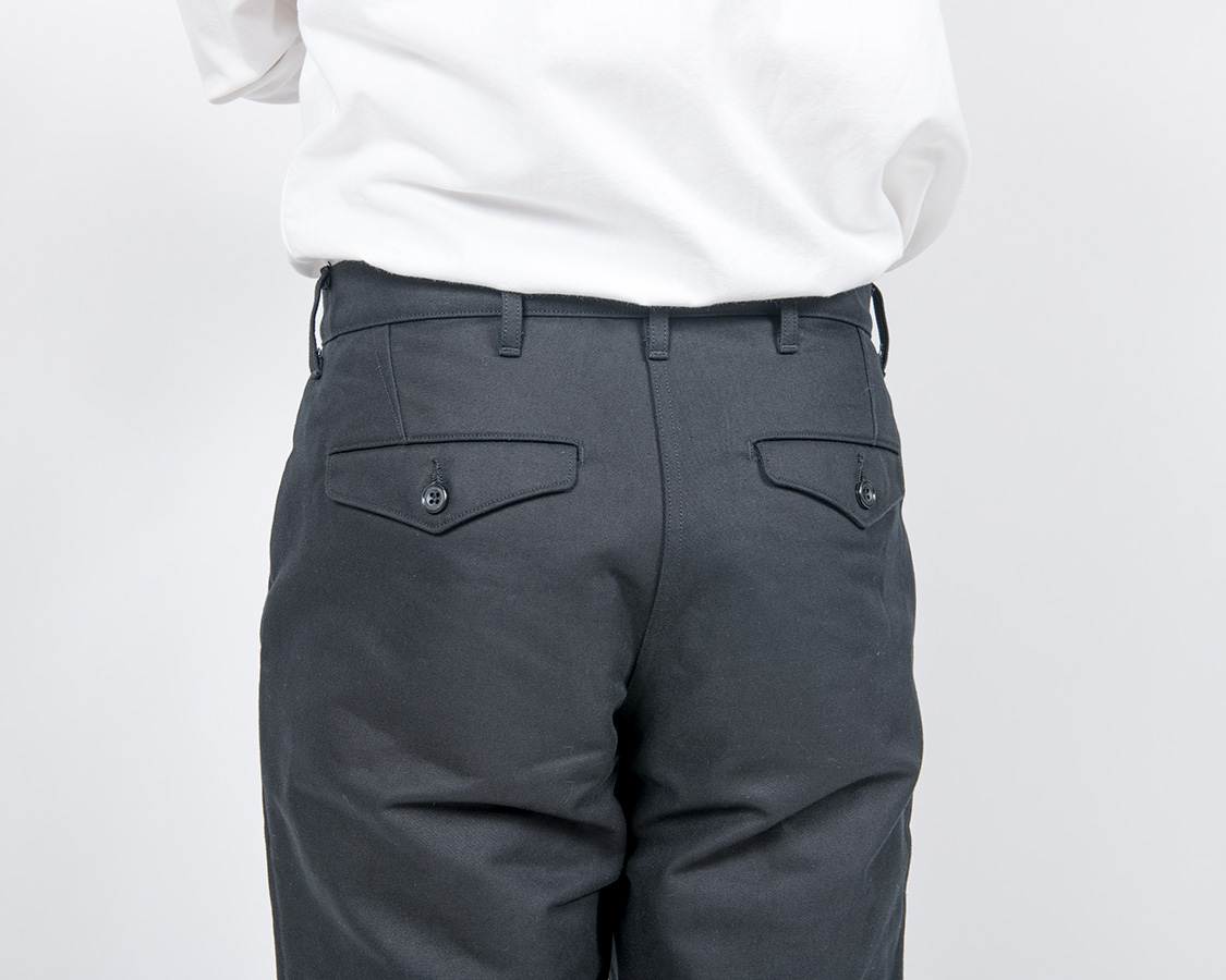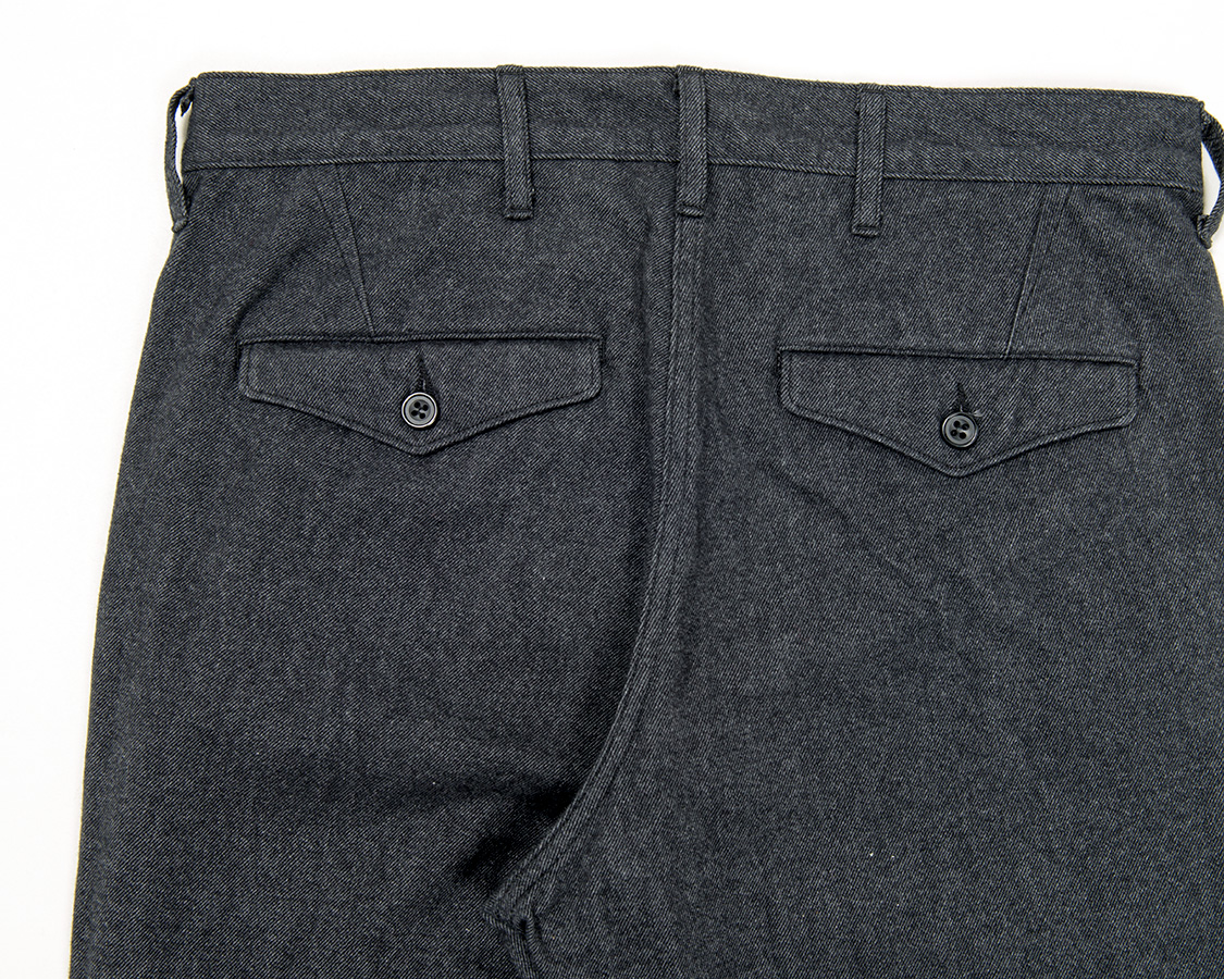 背面、Officer Trousersと同じく、ダーツでヒップの丸みを出す。尻ぐりはあえての巻縫い。やはり地縫いより強度があるため。