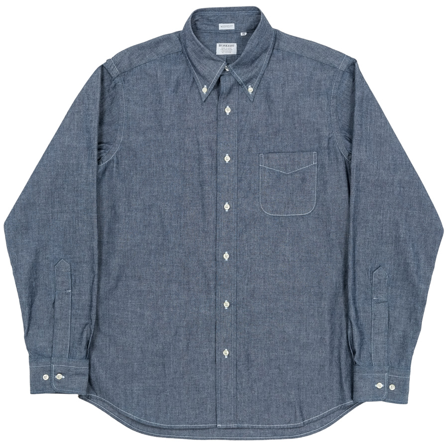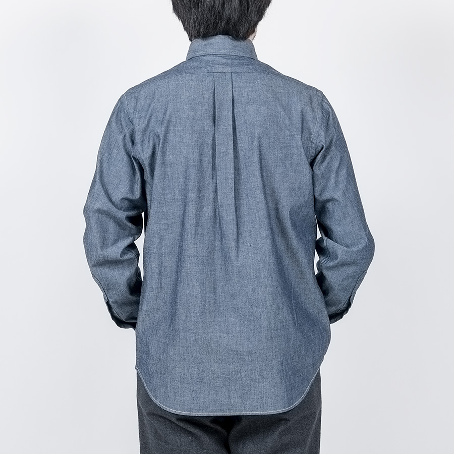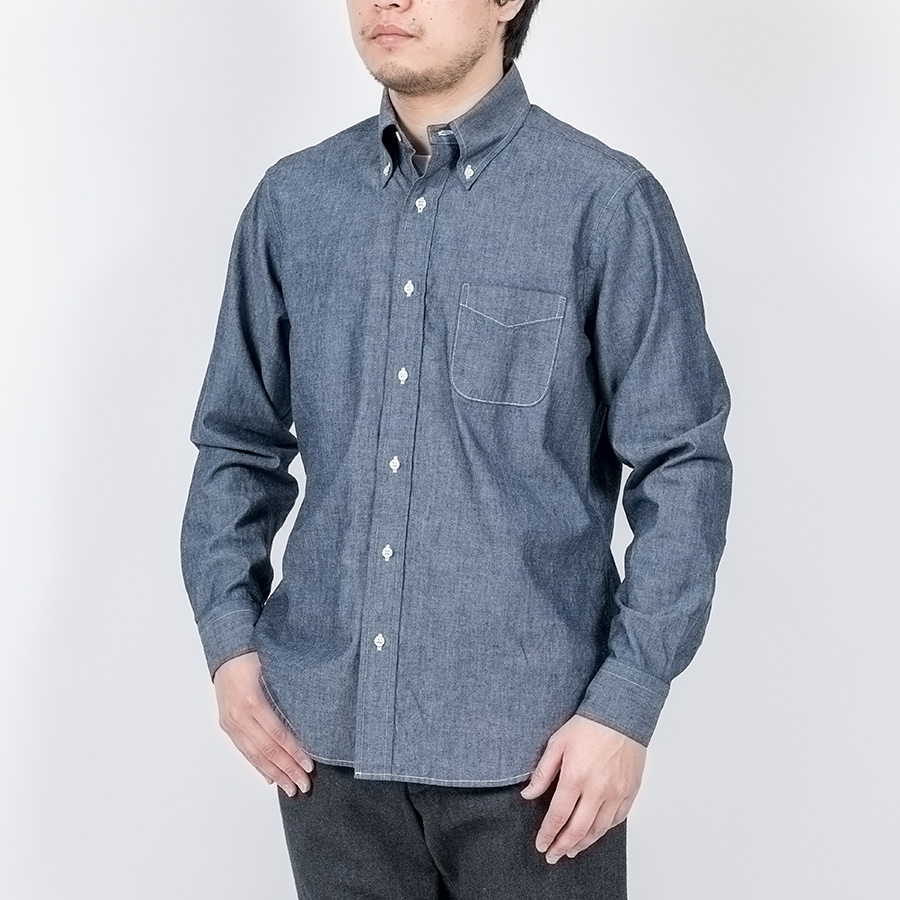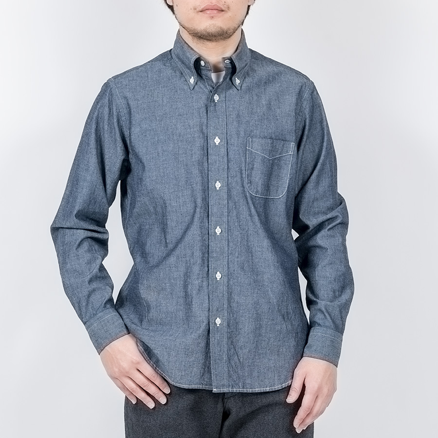 シャンブレー、ダークブルーはいわゆるワークシャツのシャンブレーのブルーとは違う、より落ち着いたトーンのもの。