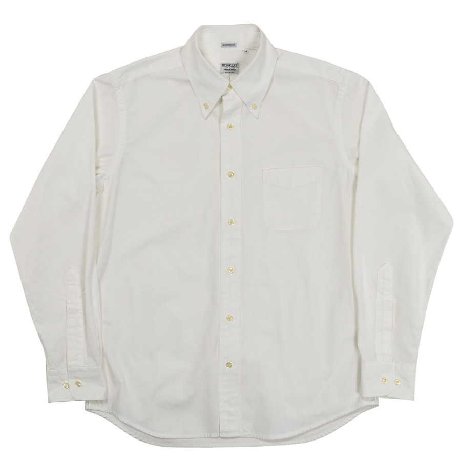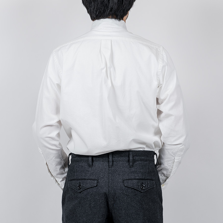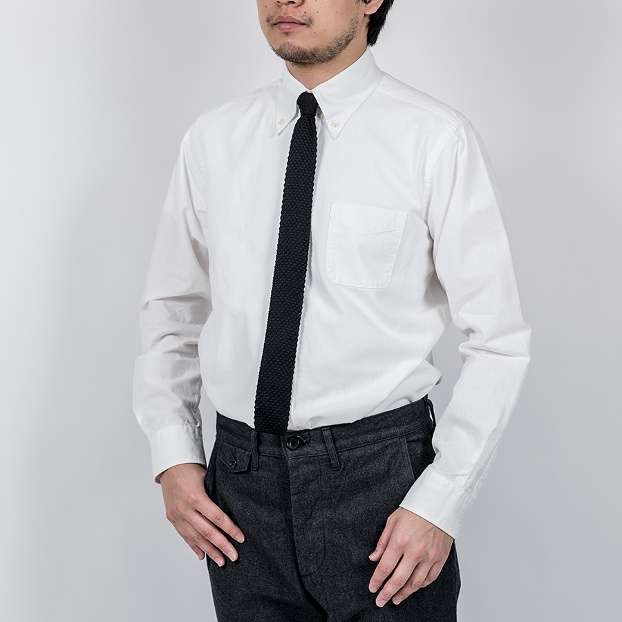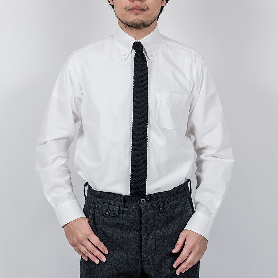 ホワイトは生成りではない、ホワイト。でも素材が一本づつの平織りなので、オックスよりは光沢感が無く、よりカジュアルに見える。ちなみにオックスは引きそろえたものを平織りするので同じ平織りでも微妙に見え方、手触りが違います。