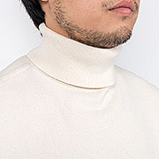 タートルネックはこの身頃に横編み機で作ったパーツを縫い付けて、あたかもセーターのように。でもコットン100、 水洗いもできますし、T シャツの上に一枚で着られます。ジャケットのインナーには最適。
