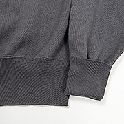 身頃はおなじみ、某海外の極厚カットソーのさらに倍の厚みを目指した超極厚天竺。スペックで言うと、某海外製が16 番双糸(8 番程度)の天竺。これでも、ジーンズに使う13.5 オンスデニムが7 番クラスの糸で織るので、いかに厚いか わかります。WORKERS では、さらにその16 番双糸を編み針に2本引き揃えることで、4 番クラスの糸で編んだ天竺生 地になります。今年から編んだ後の洗い仕上げを変更し、よりふっくら柔らかに、よりセーター風の生地に。