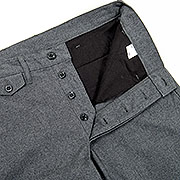 フロントボタンフライ、中の見えない部分はスレキにして厚くなりすぎないように。形はトラウザーズですが、あえて帯を別帯。いわゆるジーンズなどと同じように先に身頃を作ってから帯を取り付ける方法にしています。少しカジュアルな印象になりますが、帯でぐっと閉まるので穿いたときに 安心感があります。