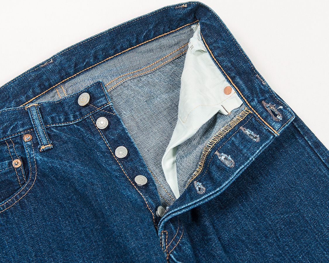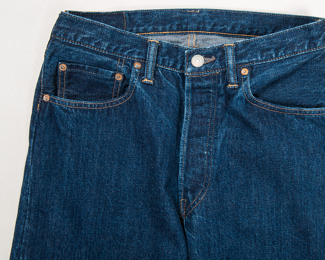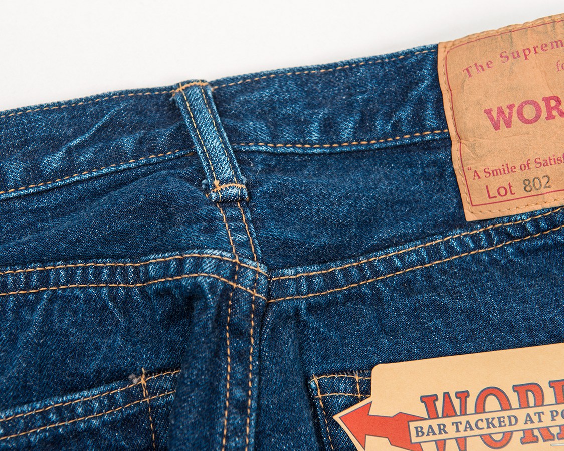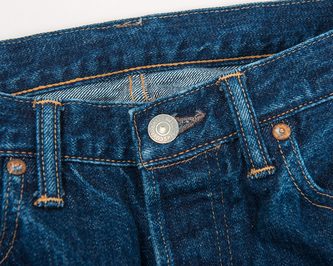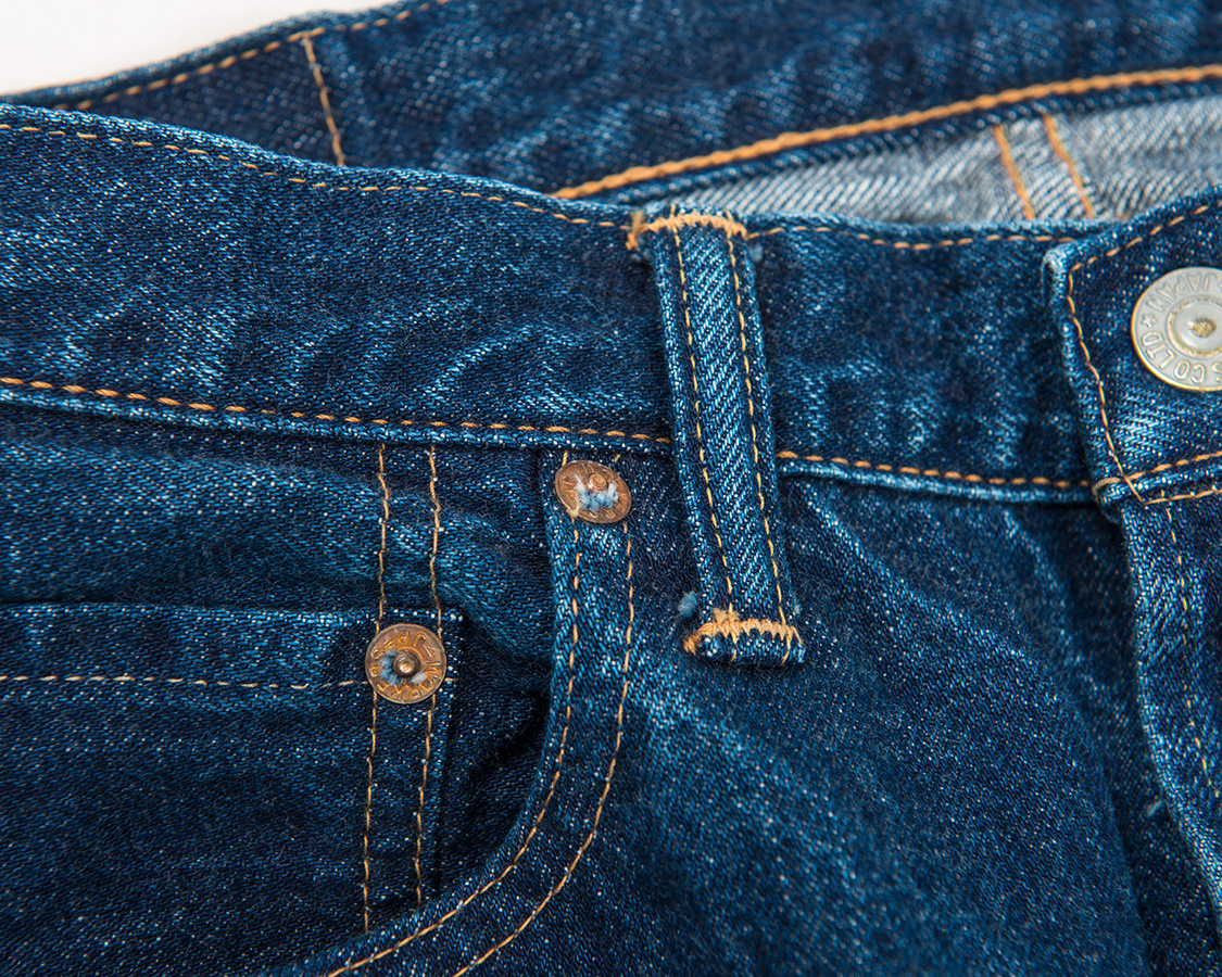 過度な加工はしていないので、色はきれいに落ちていますがステッチはまだまだ元気です。人がはいてここまで落とすと、どうしても、ウェスト裏はこすれてステッチが多少傷んできます。色落ちの「おいしいところ」を長く楽しめる、加工の良い部分でもあります。