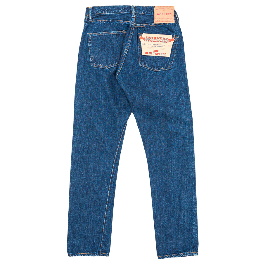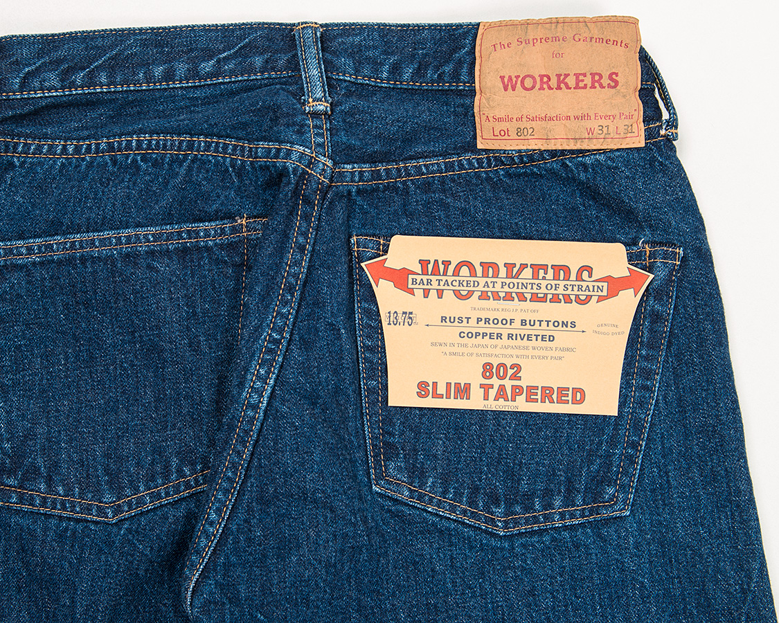 ひたすらWORKERSの定番ジーンズ、Slim Tapered FitのLot 802。これをひたすら水洗い・乾燥機を繰り返し色見本を作りました。その見本をもとに加工で作ったのが本製品。