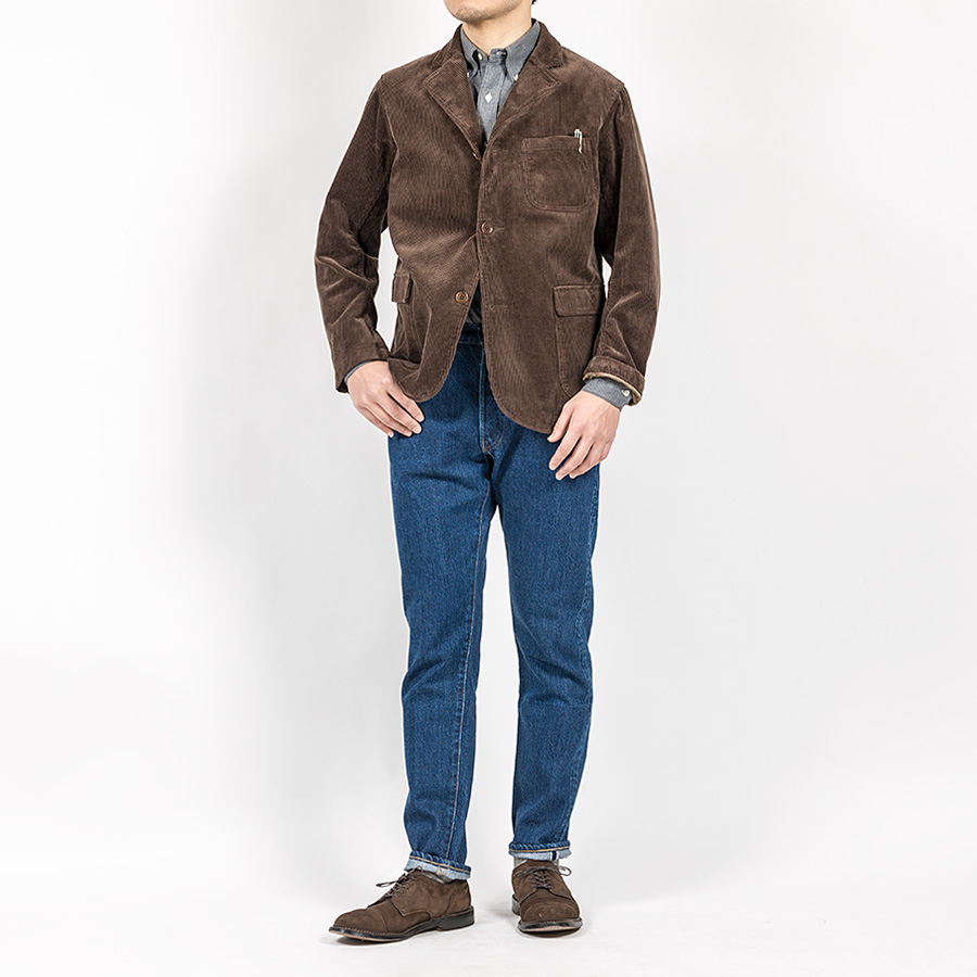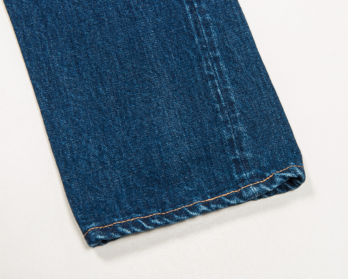 加工のポイントは「色」。ワンウォッシュよりはしっかり落ちている、でも落ちすぎていないきれいなブルー。ヒゲやハチノスは前述の通り無し。ただ、セルビッジジーンズのポイント、脇のセルビッジはしっかり出るように。同じく、後ろヨークの巻縫い部分も少しだけ加工で触ってパッカリングを出しています。夏は色落ちしたジーンズが穿きたいですし、秋にもツイードのようなカジュアルさのあるジャケットには良く似合うと思います。