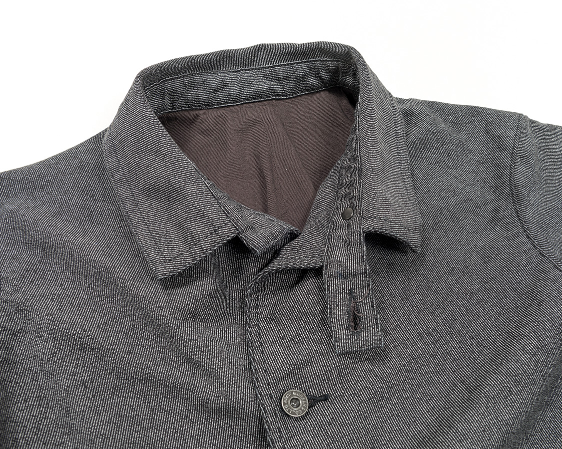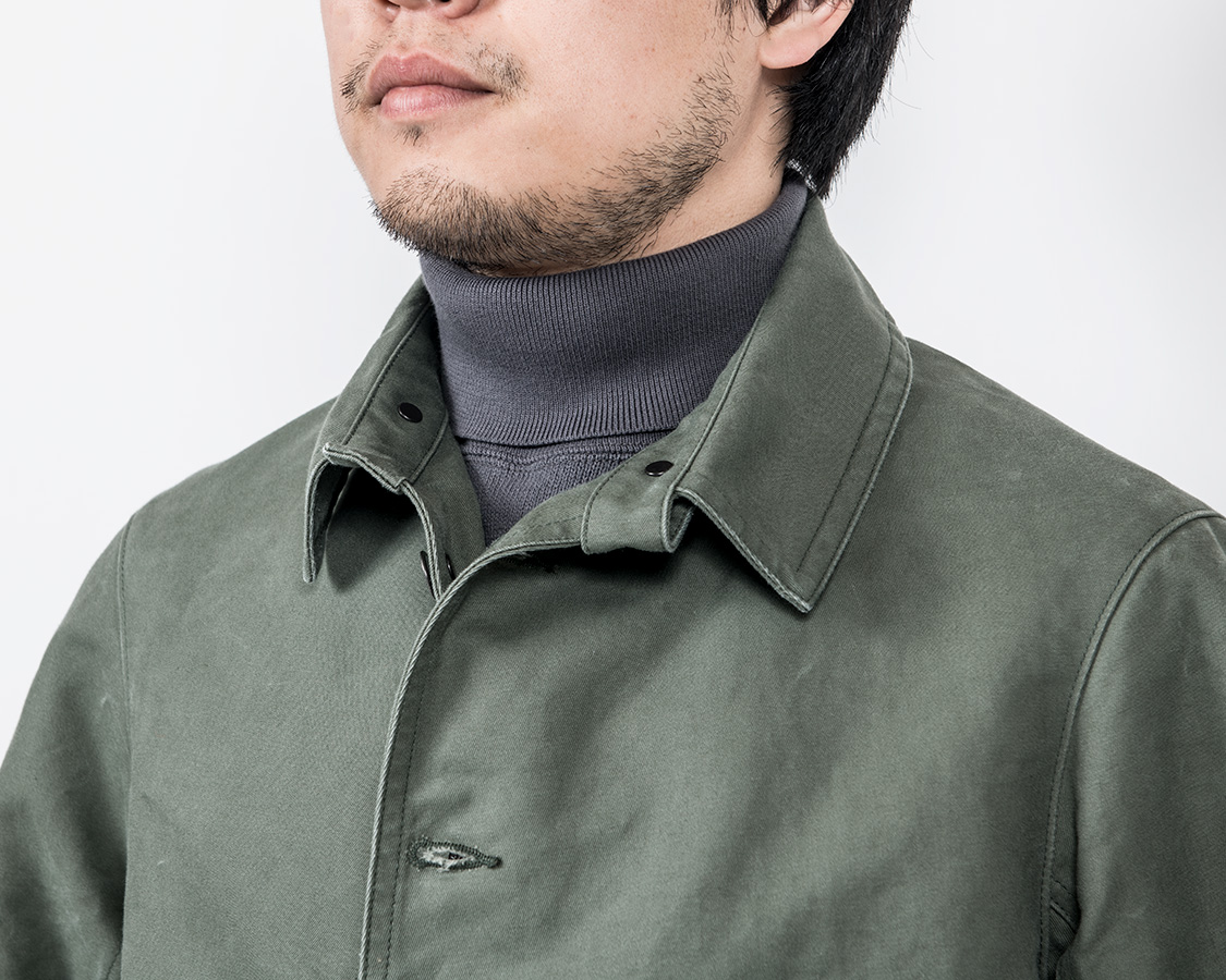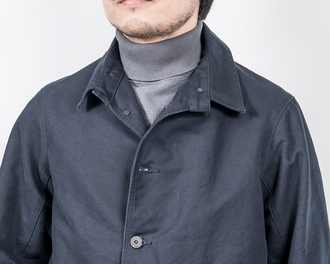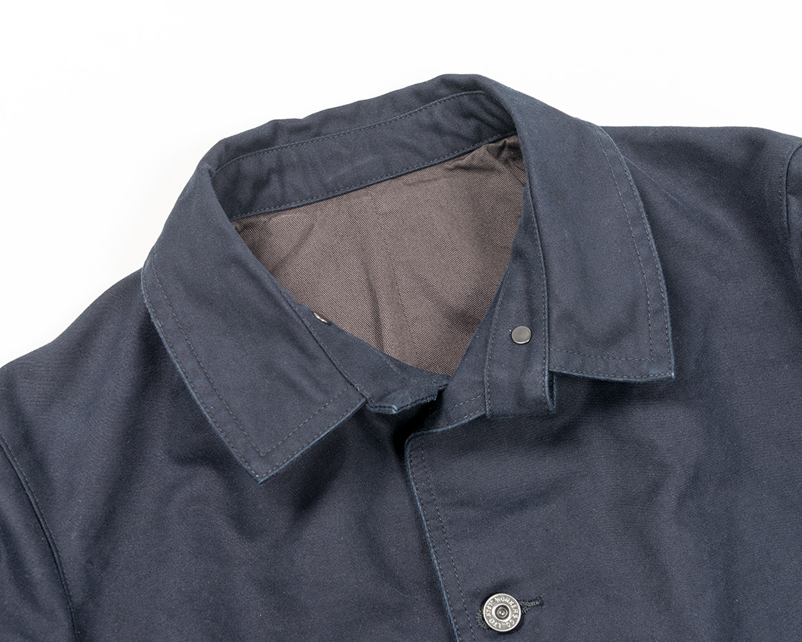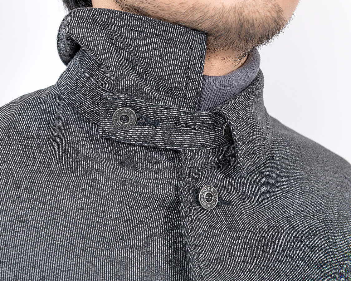 結果としてデザインはカーコートとレイルロードジャケットの合間のようなものになりました。なので、首回りはチンストラップ付きのカバーオール的仕様がもとです。