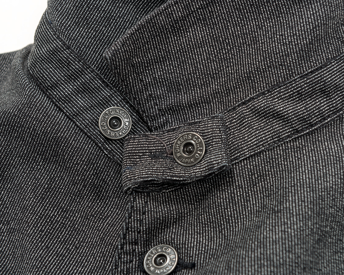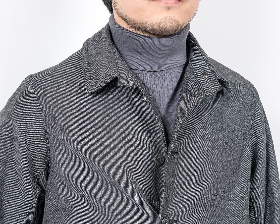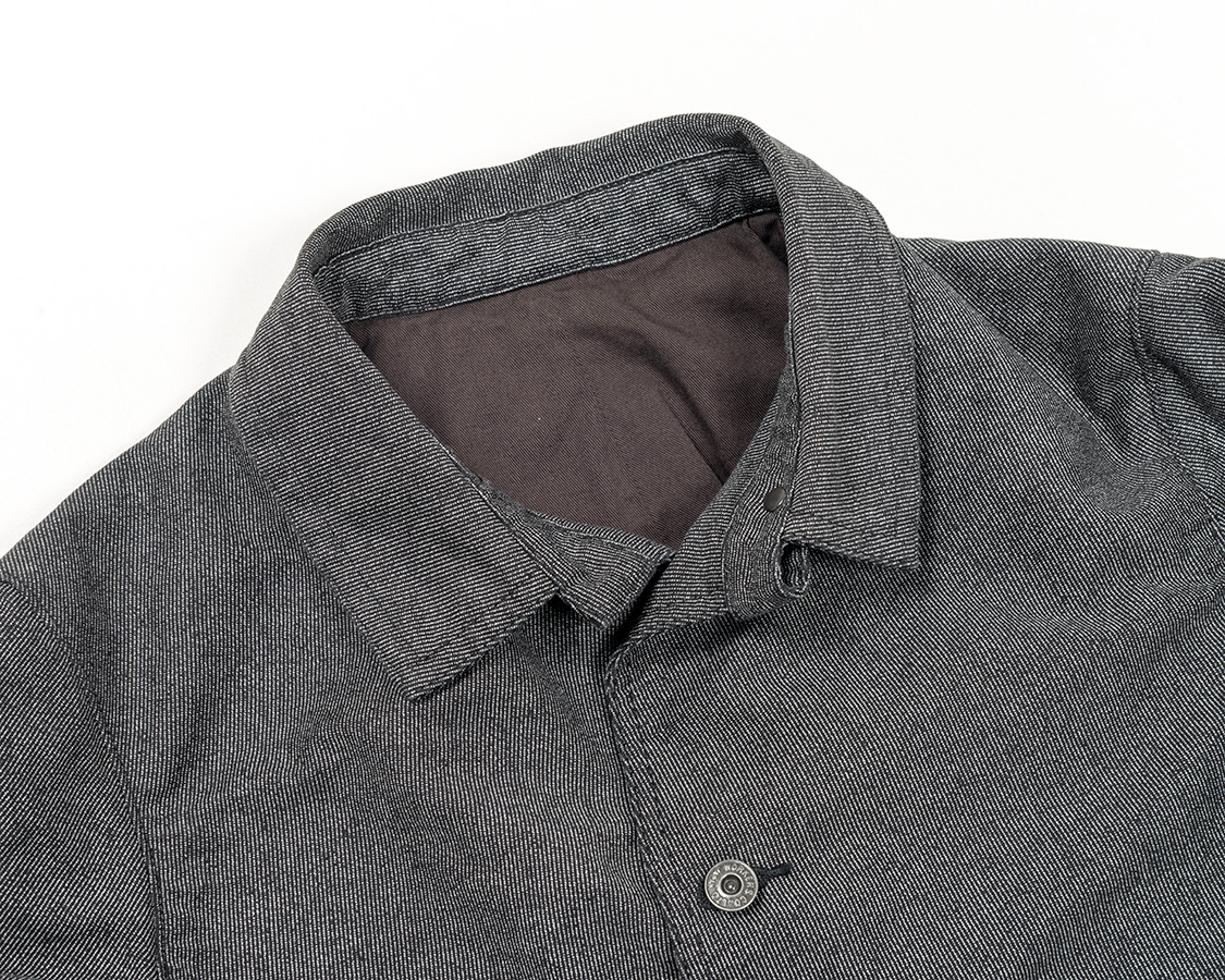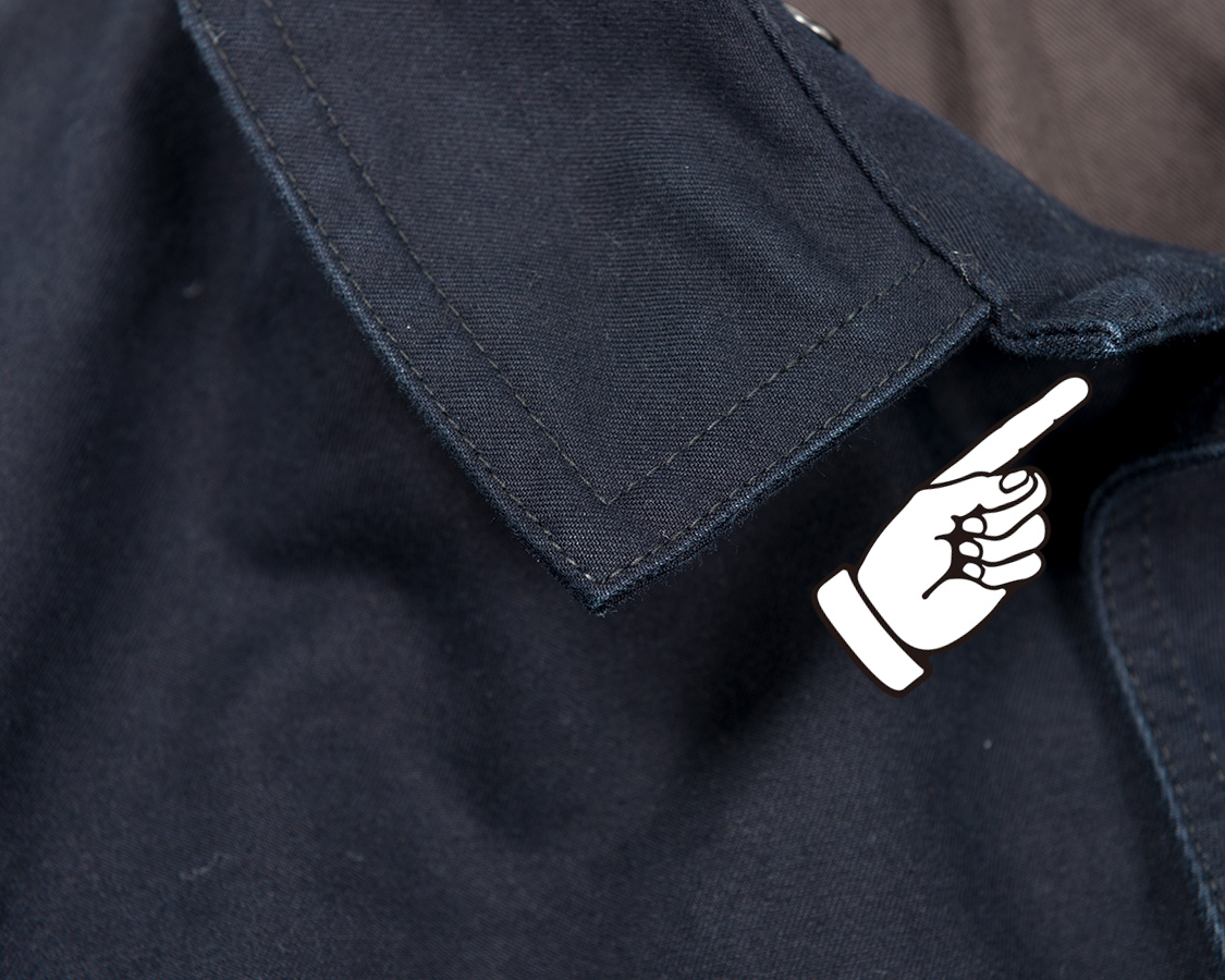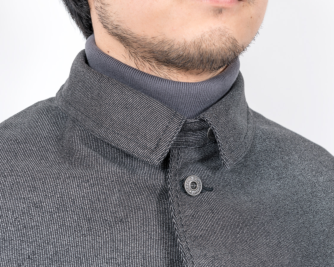 結果としてデザインはカーコートとレイルロードジャケットの合間のようなものになりました。なので、首回りはチンストラップ付きのカバーオール的仕様がもとです。