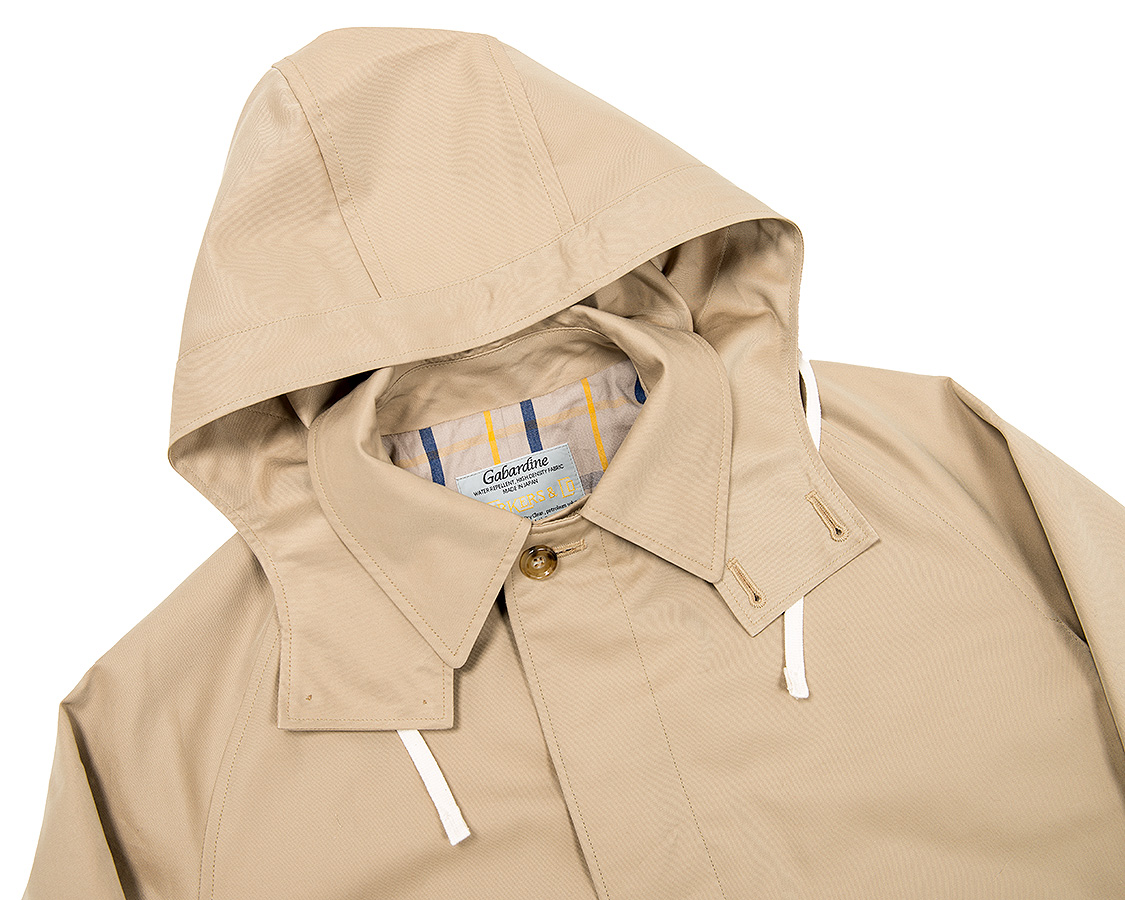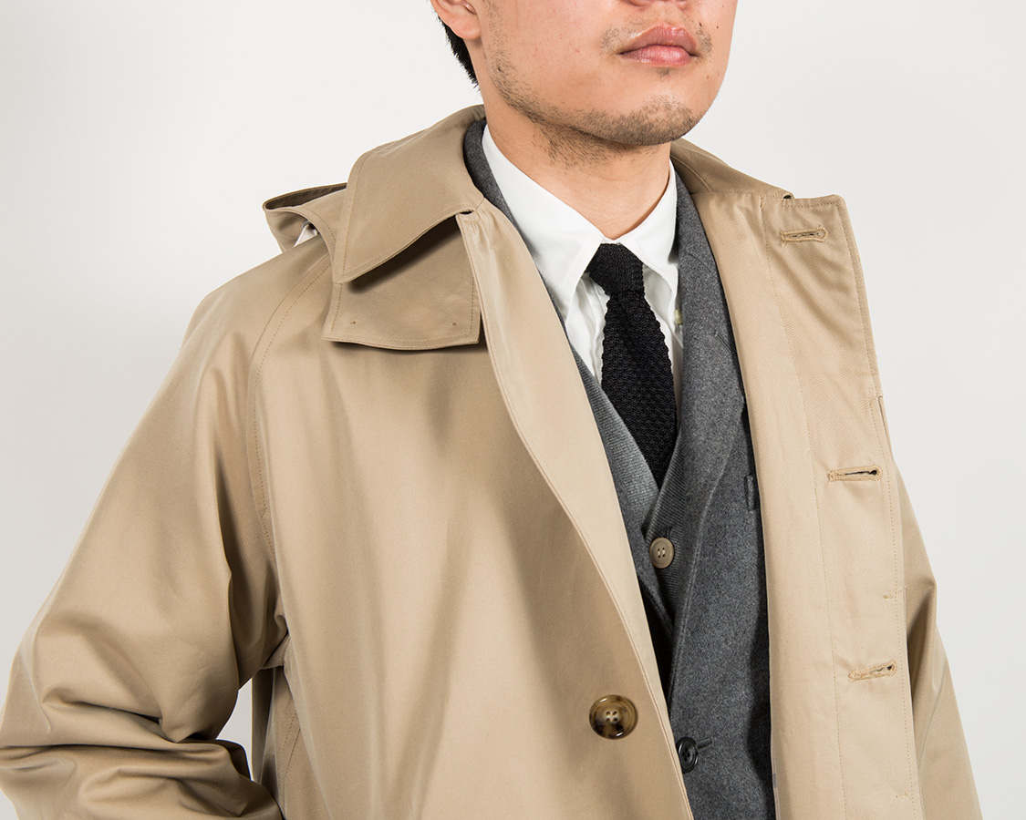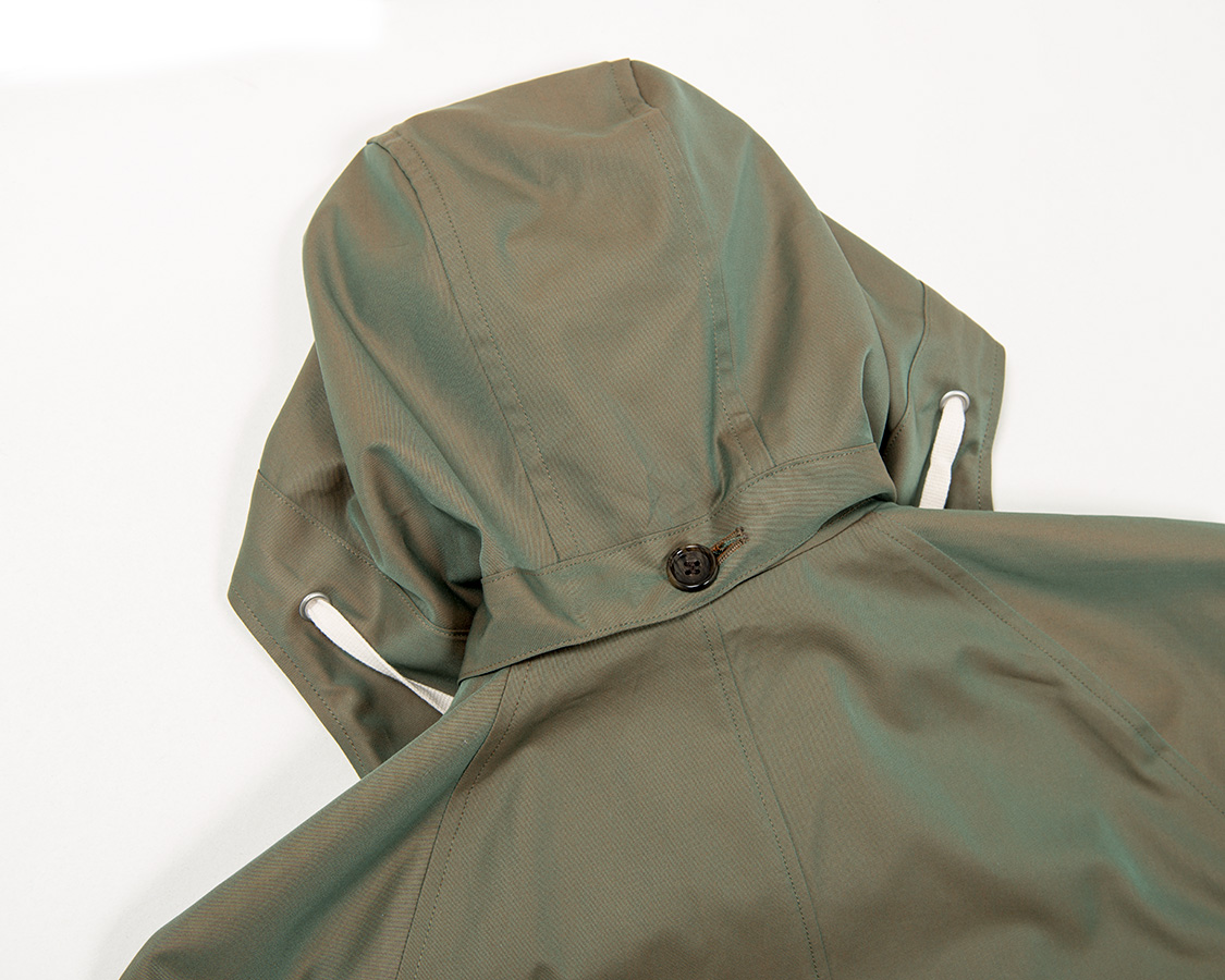 フードはボタンで留めています。取ればごく普通のステンカラーコート(バルカラーコート)として着用できます。
