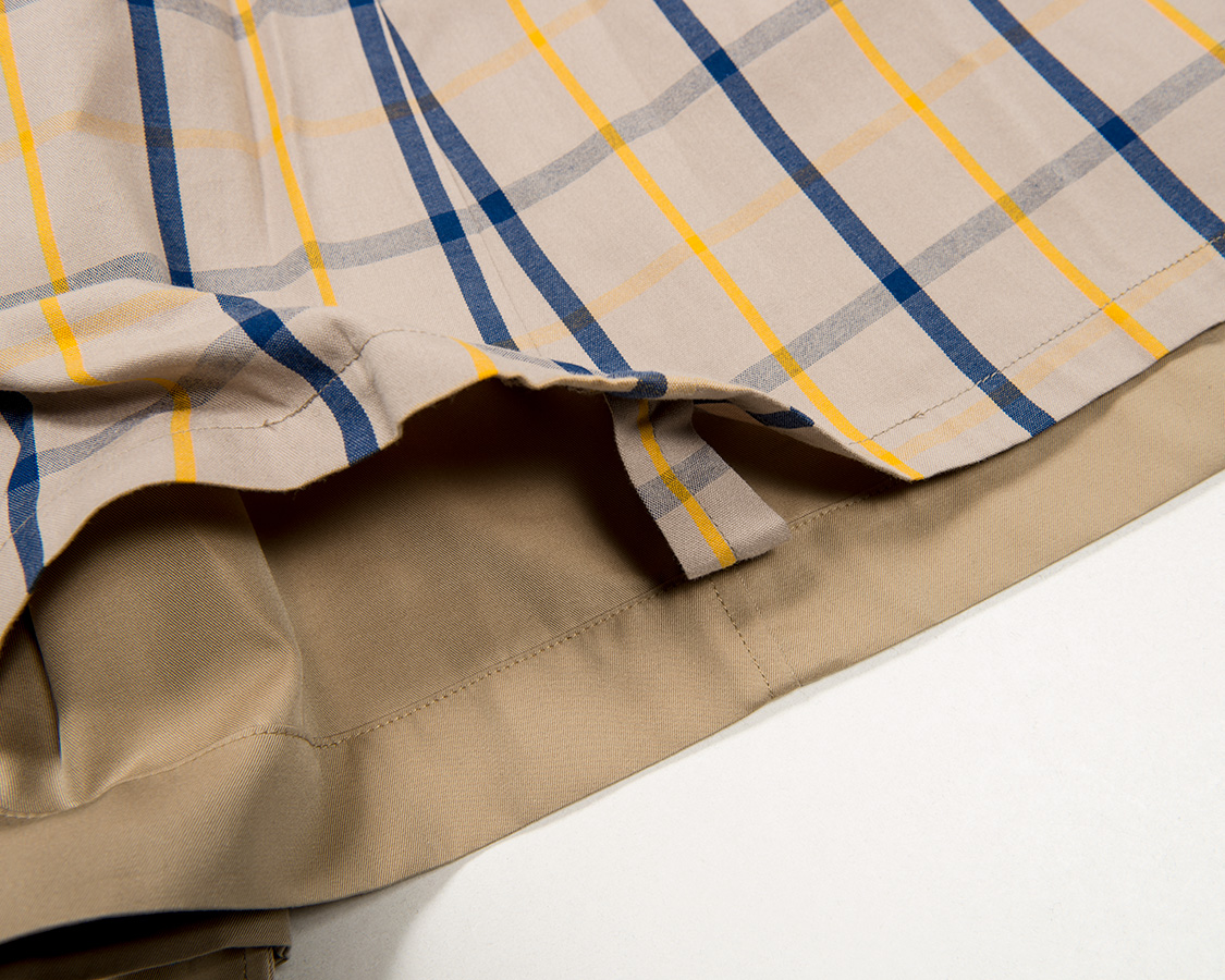 裏地は裾ふらし、表地の裾に縫いこまない仕様。ぶらぶらしないように、数か所テープ状の生地で止めています。