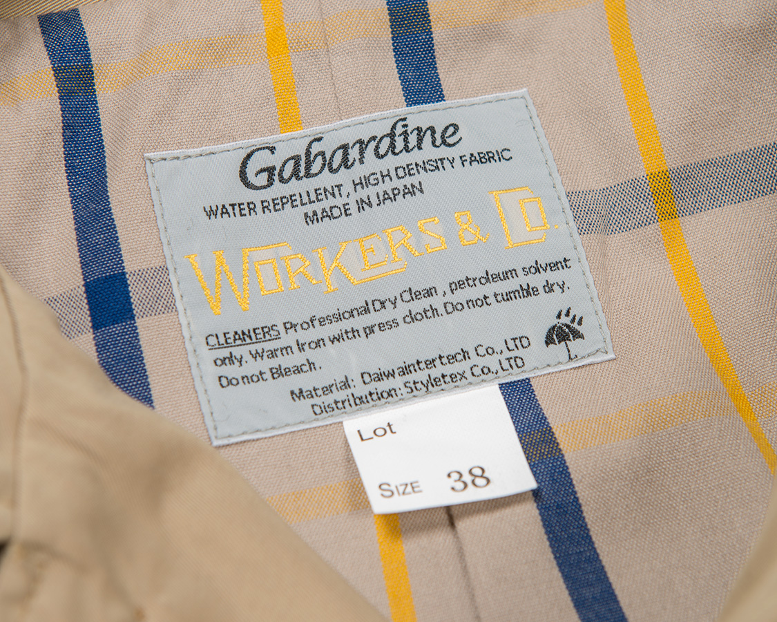 ネームもこのギャバジンに合わせて専用のものを作りました。撥水性がわかりやすいように、傘マーク入り。そしてその撥水性はというと・・・