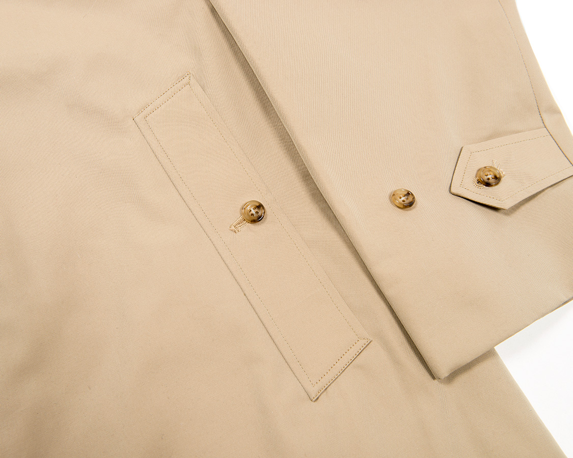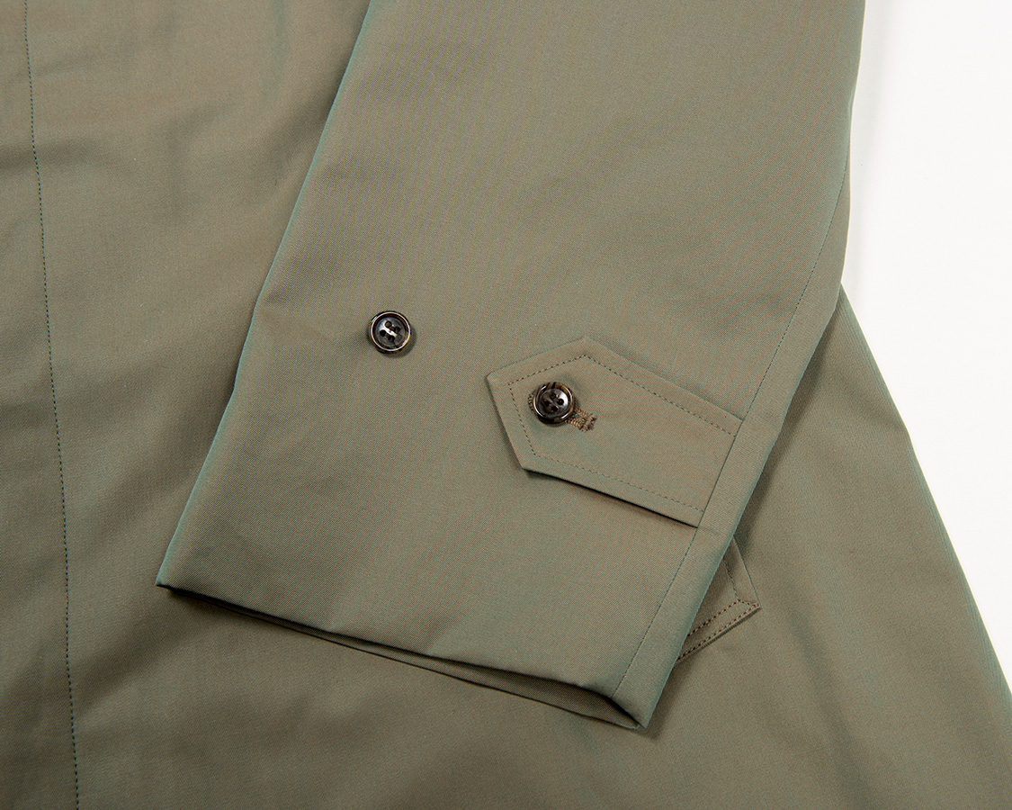 袖口はタブ。ただこれは細部調節というよりは装飾的な意味合いと、このボタン付けで裏地が動くのを止める意味も。裏地まで貫通してボタンをつけています。