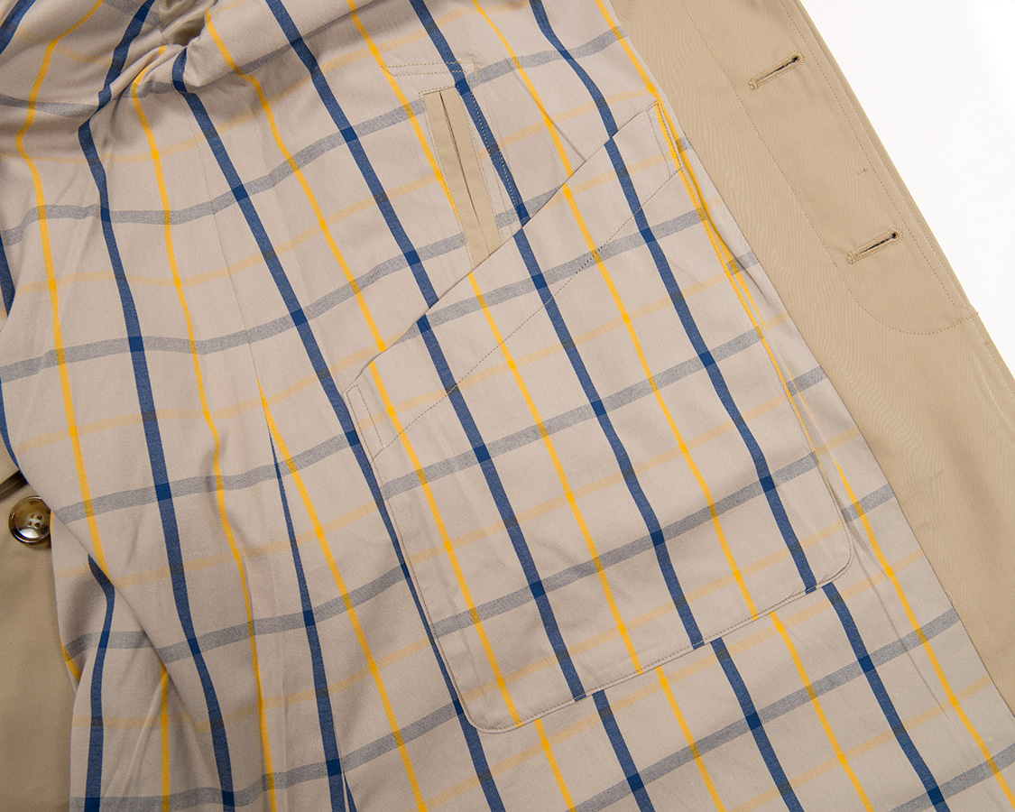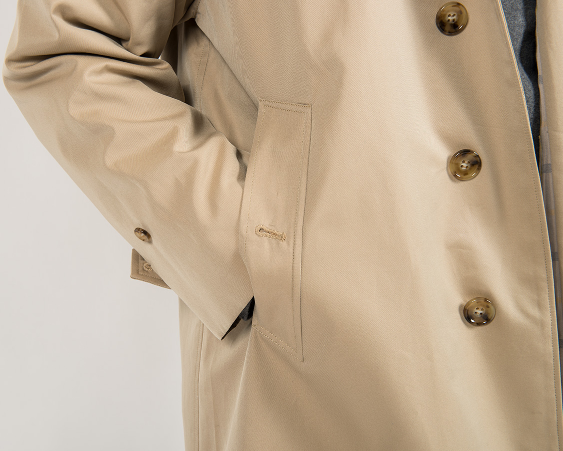 このコートの特徴、貫通した腰ポケット。そのまま下に手を入れると、物を収納できるポケットがあり、少し上方向に手を入れるとコートの中に手が入る。