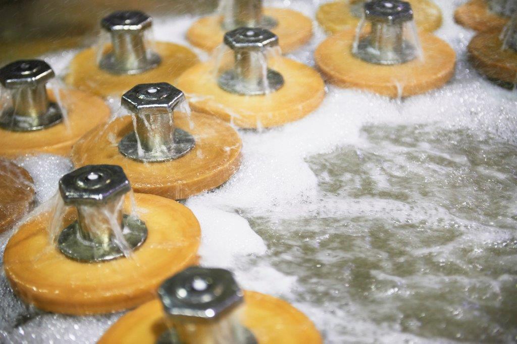 今回、残念ながら染の工程は、工場が設備改修で見られませんでした。が、染はいわゆり「チーズ染」で、チーズのようにソフト巻きした糸をカマの中に入れて染めます。