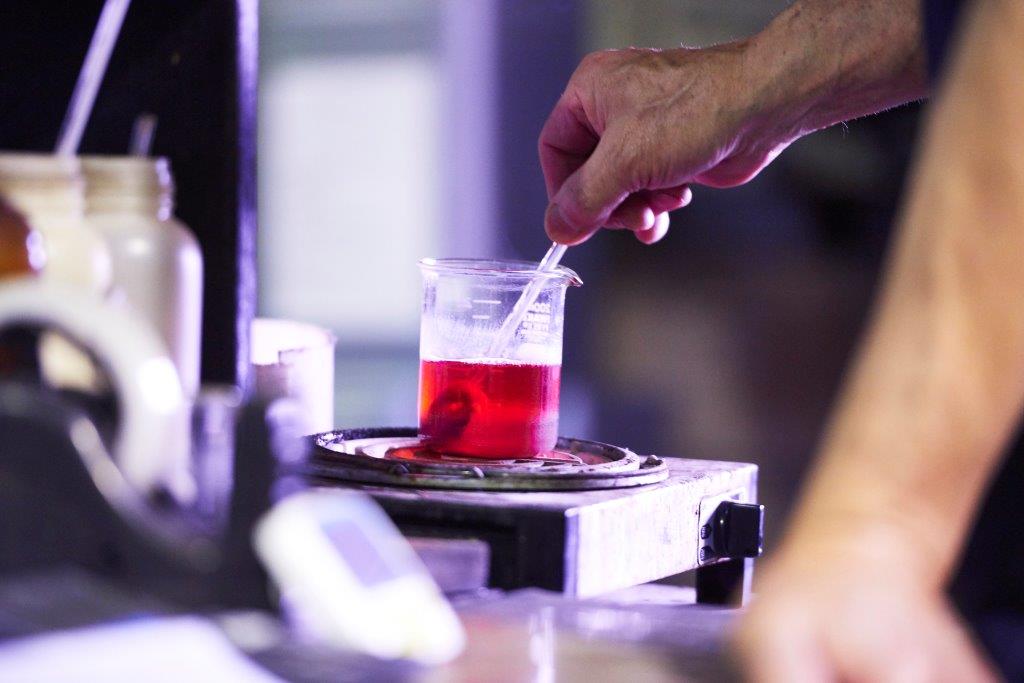 このギャバジン工場の得意なところは、濃い色を硫化で染めていること。我々、西に居るものの常識としては「硫化は堅牢度が悪い、色が落ちやすい」なのですが、ギャバジン工場では長年、大手コートメーカーの要求する堅牢度を実現するにはどうしたらよいか研究の結果、濃い色は硫化で、薄い色はスレンで染めるという結論に達したそうです。