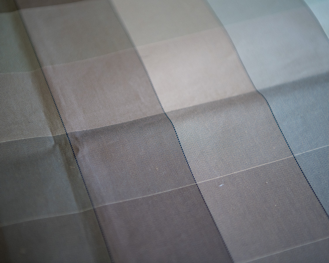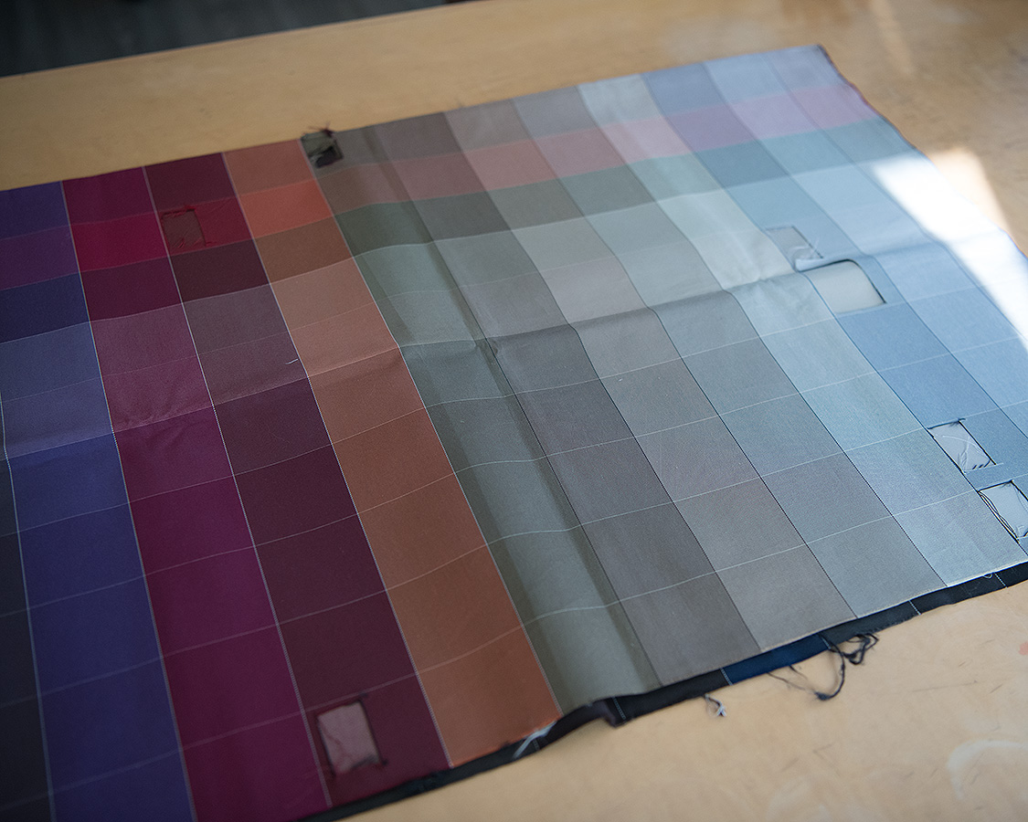 生地の作り方、白生地を作って染める生地染、糸を染めてから織る糸染がありますが(厳密にはワタで染めるトップ染もあります)、今回の生地は糸染。その理由は、先ほどの堅牢度をクリアするためが一つ。もう一つは、色の微妙なトーンを作れることにあります。