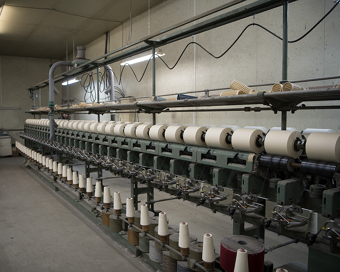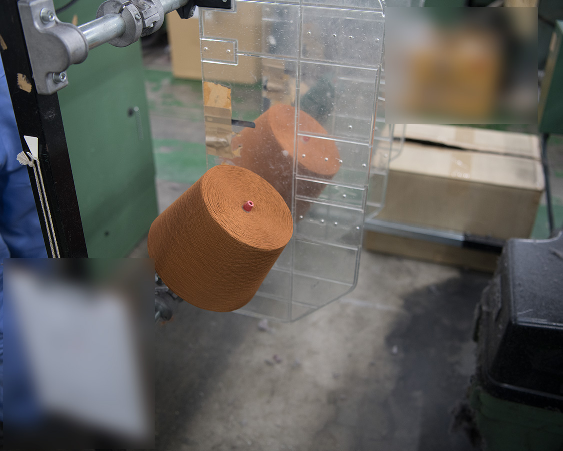 さっそく、糸をまき直している作業から。まず、紡績工場から出荷された糸、これを染める為にまき直しをしています。下が紡績工場から出てきたもの、上がそれをまき直しているところ。ソフト巻きと呼ばれる、柔らかな巻きにして染の工程へ行きます。