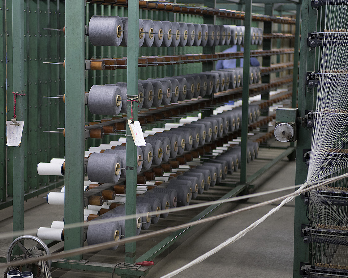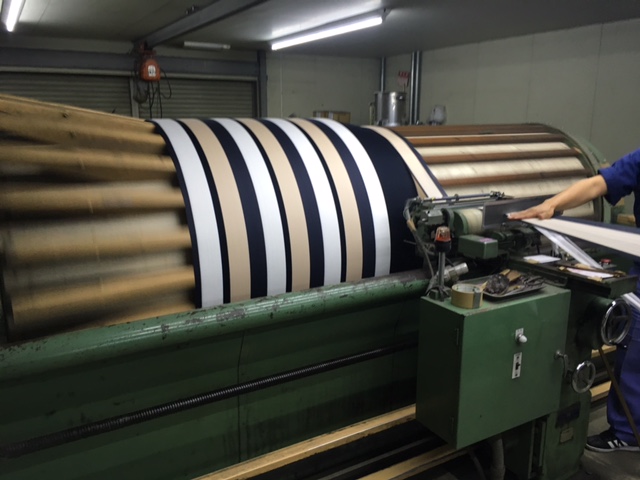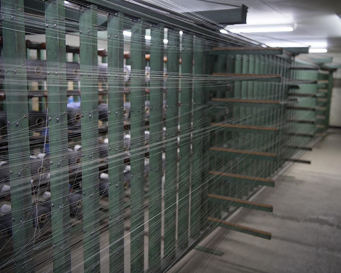 染まった糸は再び織布工場へ。ここで、整経へ。整える、経(タテ)で、タテ糸を織機にかかるよう、ビームと呼ばれる棒に巻き付けていく作業です。恐ろしいのがその本数。細い糸で超高密度に織るため、約150センチの生地幅にするには10000本ほどの糸をビームに巻いていきます。
