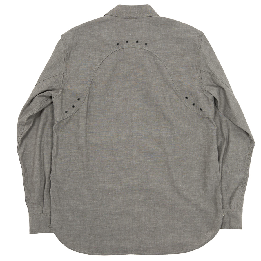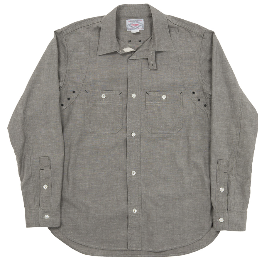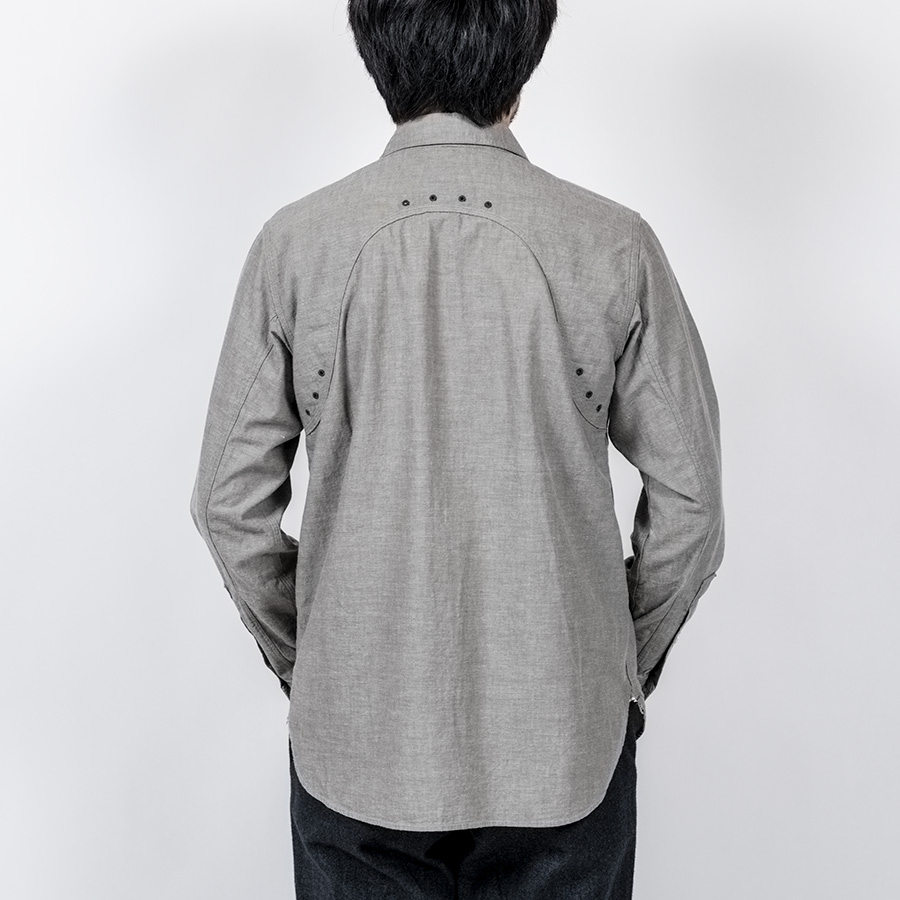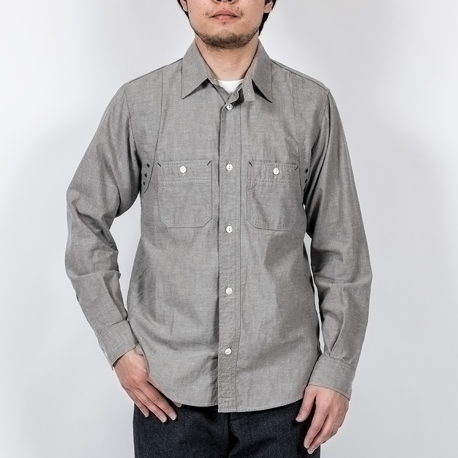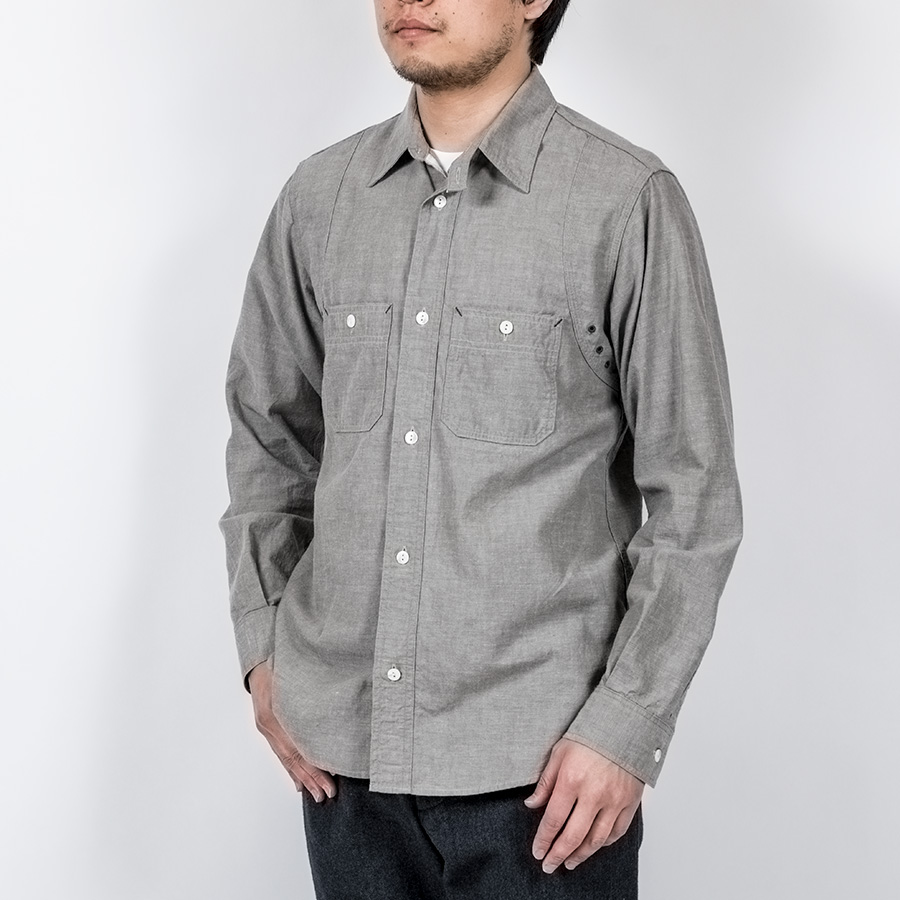 デザインは、フロント・バックに補強布をトリプルステッチで縫いつけ、空気穴が多数開けられています。補強、空気穴 といった機能性がワークシャツらしいデザインに昇華している好例。 素材はすべて耳付き、狭幅のシャンブレーにこだわりました。せっかくクラシックな形なので素材もクラシックに。