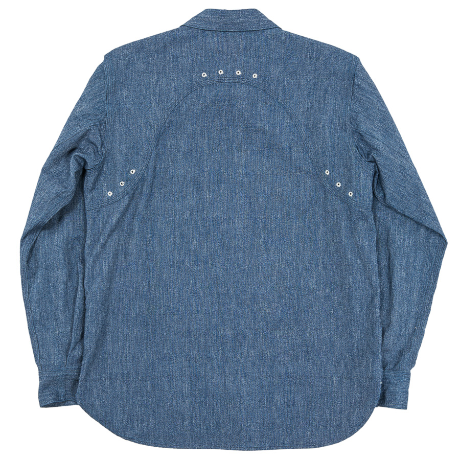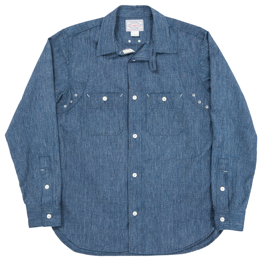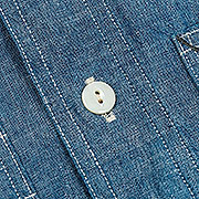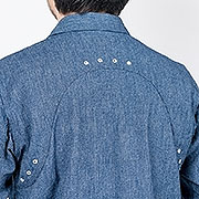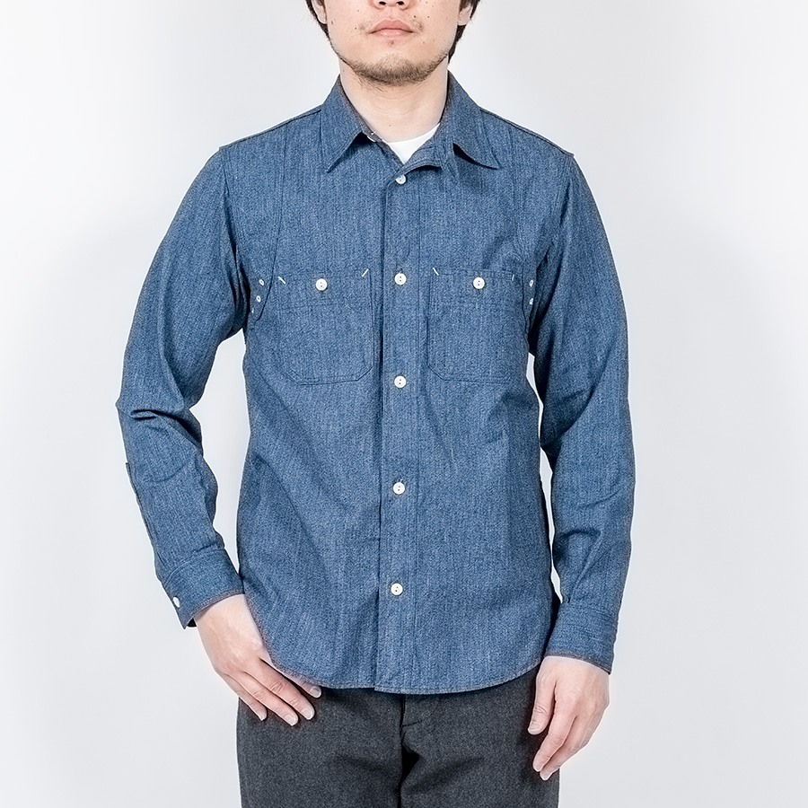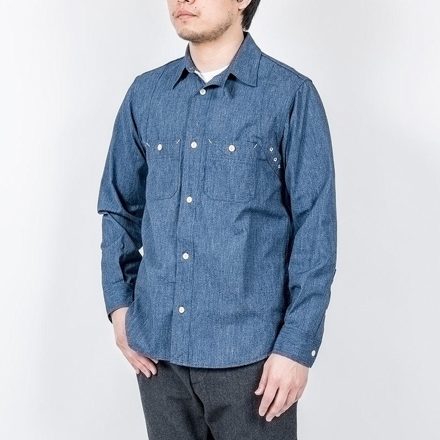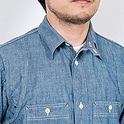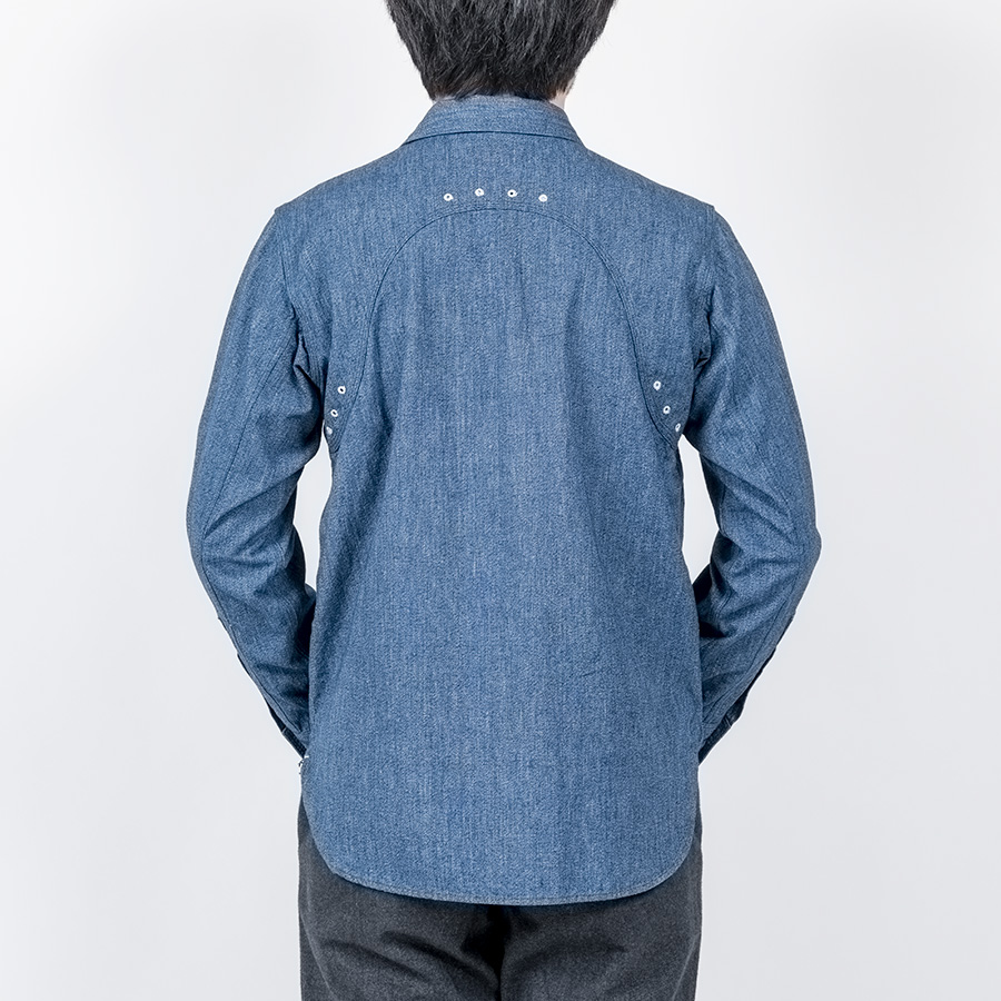 デザインは、フロント・バックに補強布をトリプルステッチで縫いつけ、空気穴が多数開けられています。補強、空気穴 といった機能性がワークシャツらしいデザインに昇華している好例。 素材はすべて耳付き、狭幅のシャンブレーにこだわりました。せっかくクラシックな形なので素材もクラシックに。