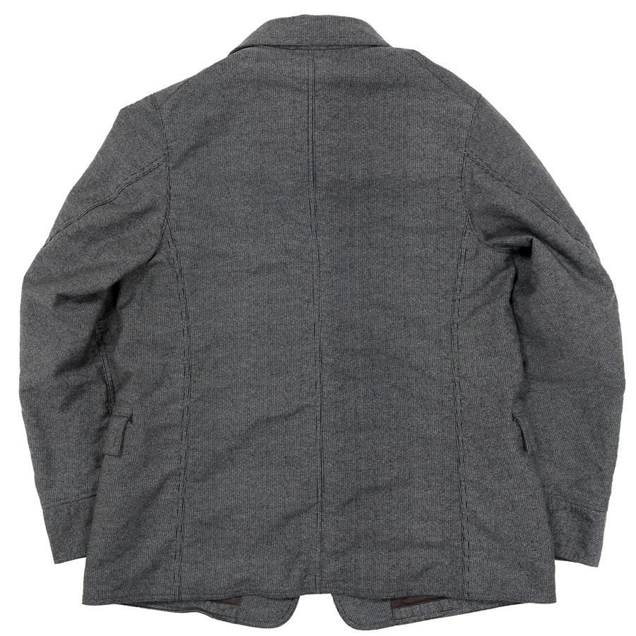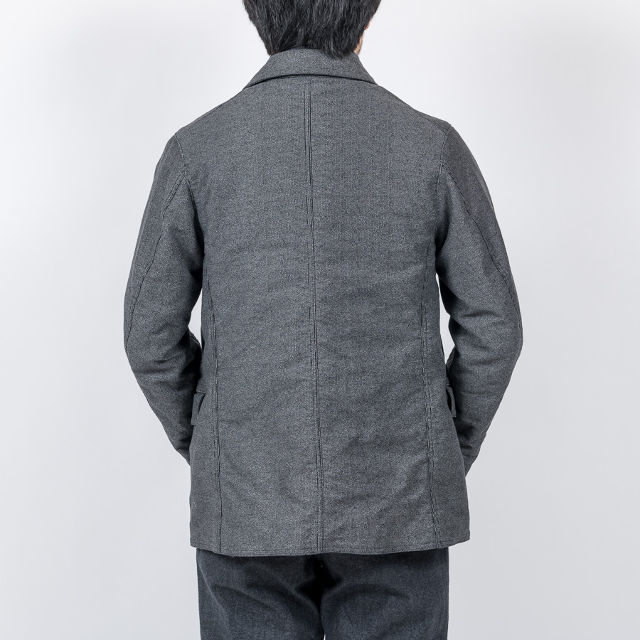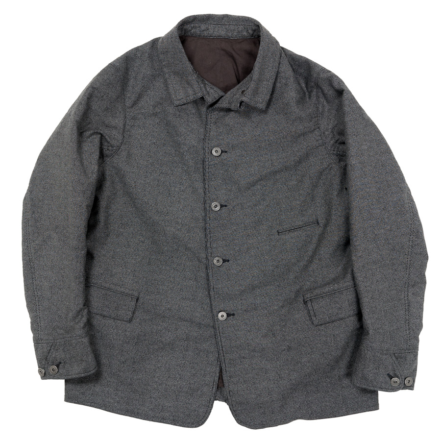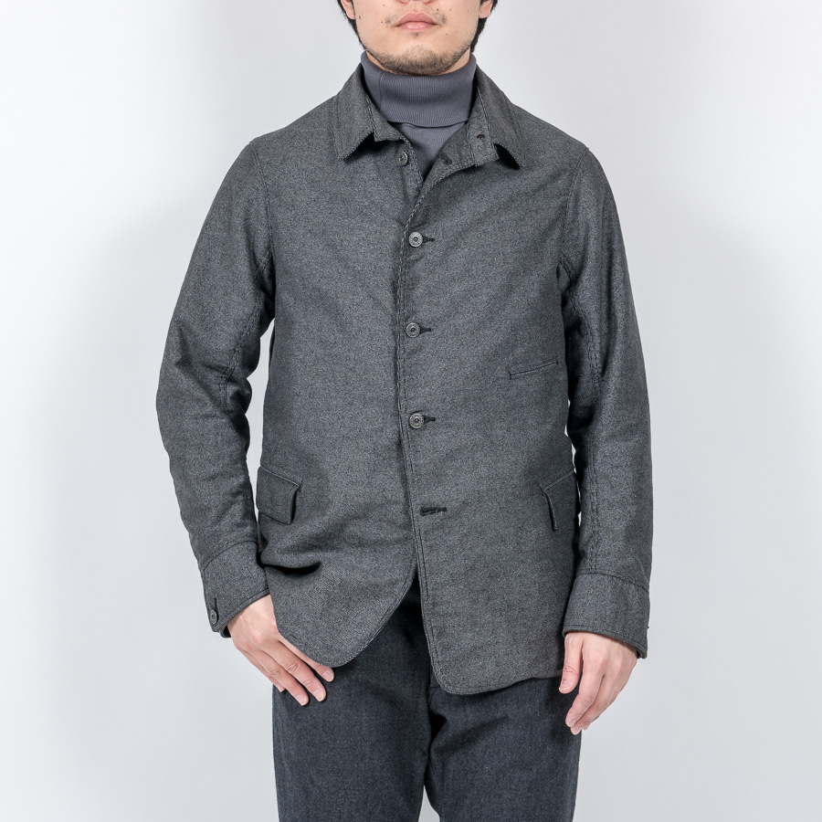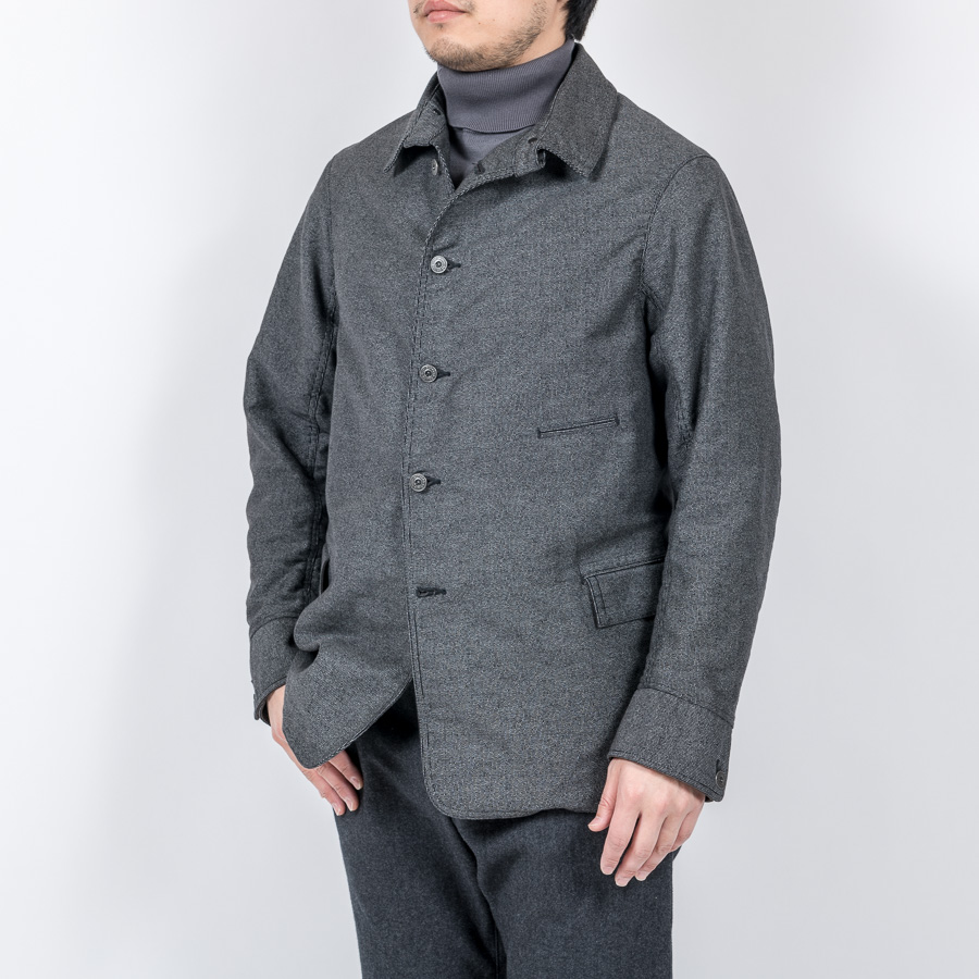 カバーオール(レイルロードジャケット)的な全体のシルエットや台襟・羽襟、スポーツジャケット的カフス、テーラードジャケット的のダブルステッチや内ポケット、そしてカーコート的なチェンジポケットと、さまざまな上着の仕様を取り込んだジャケットになっています。結果、ドレス、ワーク、そしてカジュアルにと、非常に合わせやすい何とも言えないジャケットにデザインできたものです。