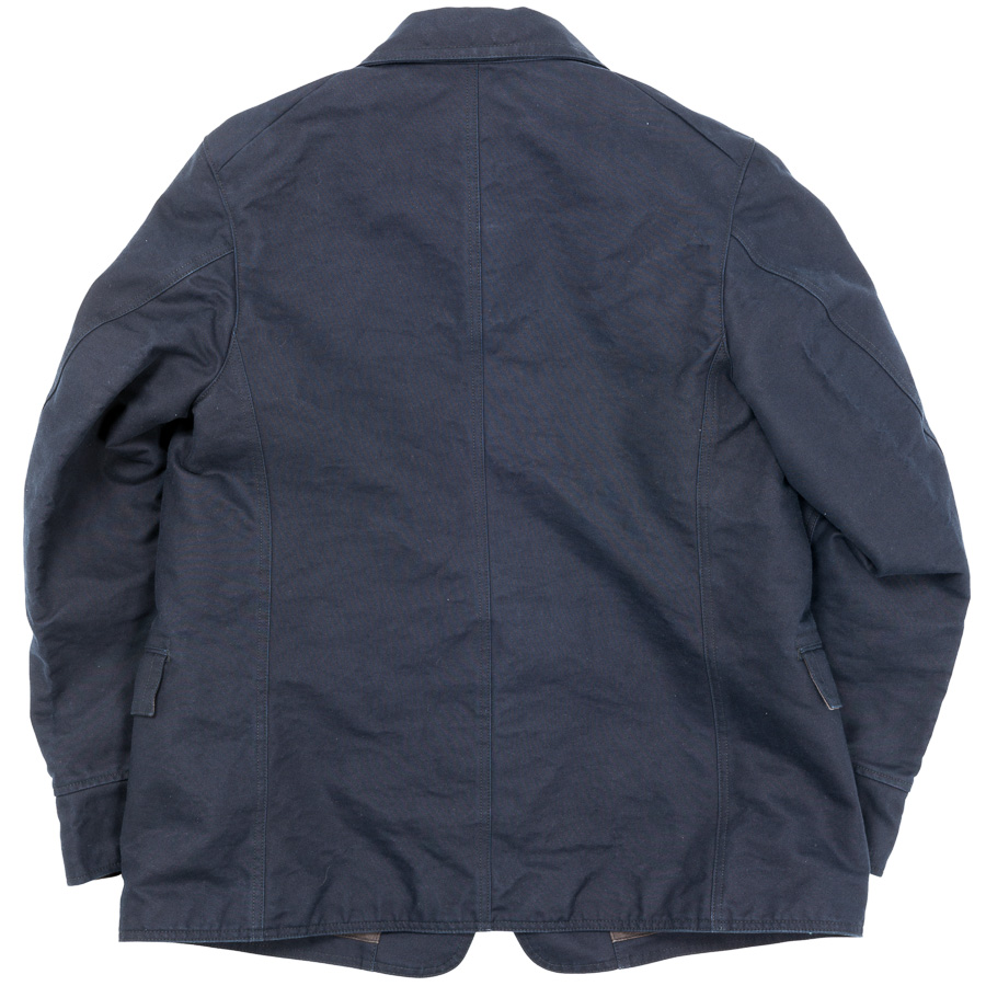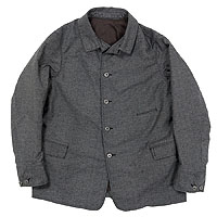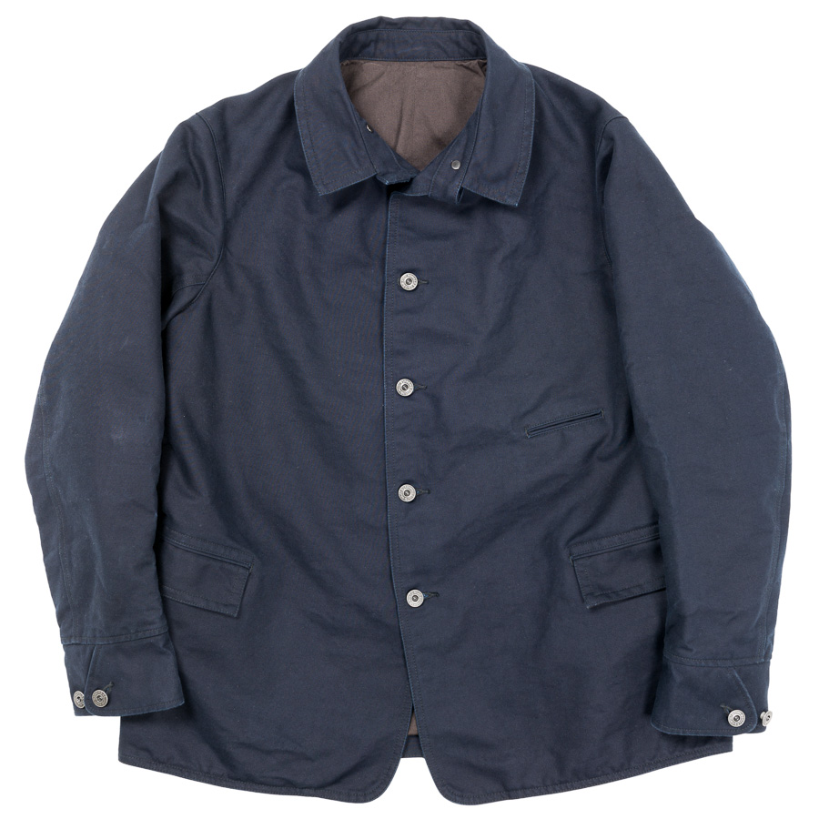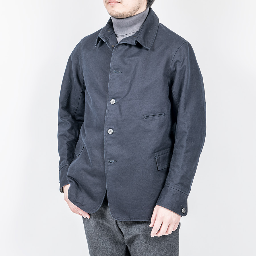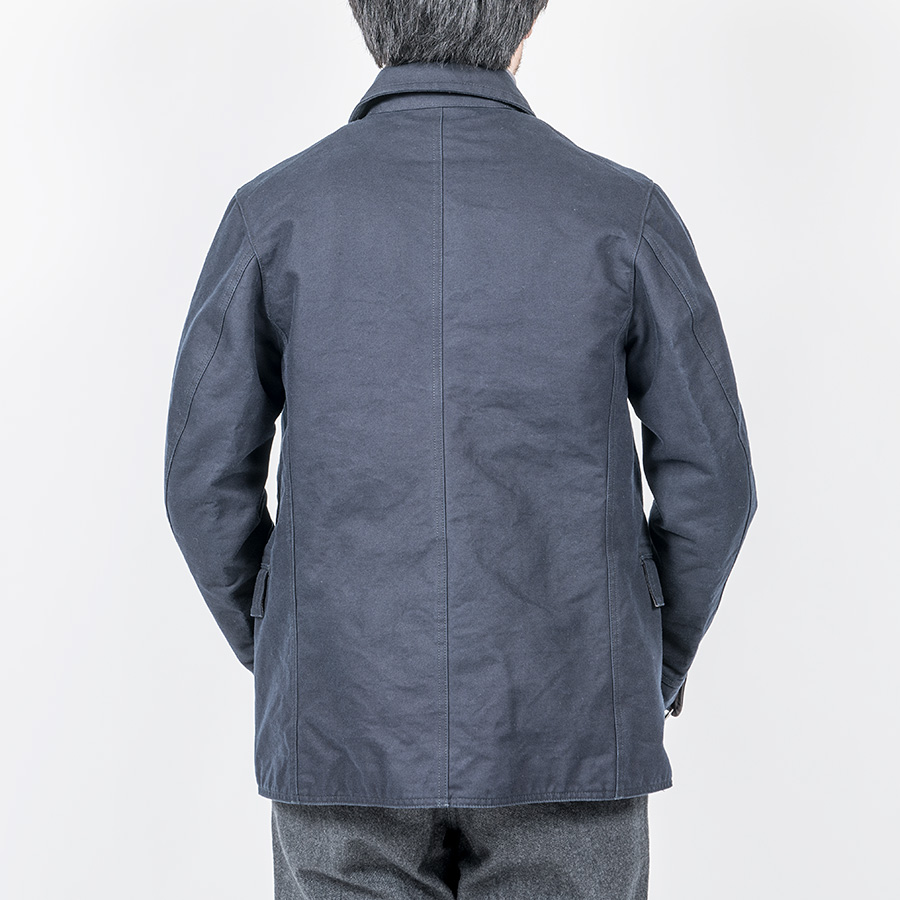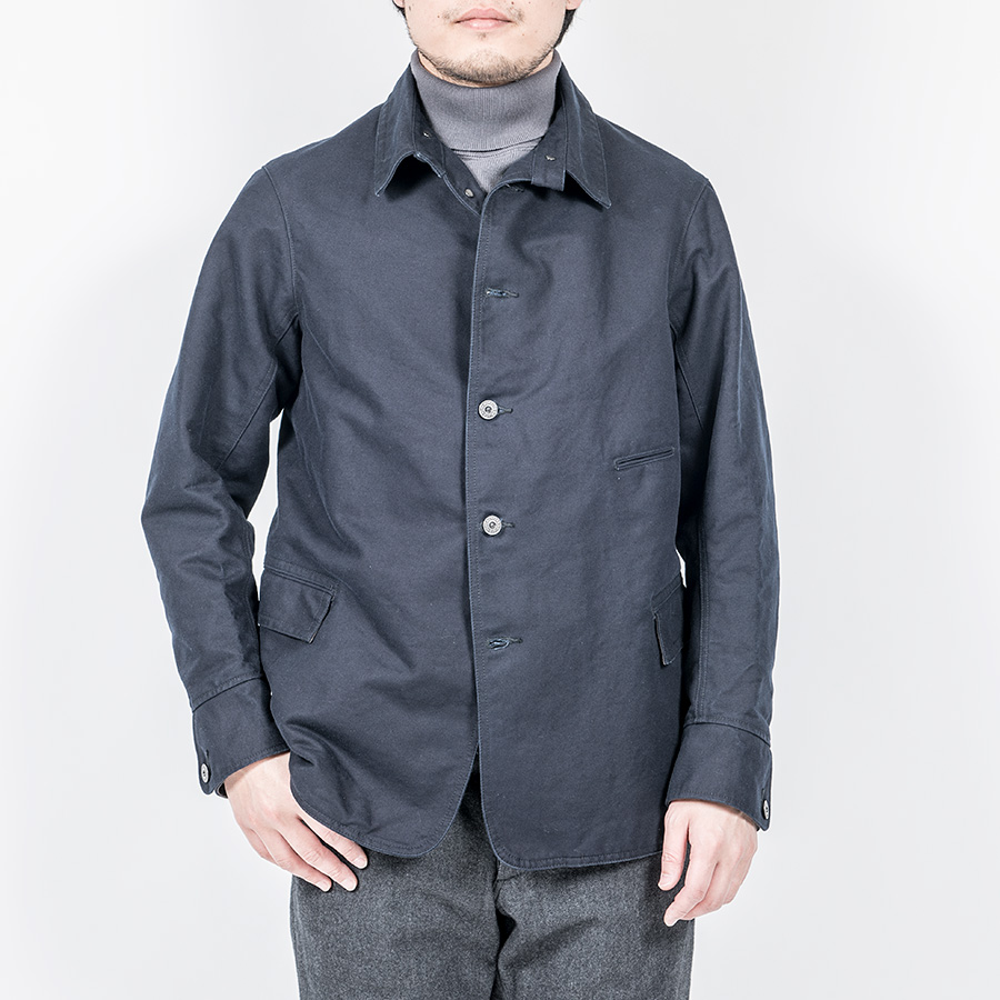 カバーオール(レイルロードジャケット)的な全体のシルエットや台襟・羽襟、スポーツジャケット的カフス、テーラードジャケット的のダブルステッチや内ポケット、そしてカーコート的なチェンジポケットと、さまざまな上着の仕様を取り込んだジャケットになっています。結果、ドレス、ワーク、そしてカジュアルにと、非常に合わせやすい何とも言えないジャケットにデザインできたものです。