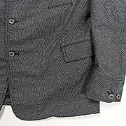 もとは16FW で作ったFCD Jacket。フレンチと思しきコーデュロイジャケット、このオリジナルを解体しトレースしたパターン。身頃はゆったり、袖も太い。一番特徴的なのがフロントの大きく湾曲した部分。前を合わせてしまうとそれほ どわからないのですが、ボタンの位置もまっすぐではない、独特な形状をしています。これが結果として、着た時に身頃 に立体的なゆとり、シルエットを生んでいます。