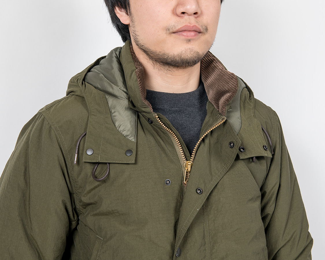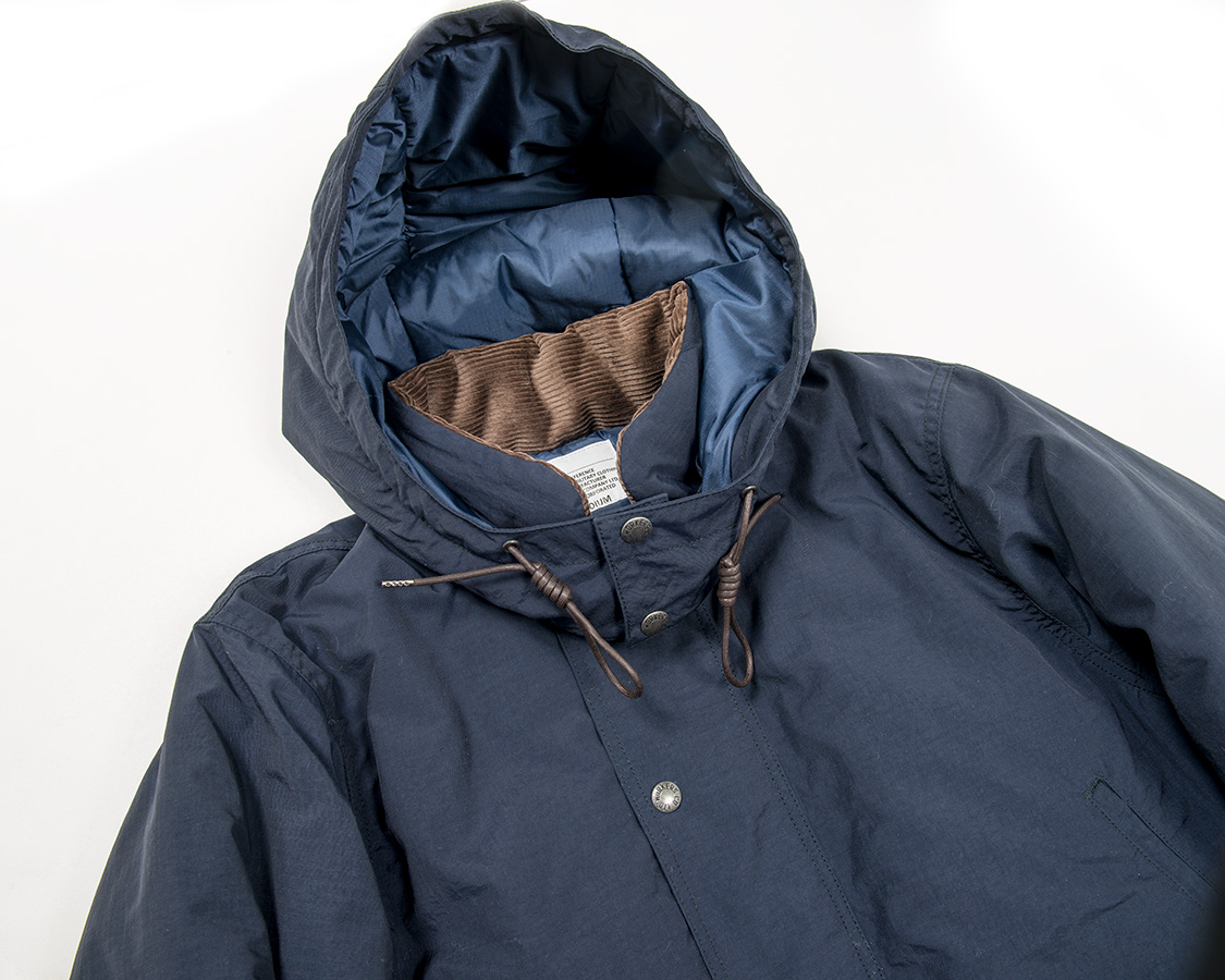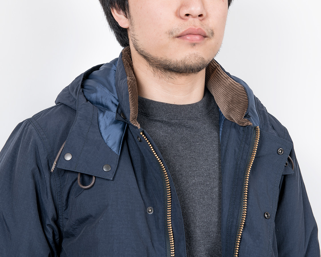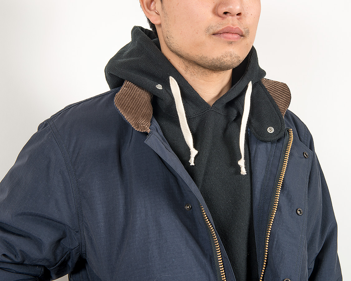 首回りはスタンドカラー+フード。襟にはコーデュロイを張っているので、セーターの上のように、首が直接触れても肌触りが良い。