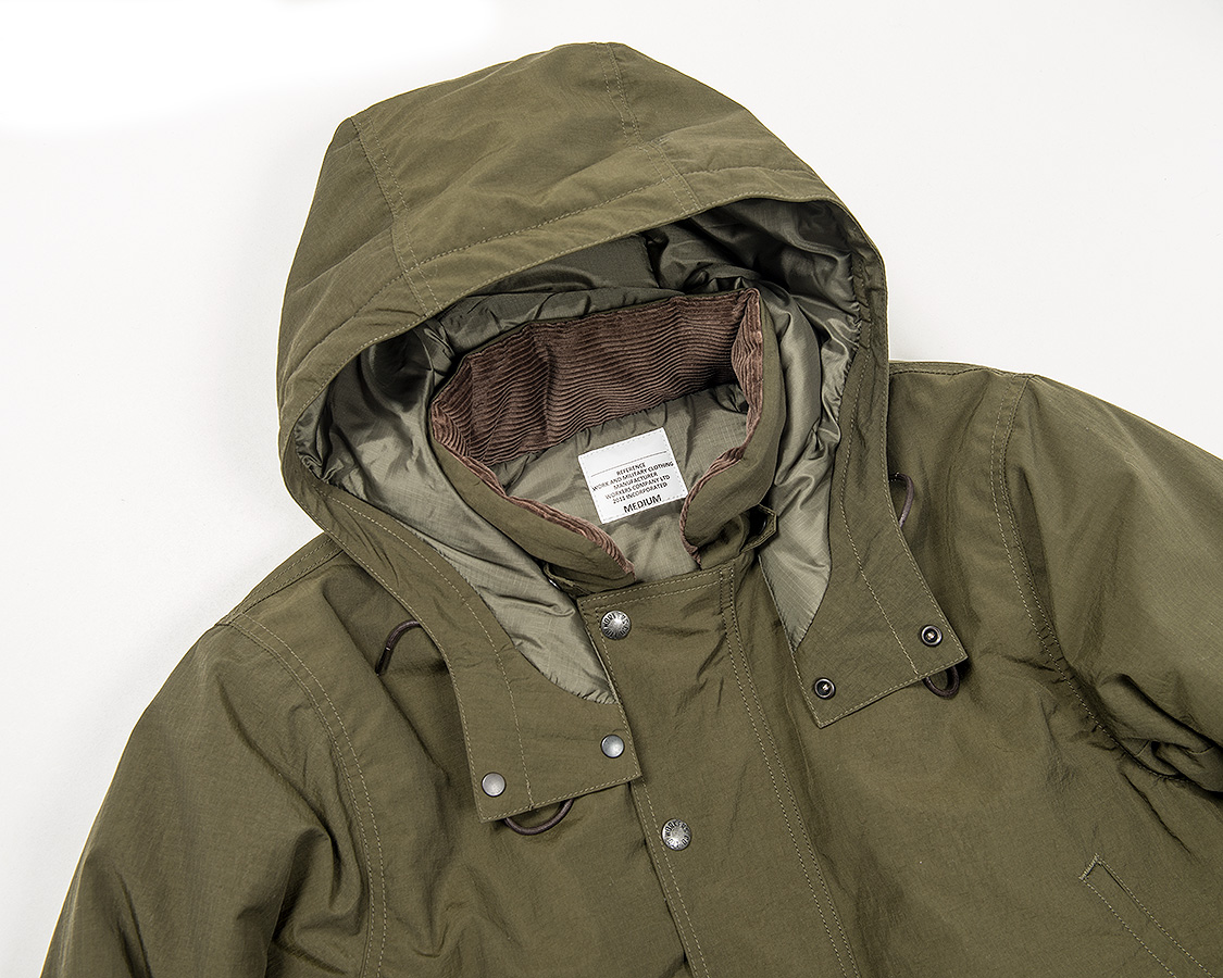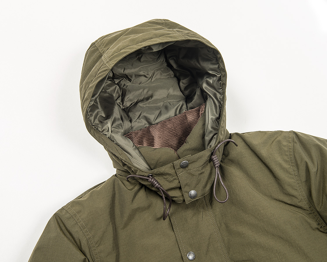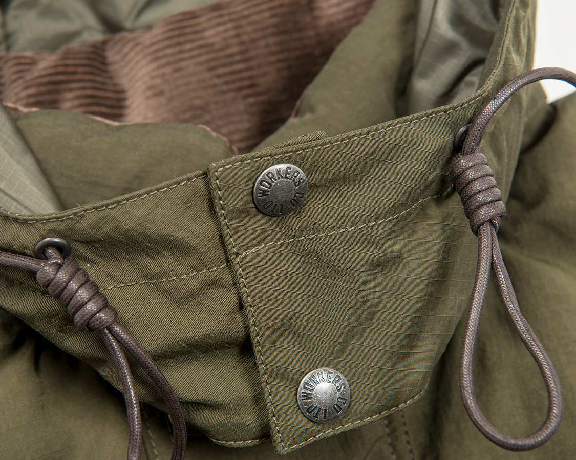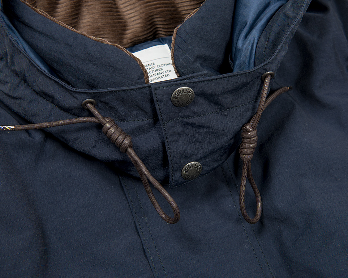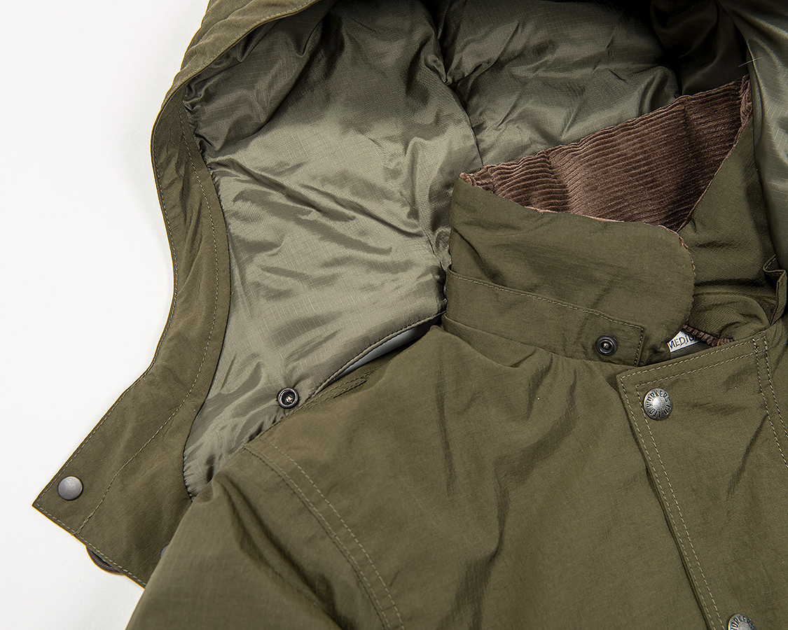 首回りはスタンドカラー+フード。襟にはコーデュロイを張っているので、セーターの上のように、首が直接触れても肌触りが良い。