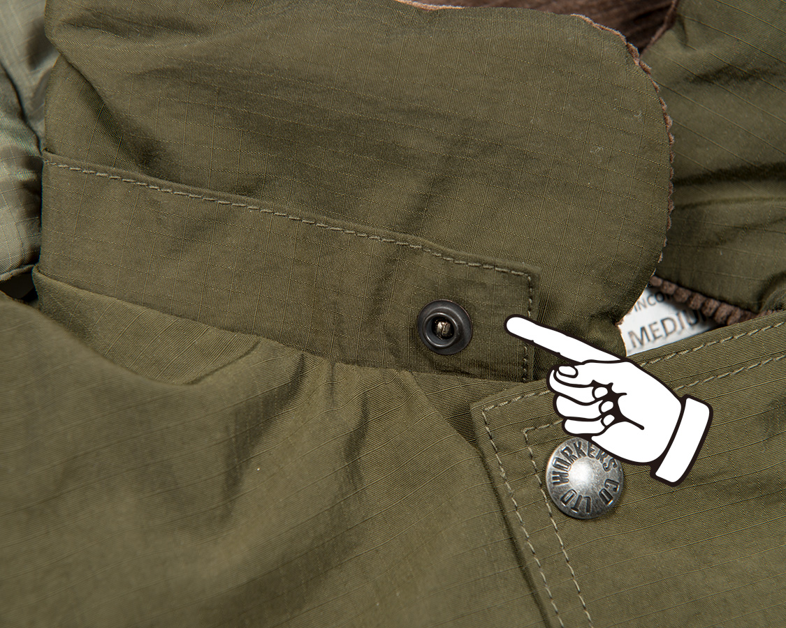 とても地味で、でも強力な効果があるパーツ。襟の外側に縫いこまれたスナップをつける土台。わたしは「ショックアブソーバー」と呼んでいるのですが、フードが引っ張られたときに、ある程度この布が動くことでスナップに直接強い力がかかるのを抑えてくれる。つまり、簡単に脱着フードが取れないようにしてくれる役割があります。