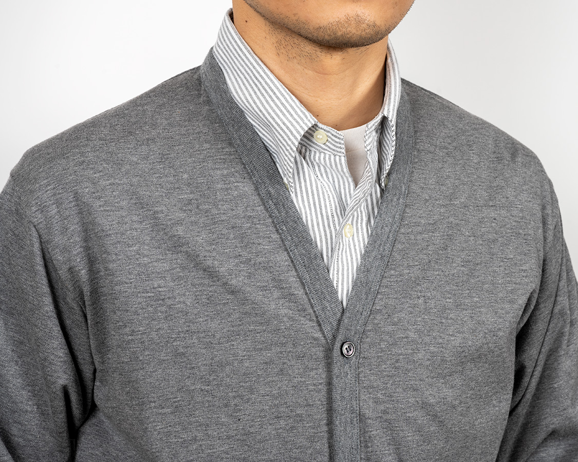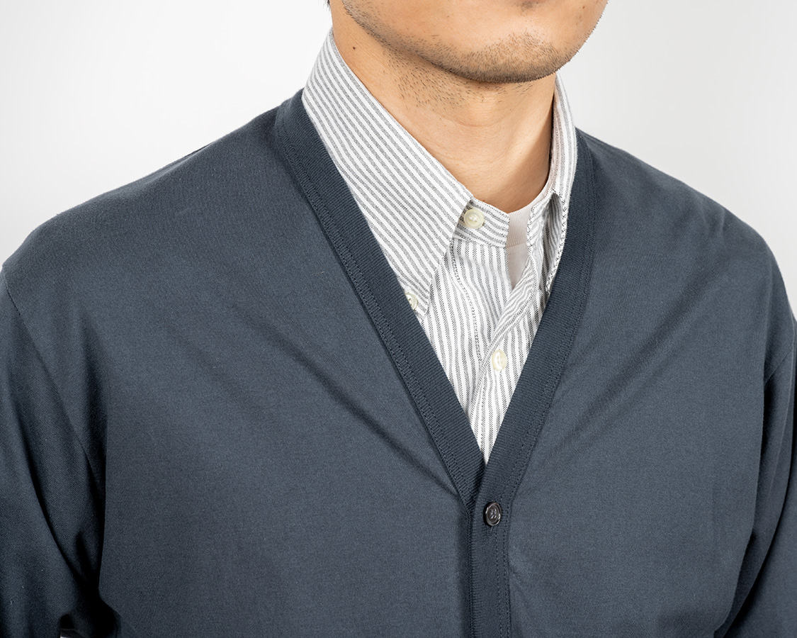 あえてネクタイ無しでシャツと合わせてみました。現実にはこういう着方が多いと思います。深すぎず、浅すぎずのV。身頃の第一ボタンから少し下がった位置にVが来ます。