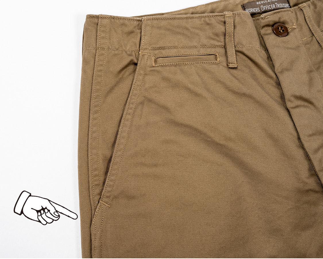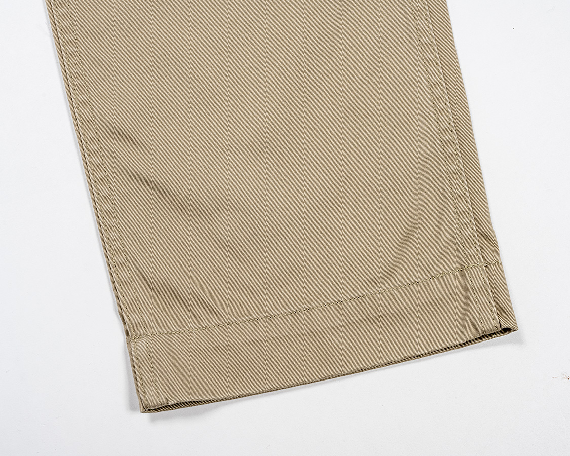 あえての小股ダブルステッチ。ビンテージのチノパン、ここが地縫い一本が多いのですが、中にはこんな風にダブルステッチの物もあります。強度考えるとダブルステッチのほうがベターなので、あえてのダブルステッチにしています。地縫い+棒シックもあれはあれで良いのですが。