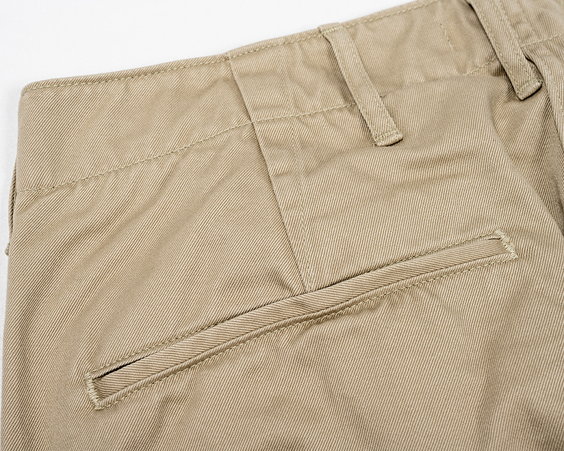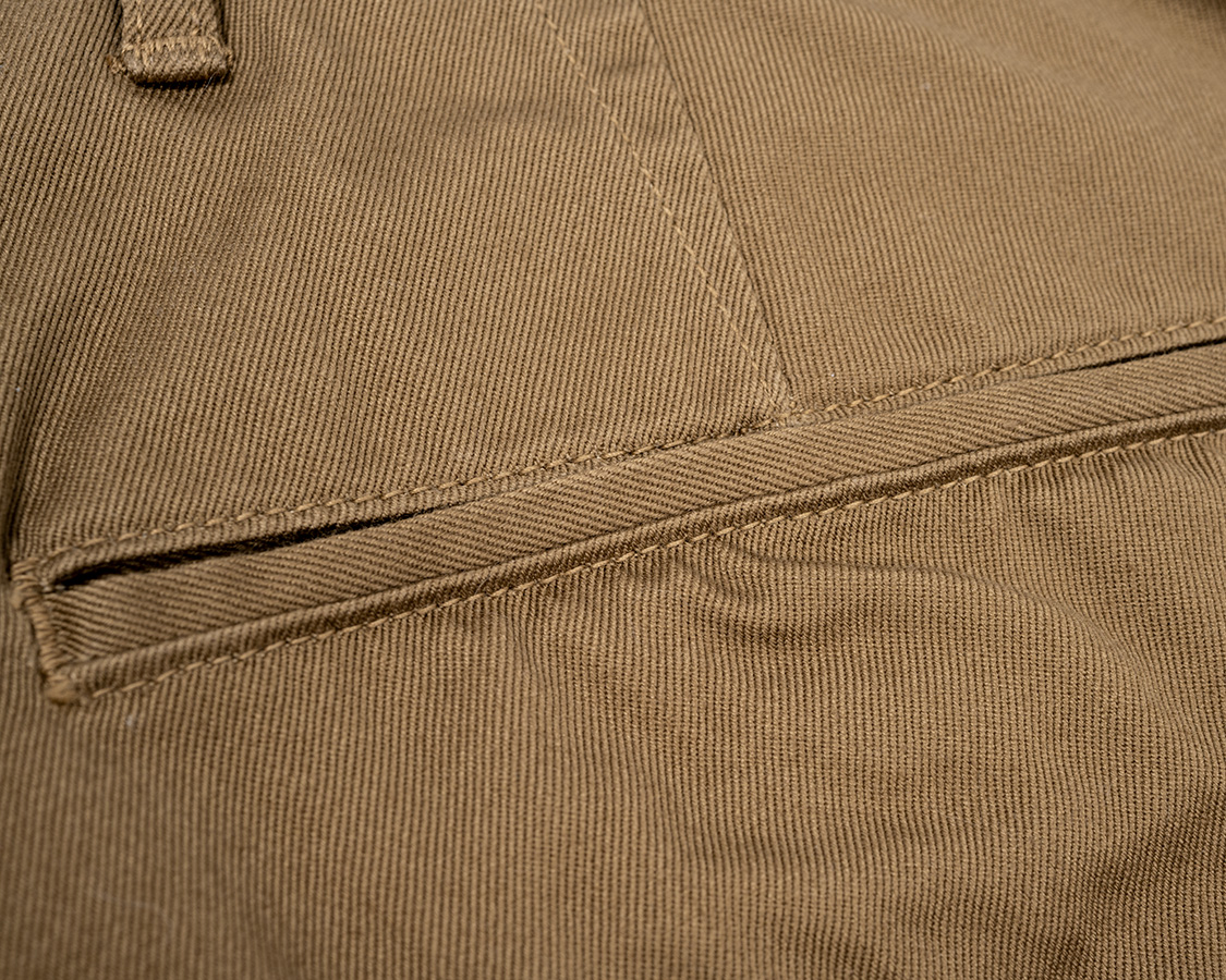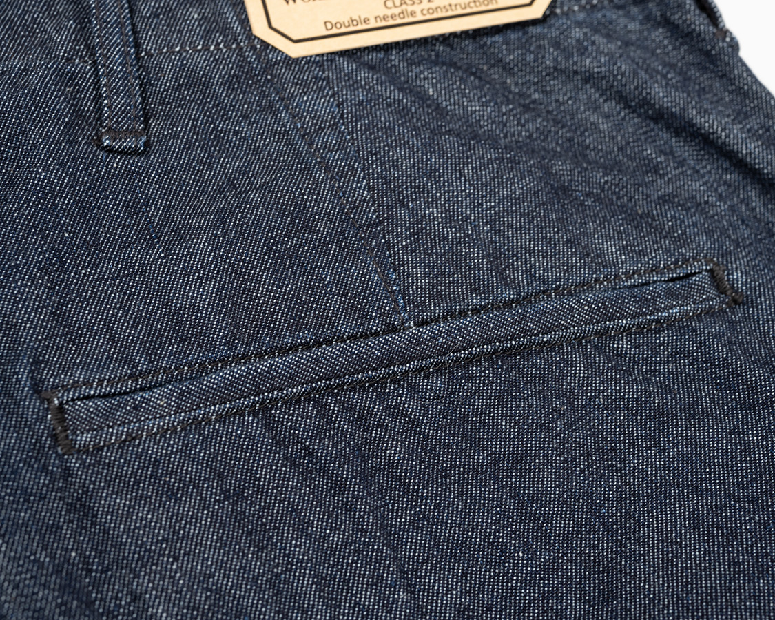 6ミリほどの細玉縁。ダーツにかかるように玉縁を切り、生地自体も10オンスクラスで厚いので玉縁がゆがみます。