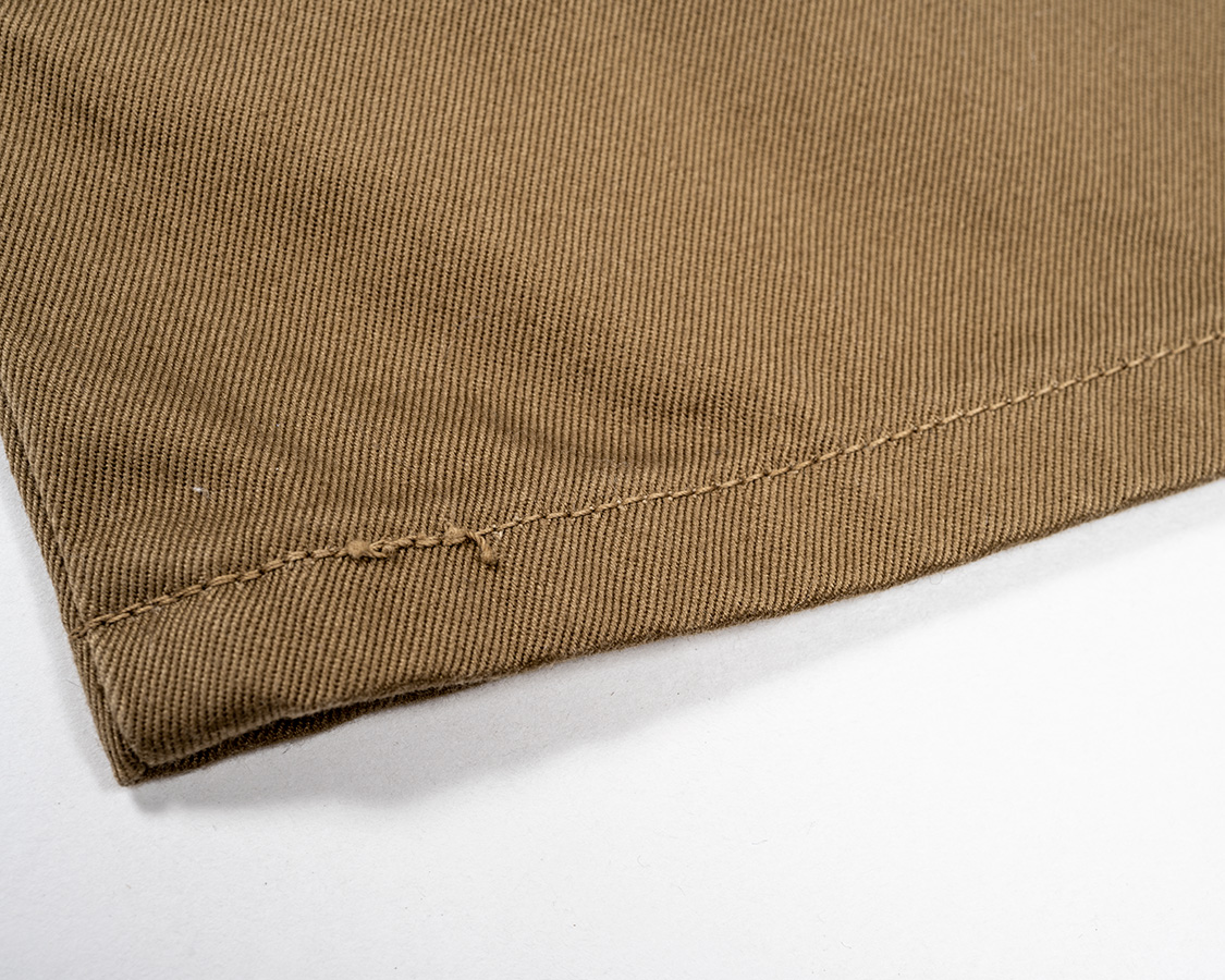 裾は1センチほどの幅で平ミシン始末。なぜか参考にしたビンテージがこれが多かったので。チノパンというと、幅の広い三巻が同じみなところ、あえて始末です。