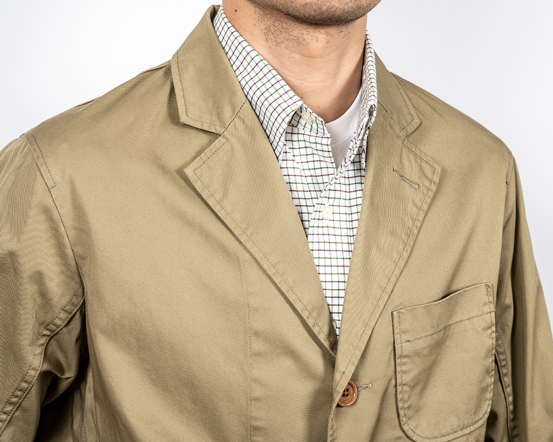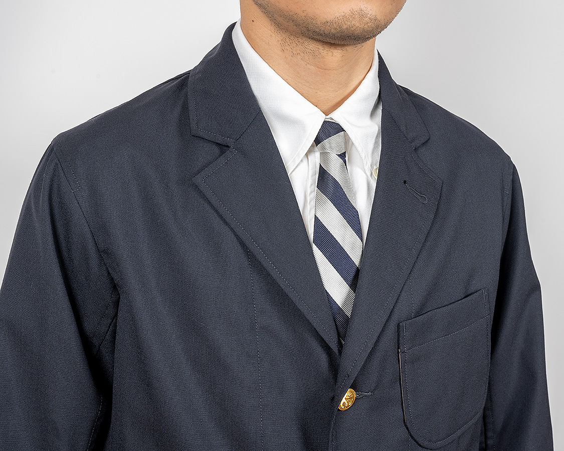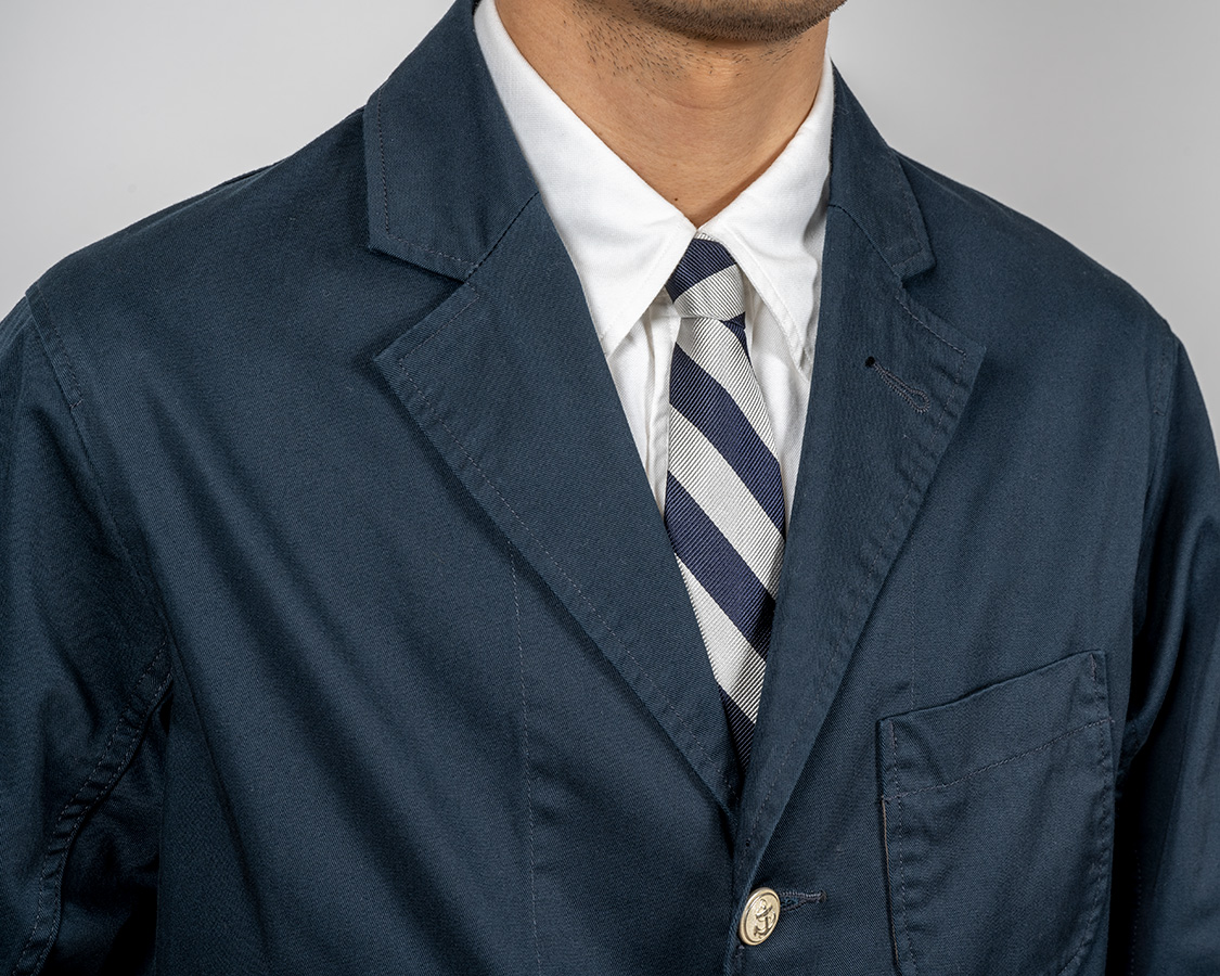 大きすぎない、かといって細すぎないラペル。上衿はラペル巾よりちょっと小さめ。どうしても首回りが欧米人く比べれば細い我々の体形に合わせて。また私自身、地味目が好きなので、どうしてもラペル周りは保守的かつ地味なデザインになります。