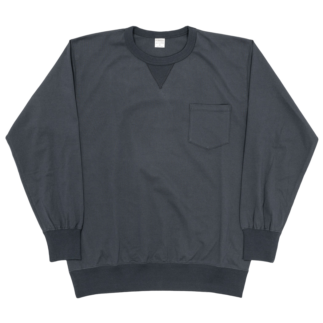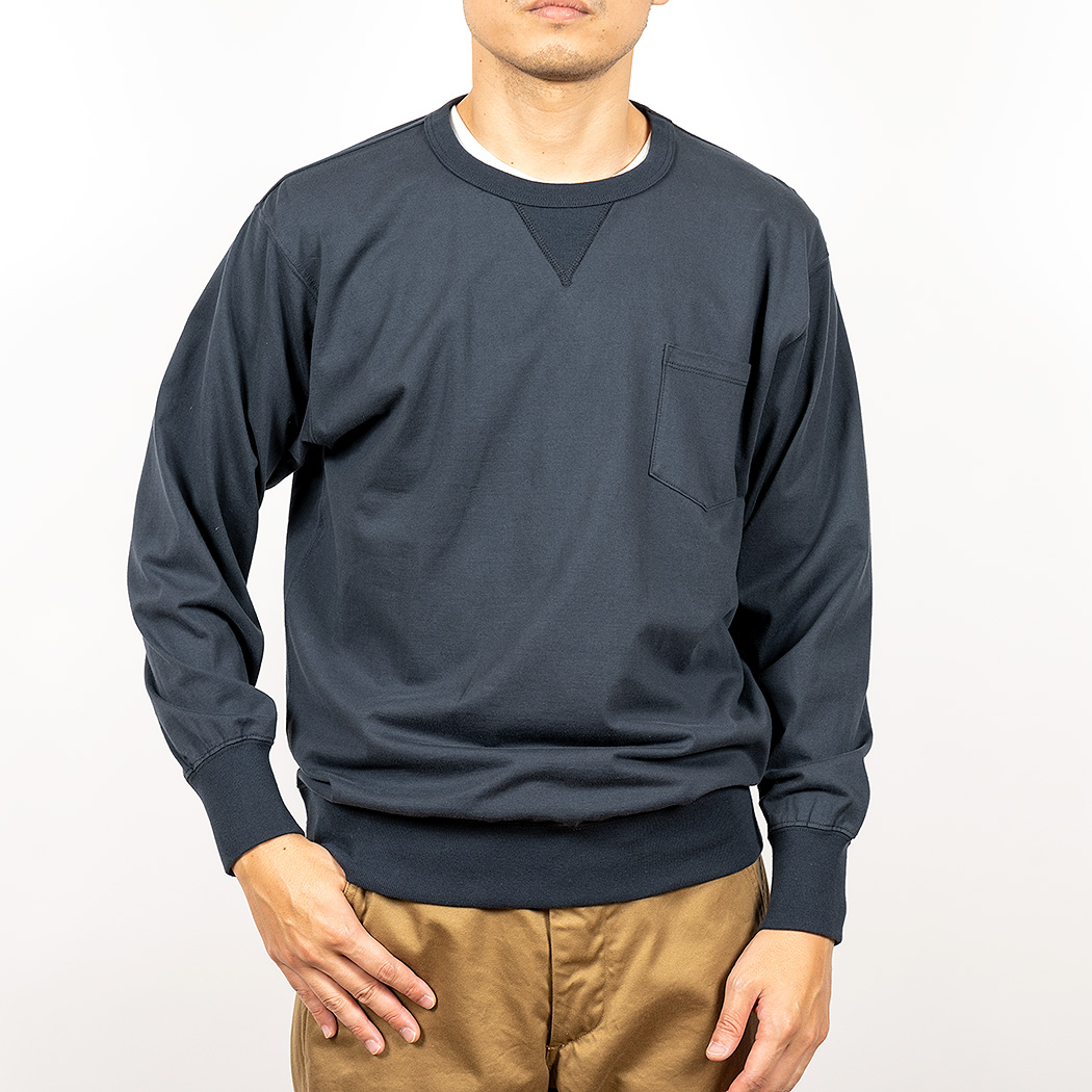 3 PLY Sweat Shirt、仕様はスウェットそのもの。前 V たたきつけ、袖口・裾はリブできゅっと絞る。首回り、リブ太め バインダー始末。首回りをリブでパイピング状に縫うので厚みが出て伸びにくい始末。