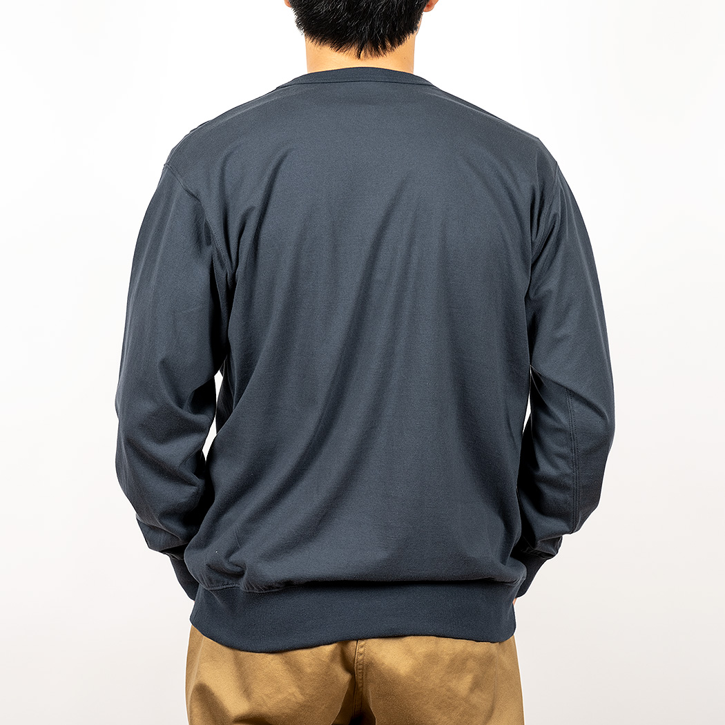 3 PLY T の為に開発した3本撚り糸天竺。ねじれない、毛玉ができにくい、とにかく伸びない。とてもしっかりした生地で過去にロンT やカーディガンも作ってきました。今年はその生地を見ていて「これでスウェット風のロンT」と、「さらにバランスを調整したカーディガン」を考えました。