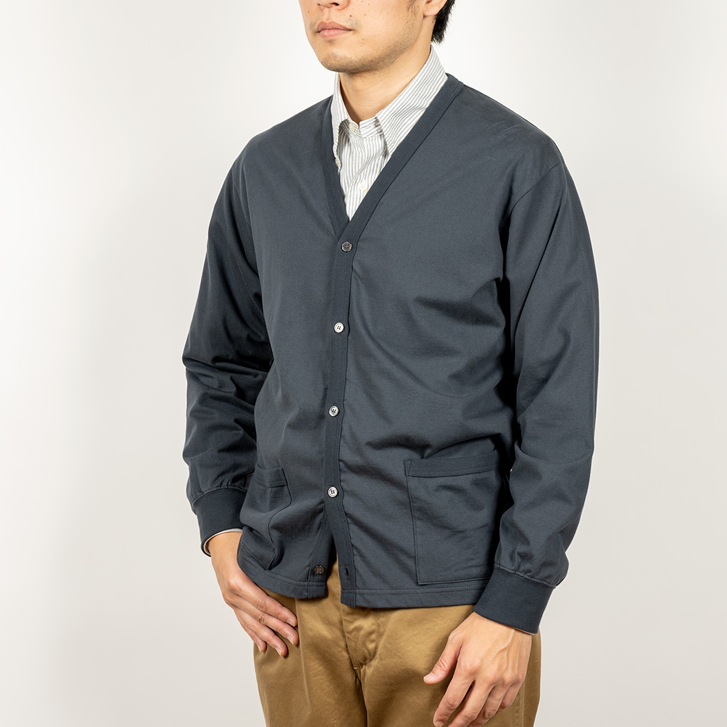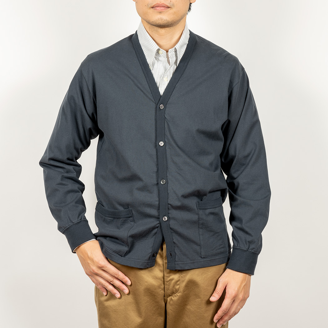 カーディガン、シャツの上に着て、寒い時期は上にジャケットを着る中間着。 桜が散るころにはアウターとして着ることもできる。セーターカーディガンがそろそろ終わりかな?という時期からが 3 PLY Cardigan の出番。ウールのカーディガンと違い気軽に水洗いできるのも良い点です。ボタンはあえて貝ボタン風のポリエステル樹脂。これなら洗濯してもまず割れる事がありません。