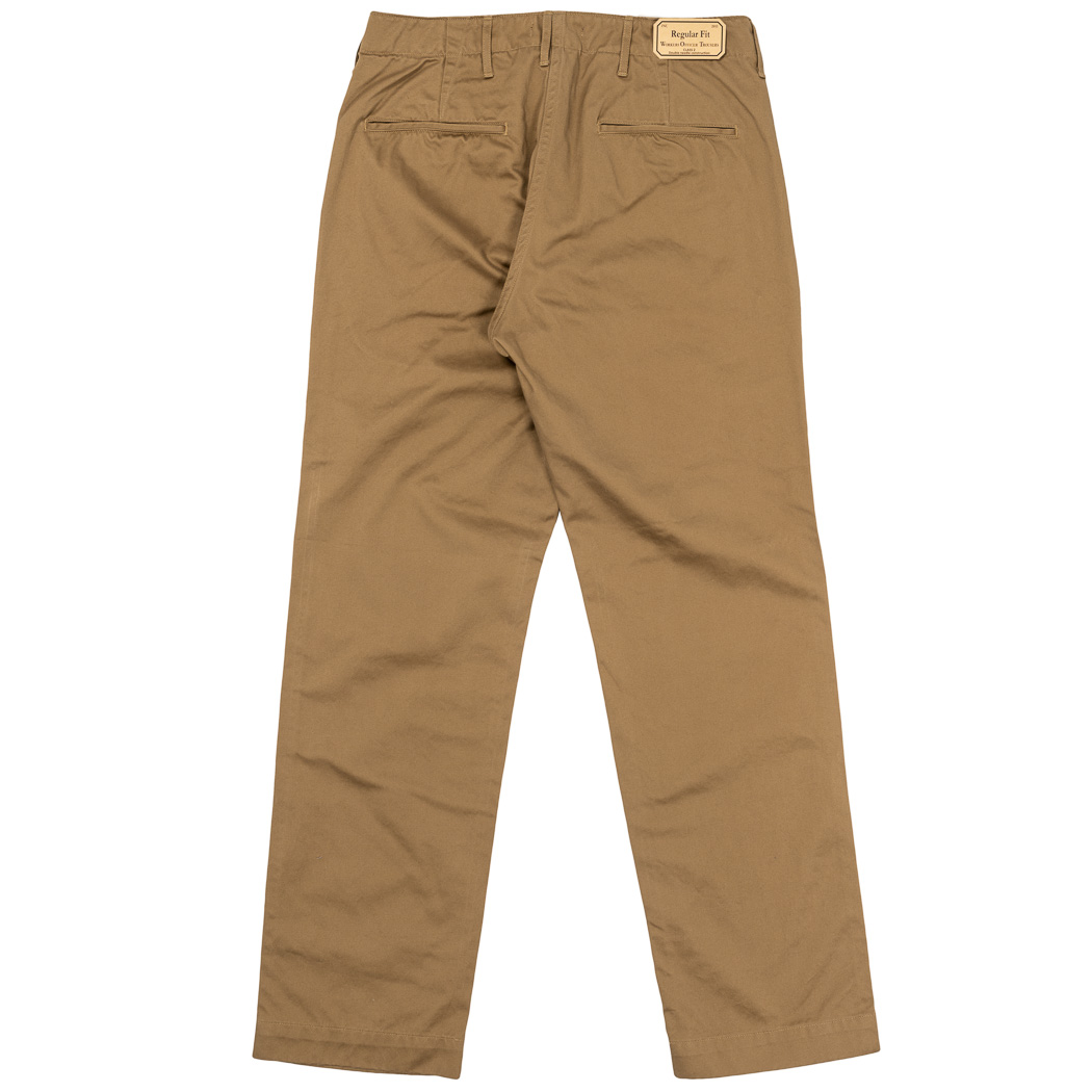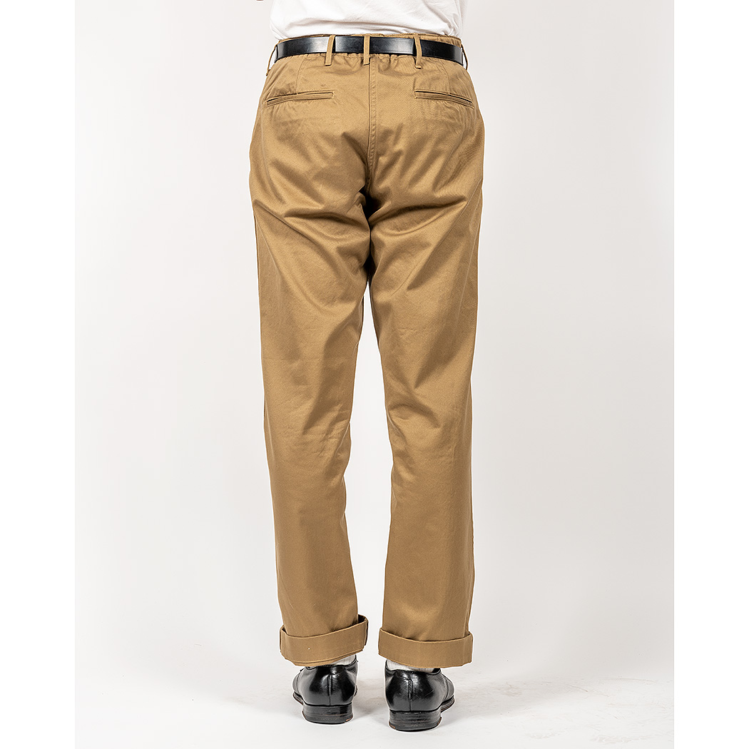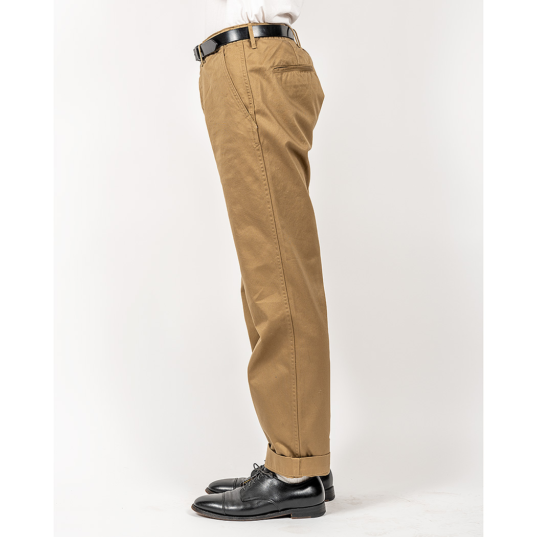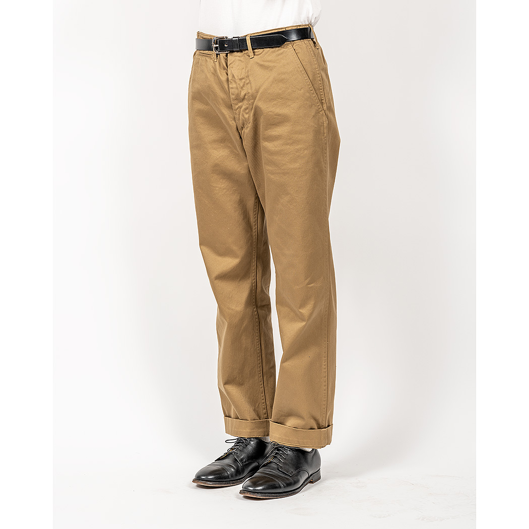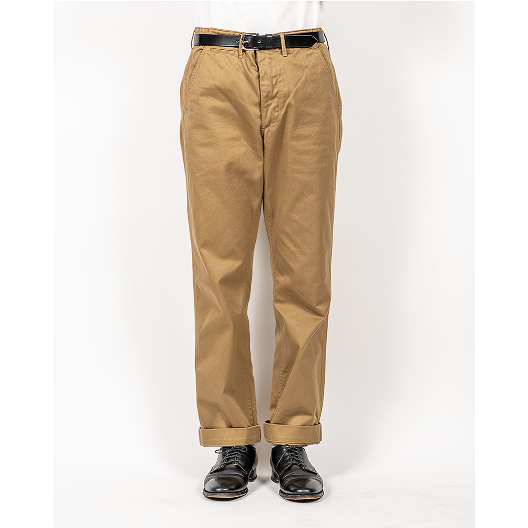 素材、チノは10 オンス程度の高密度生地。USMC Khaki はWORKERS 別注色。ビンテージのUSMC と思われるチノパンから取った、土臭い濃いめのカーキ。Light Beige はいわゆる「チノパン」のベージュ。