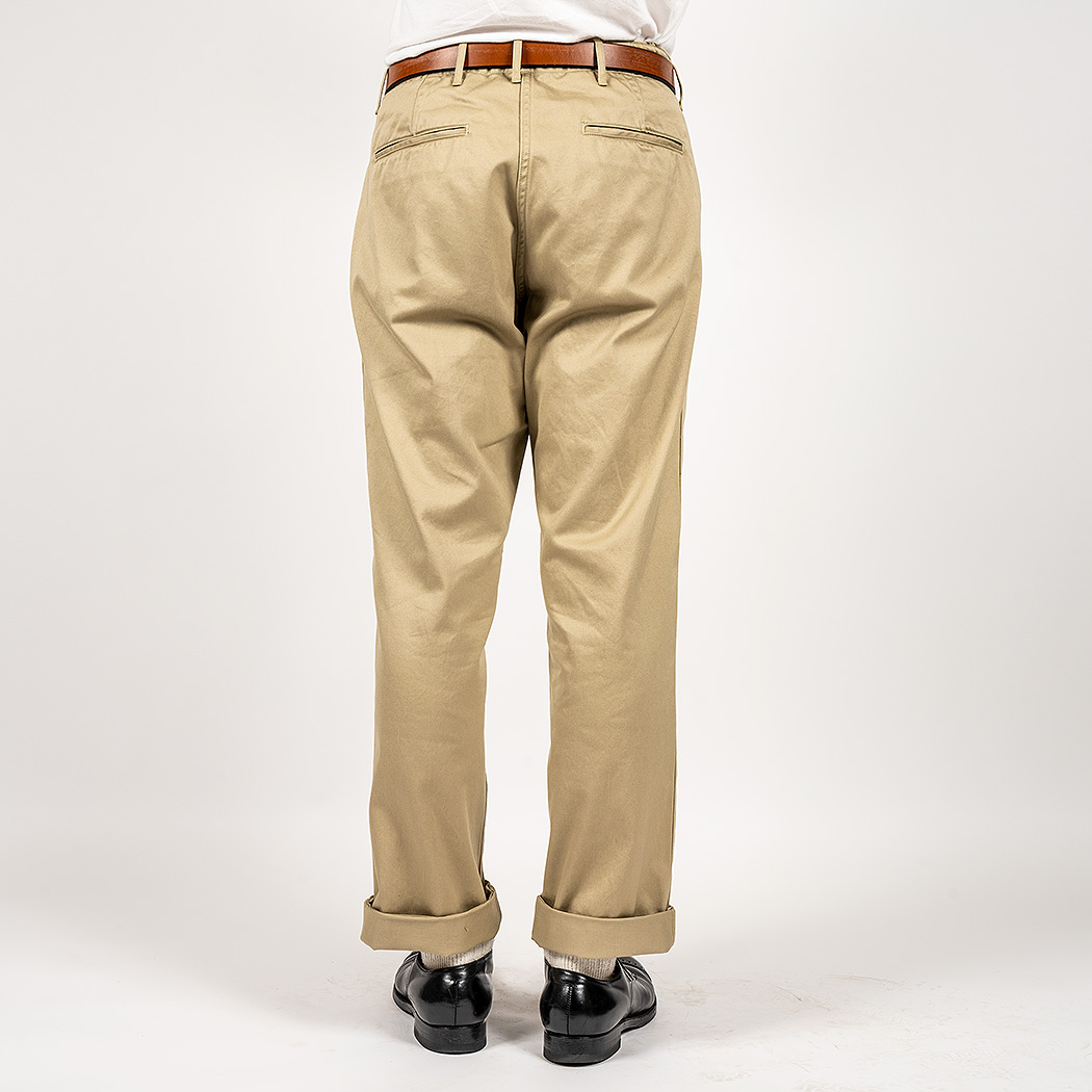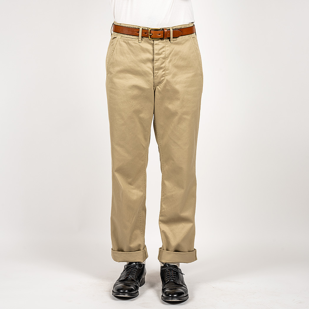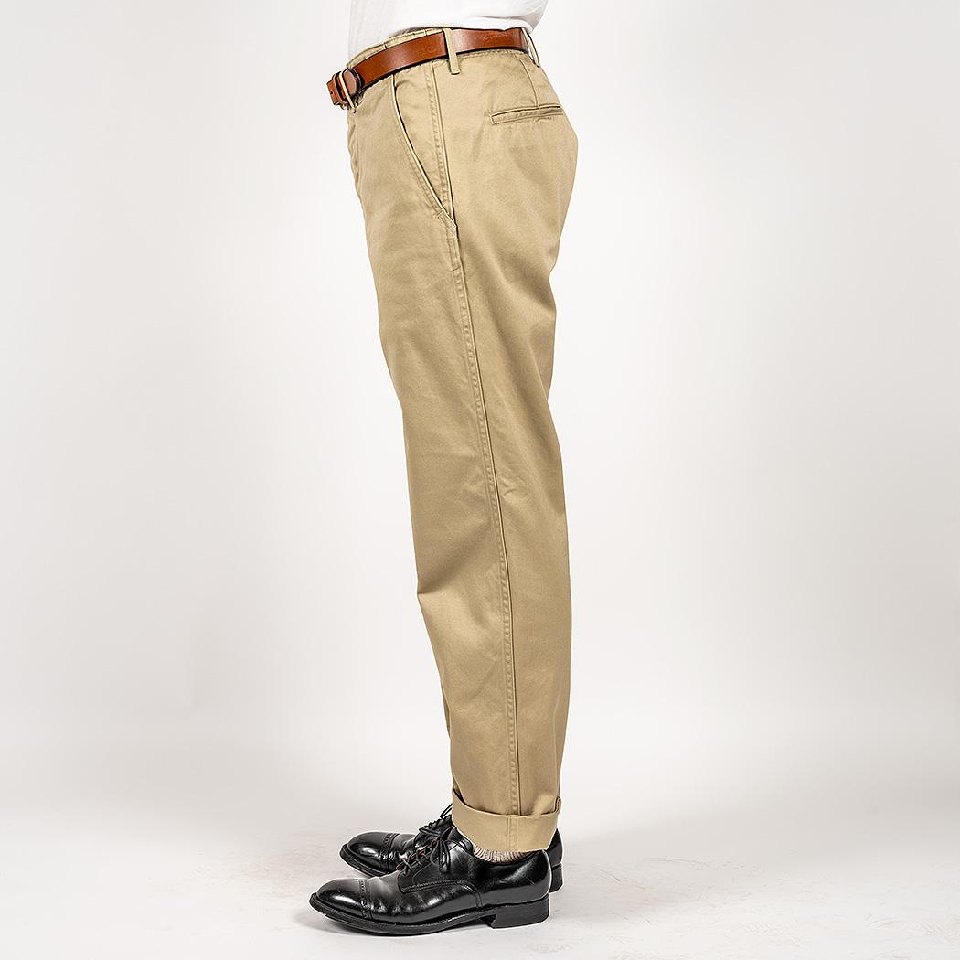 素材、チノは10 オンス程度の高密度生地。USMC Khaki はWORKERS 別注色。ビンテージのUSMC と思われるチノパンから取った、土臭い濃いめのカーキ。Light Beige はいわゆる「チノパン」のベージュ。