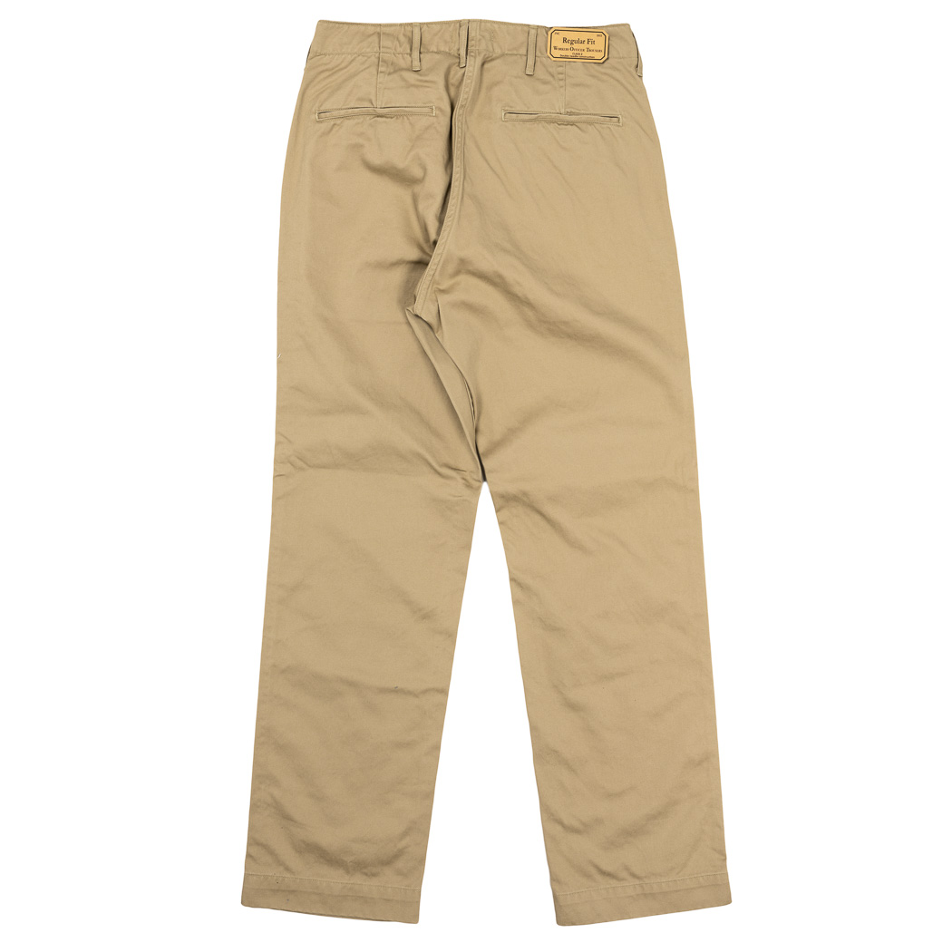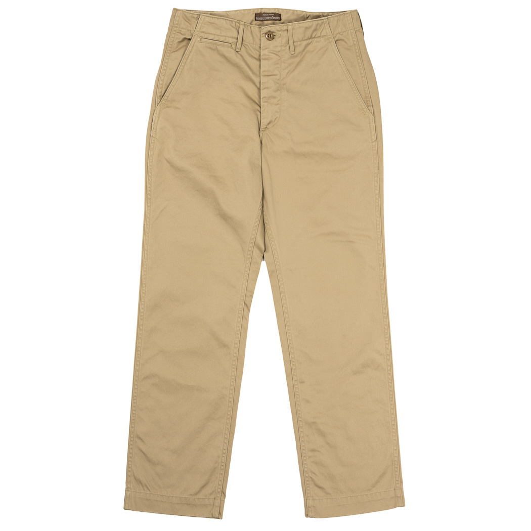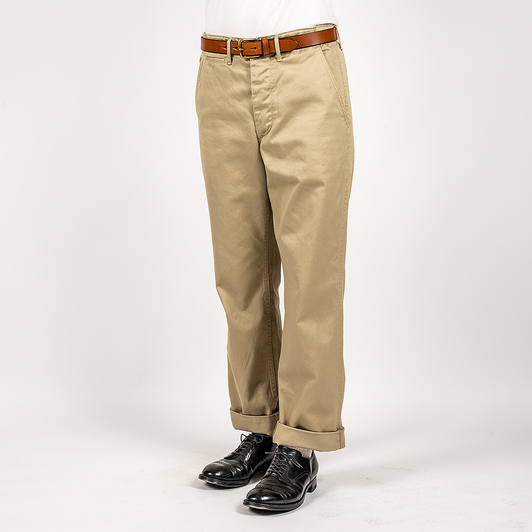 素材、チノは10 オンス程度の高密度生地。USMC Khaki はWORKERS 別注色。ビンテージのUSMC と思われるチノパンから取った、土臭い濃いめのカーキ。Light Beige はいわゆる「チノパン」のベージュ。