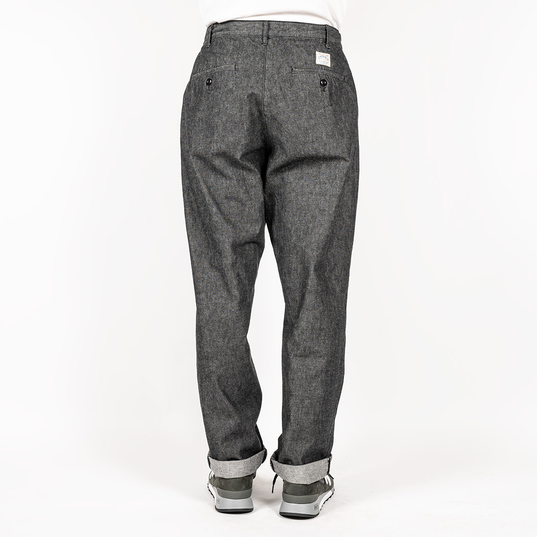 腰回り・ヒップにゆとりがあるので動きやすい。裾はあえてジーンズのような1センチ程度の幅の三巻始末。腰のタック見ると、古いミリタリーのチノパン あたりをモデルにしているのかな?とは思いますが。全体の仕様は80-90年代的な簡素で強度はしっかりあるもの。この「レプリカとも違う」「80年代、ぎりぎりMade in USAでやれる範囲」の仕様を再現しています。