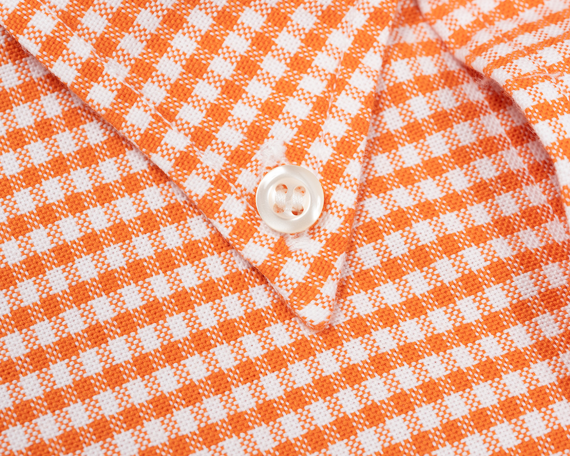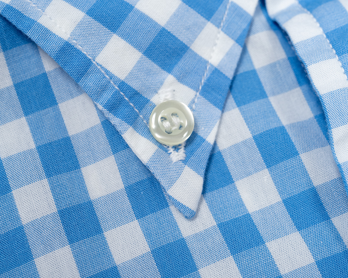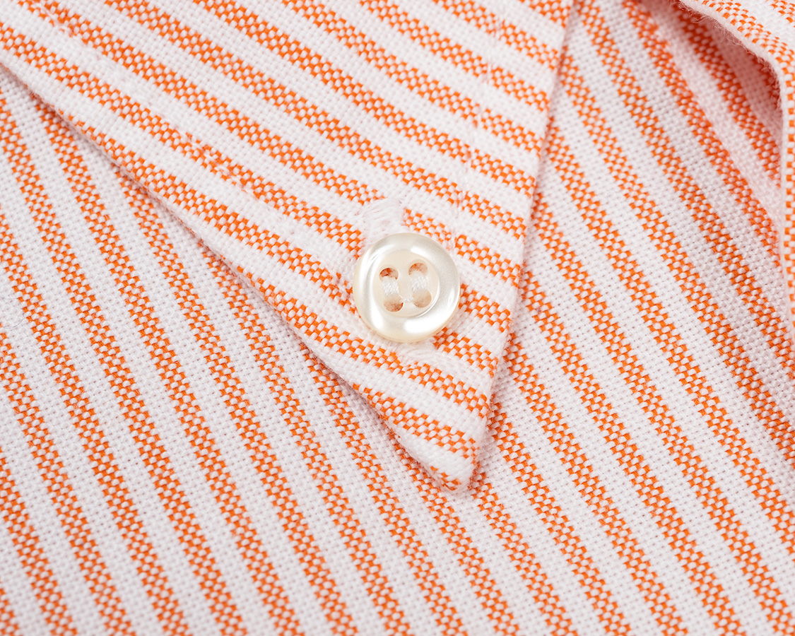 羽襟先のボタン。襟ステッチにかかるぐらいの位置。厚手のオックスでもきれいにひっくり返っている襟先。やっぱり、こういう部分は「シャツ専門工場」の仕上がりの良さがわかる部分です。私もよく「服縫えるの?」と聞かれますが、形にはできます。でも、中々きれいに出来ないのがこういう襟先とかひっくり返す部分。道具も要るし、一日にそこを何十枚をやるからこそ、量産の独特な「うまさ」が出る部分です。