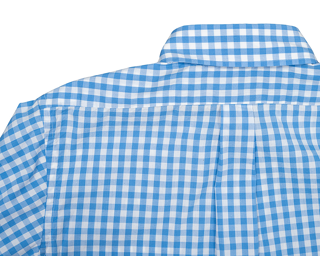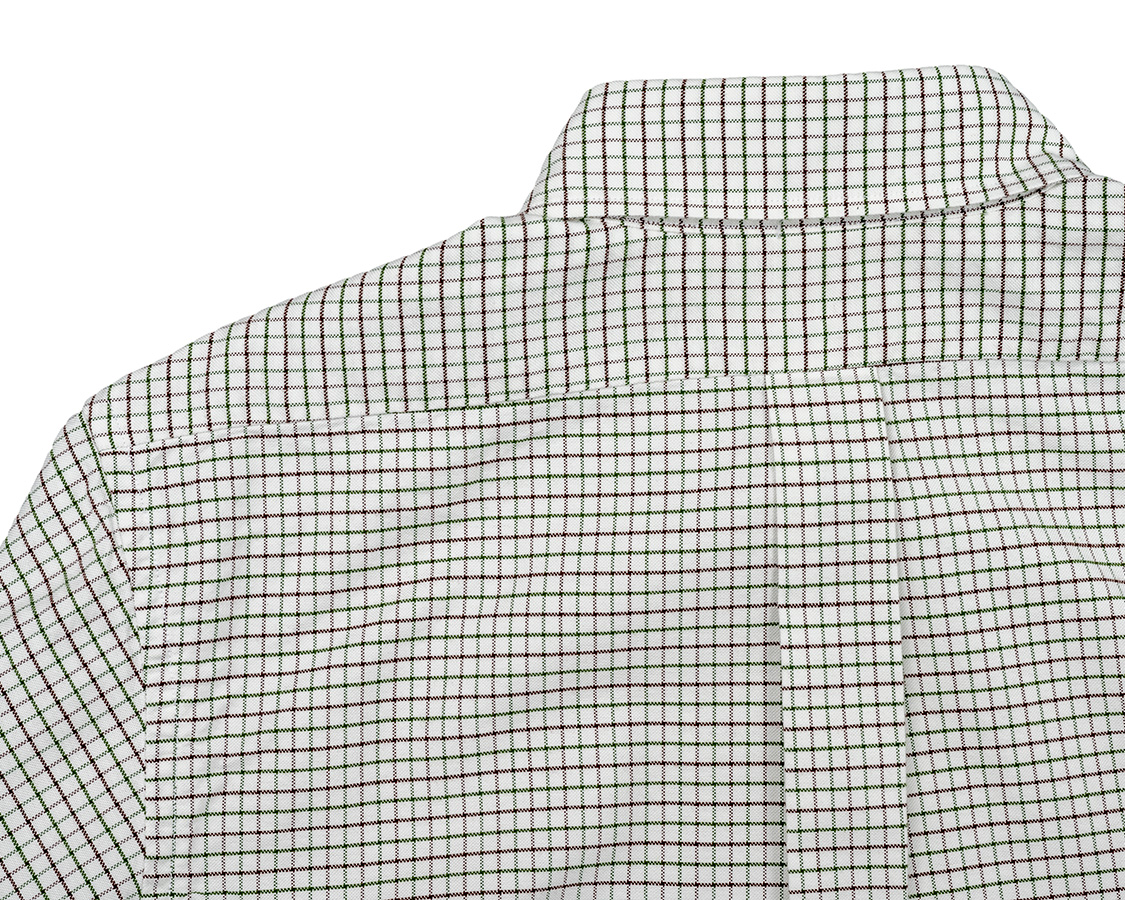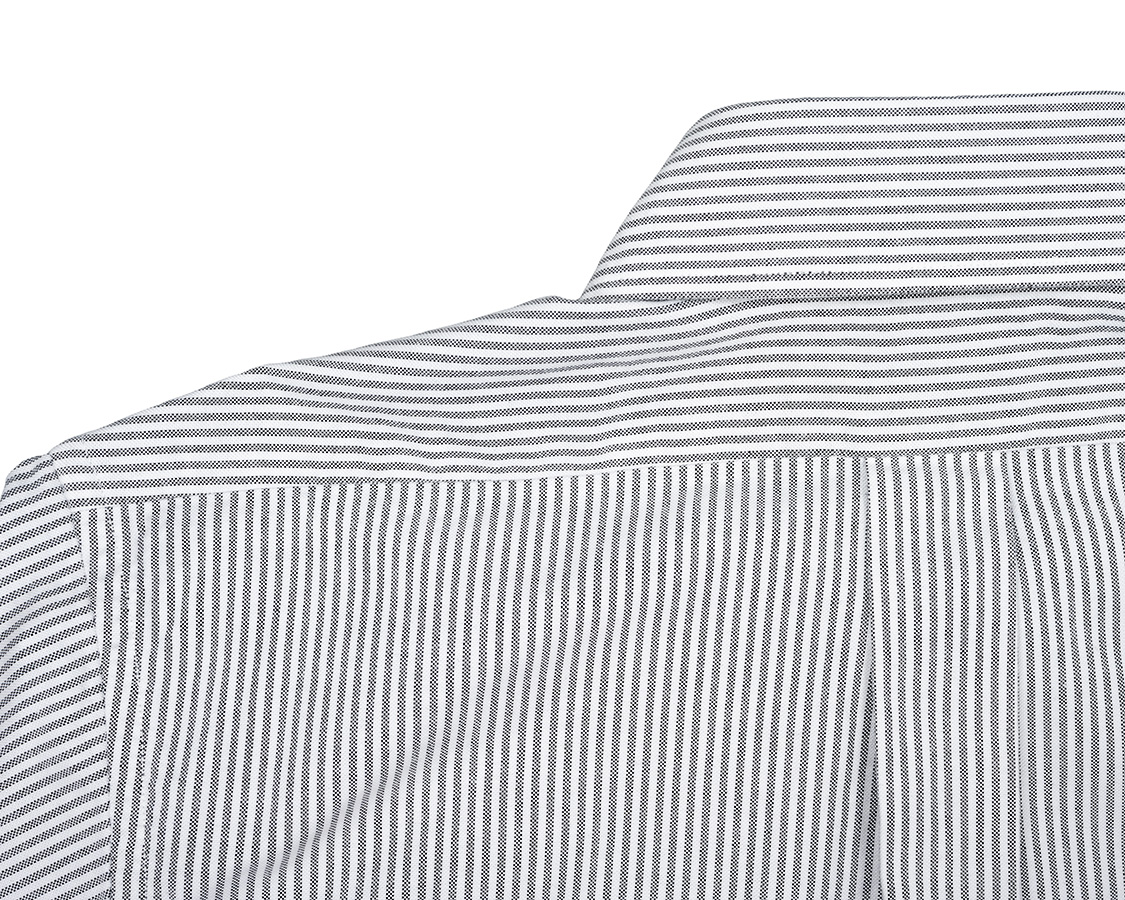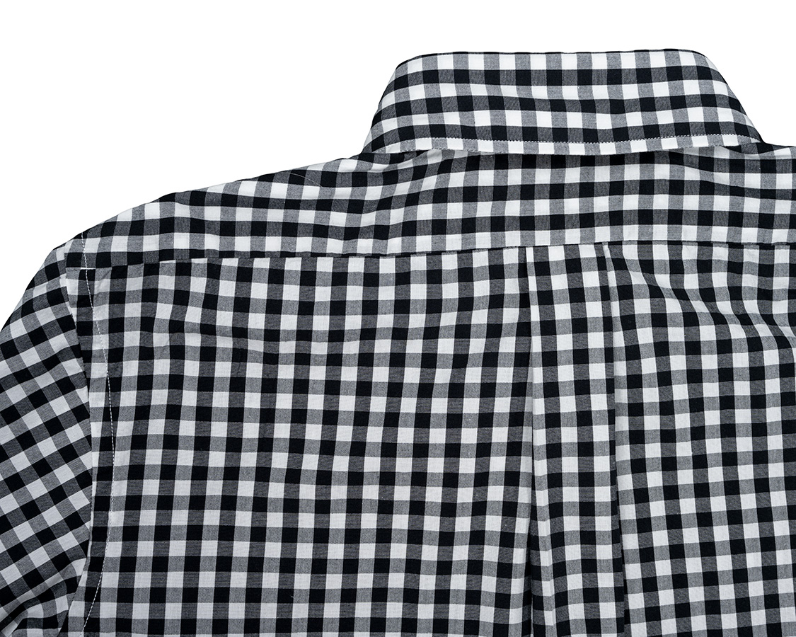 後ろ中心にタック。このタックのおかげで、体が動いたときは身頃にゆとりが出る。でも、肩は「すっきり見える」ある程度の幅で抑えることができる。ここが、典型的なワークシャツとボタンダウンはじめとしたスポーツシャツ/ドレスシャツの違いです。