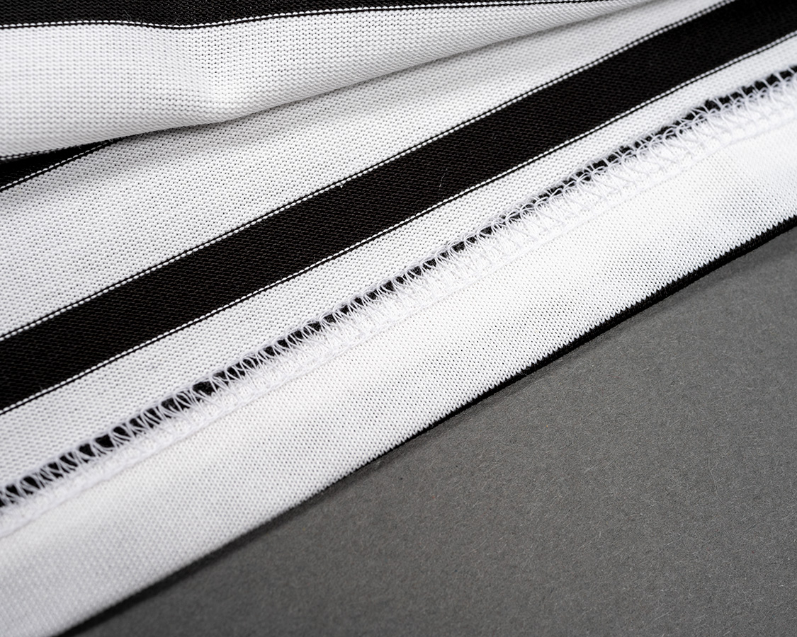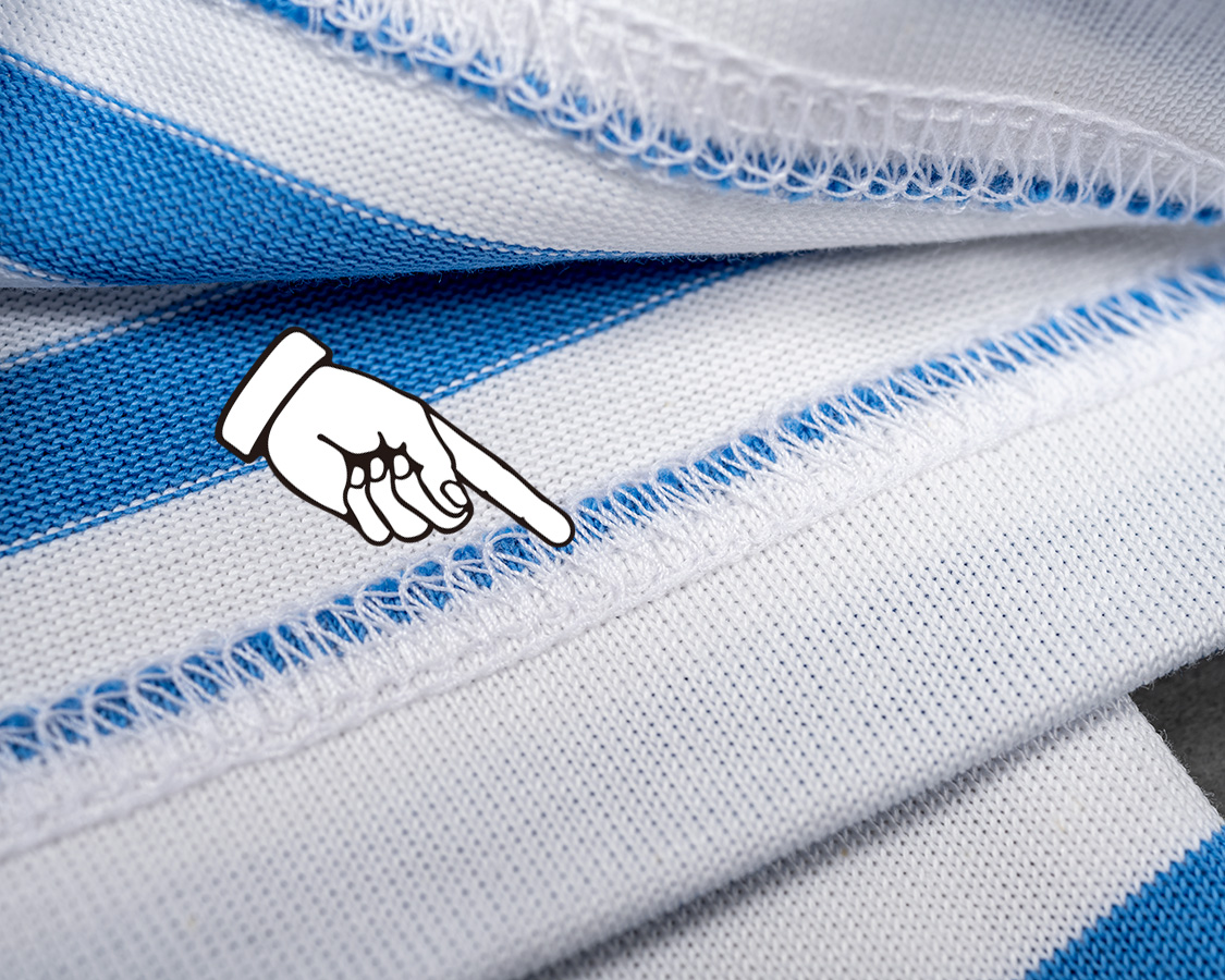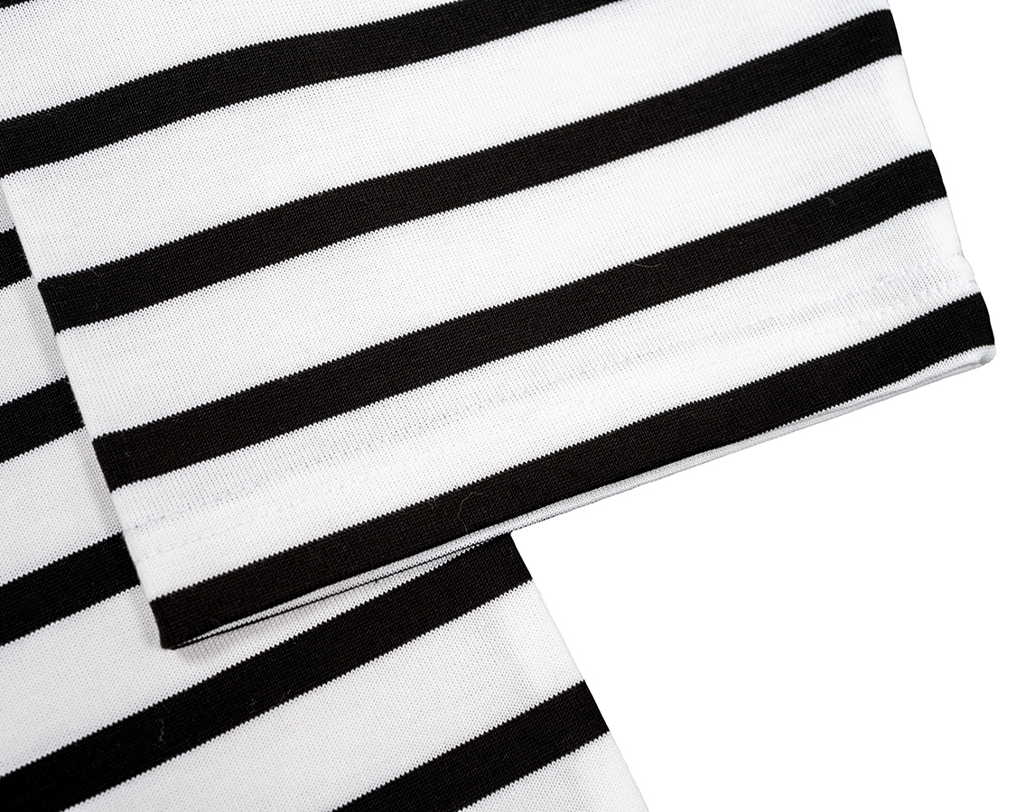 袖口、裾のタブルステッチ。「扁平縫い」と呼ばれる、表から見るとダブルステッチ、裏から見るとロックのような糸が渡った状態。矢印部分、その扁平縫いの前に一度、オーバーロックもかけています。万が一、扁平縫いが外れたとしてもオーバーロックが残るので、生地の切り端がすぐに見えてこないようにというひと手間。