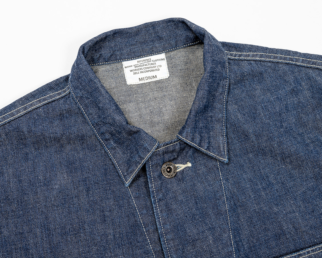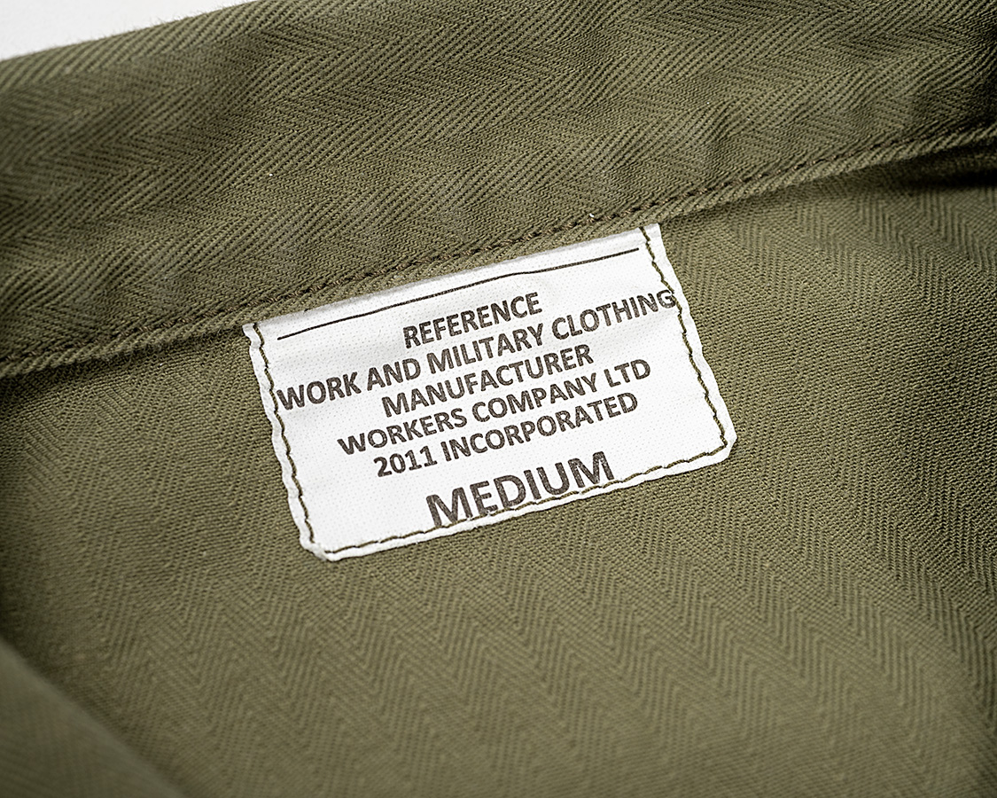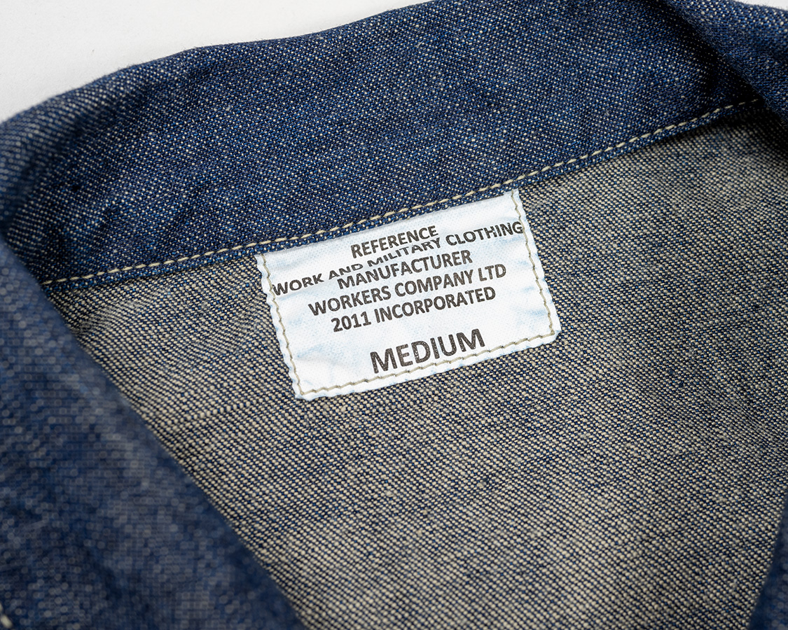 ネームはミリタリー風。デニム、緯糸(ヨコ)が染まっているのがわかります。生成りではなく、薄ベージュに染めています。表から見た時にインディゴ+薄ベージュで、より「どす黒く、濃く」見えます。洗っていくと、タテのインディゴだけでなくヨコのベージュも徐々に落ちるので、色の変化が強く経年変化をより楽しむことができます。