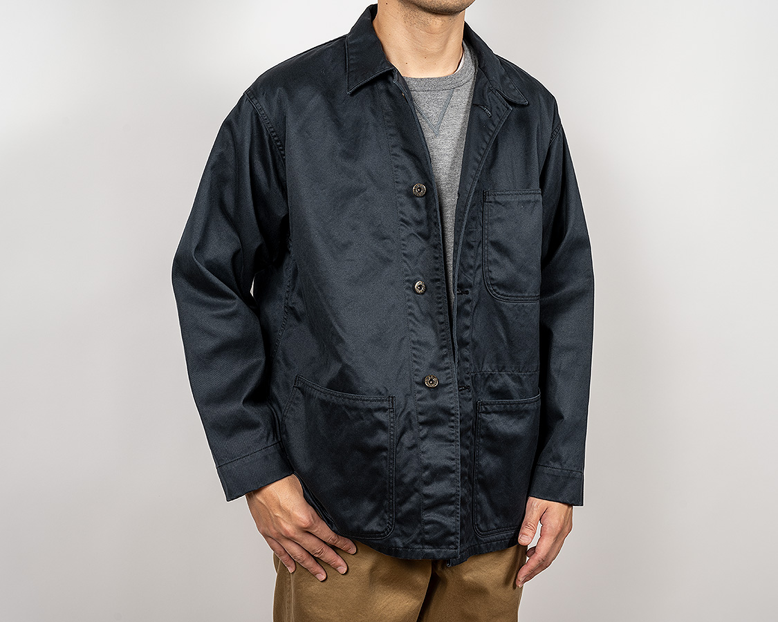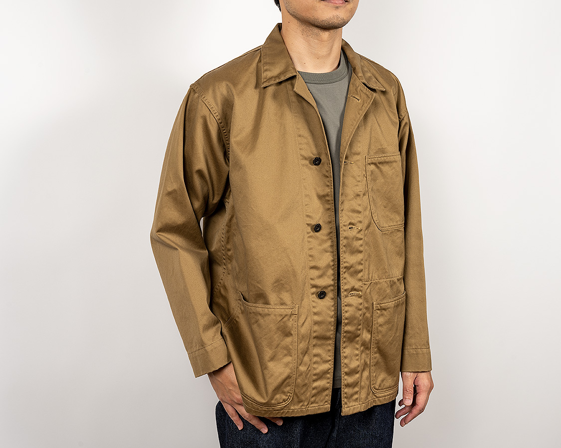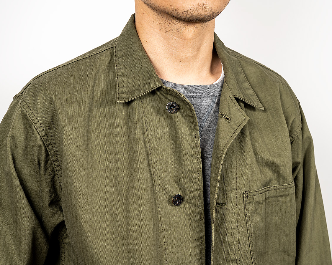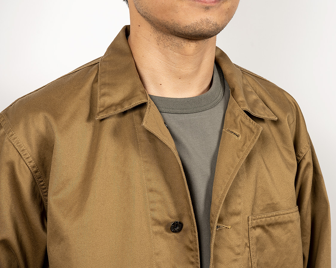 ご覧の通り、わざわざ言わなければミリタリーの何々だとか感じない、普通のカバーオール。オリジナル見ながら変更したのは袖。オリジナルはアームホールが小さく袖も細い。それを、カマ(アームホールの縦方向)を広げて寸法を出し、袖もそれに合わせて太く。落ち気味の肩と合わせて、ゆったりリラックスしたフィット感に変更しています。