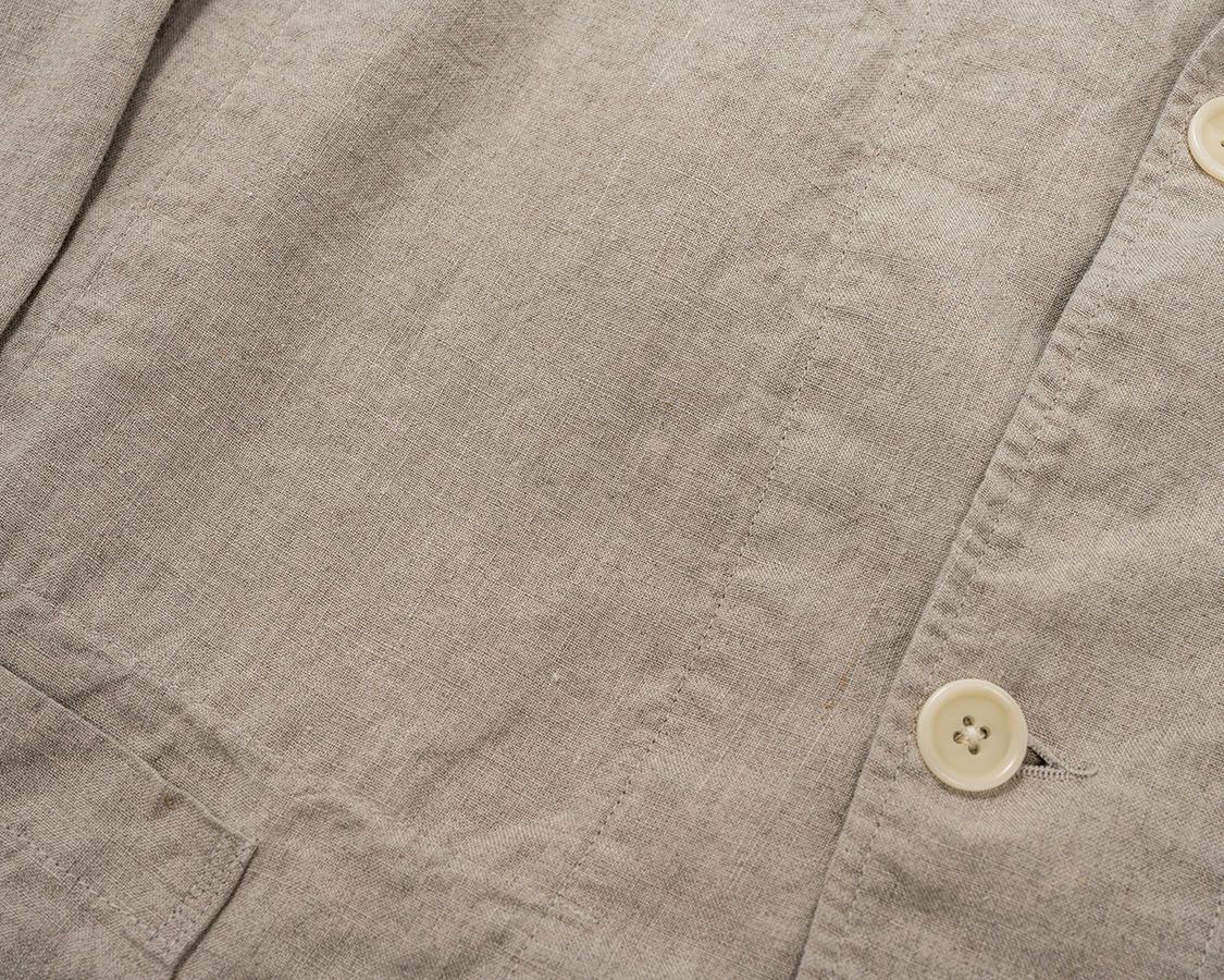 リネンは5オンス程。オンスはある程度ありますが、太い糸でざっくり織られているので向こうが透けて見える。この隙間から風が通って涼しい。ほぼチクチク無し。それでも気になる方は5回ほど洗うと、 かなり柔らかくなります。腰が無いのとは違う、リネン独特のプリっとしたハリはちゃんと残ります。