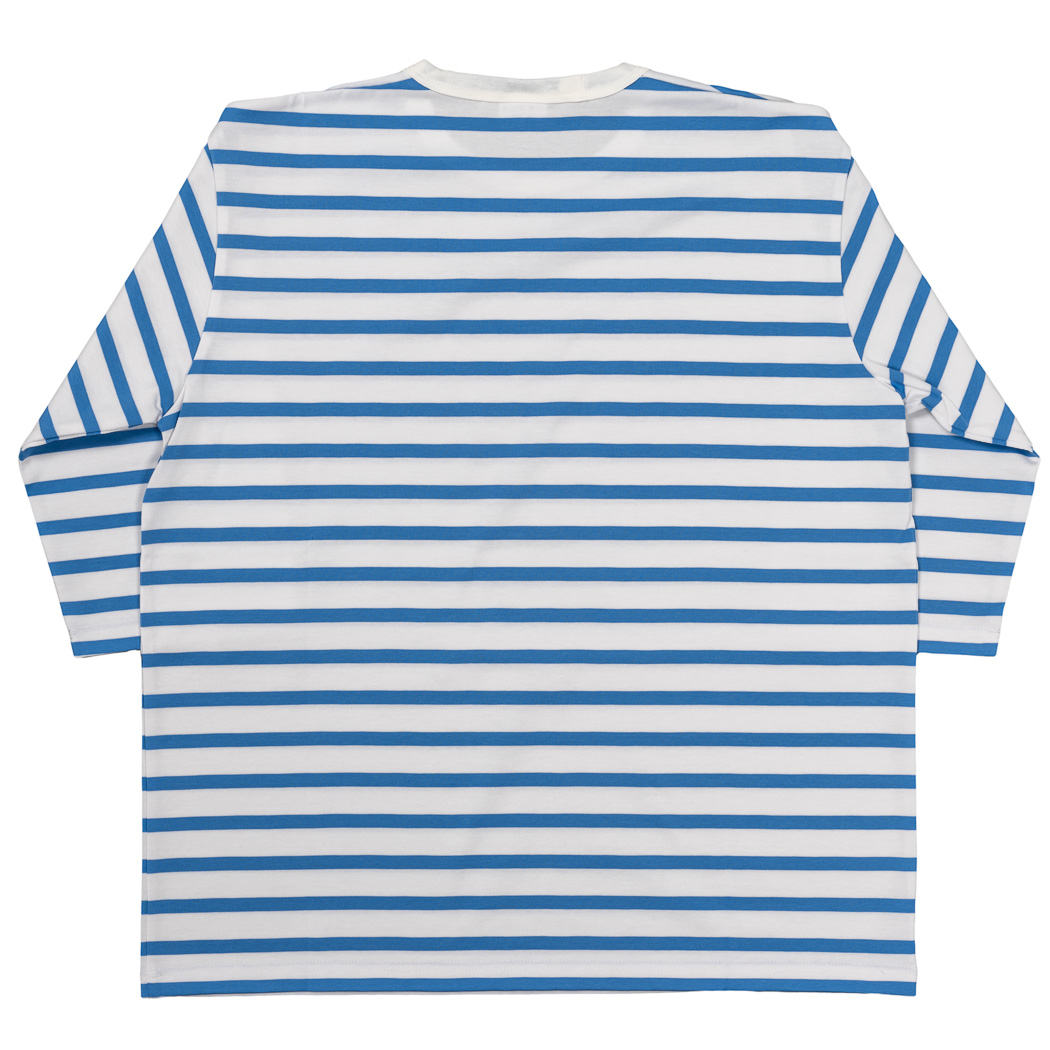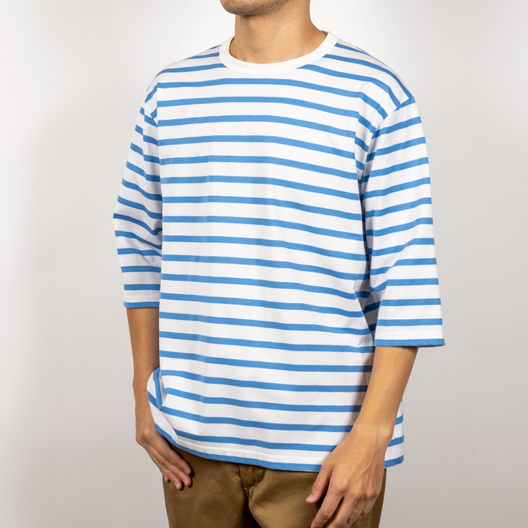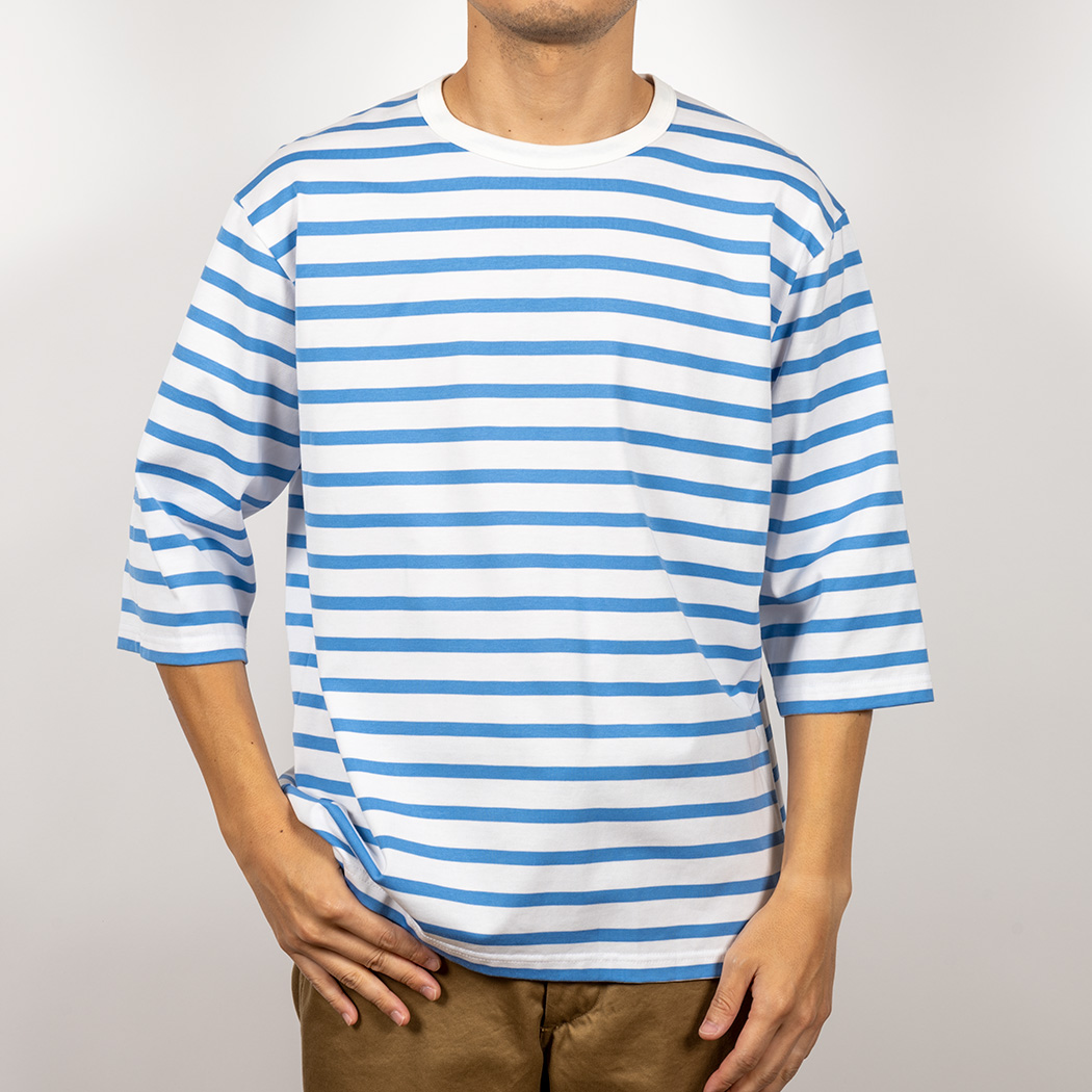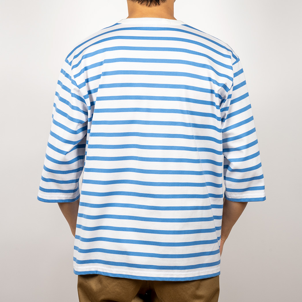 クルーネックは首のリブをがっしり厚い物にして、ボーダーの色部分が透けづらいように。ヘンリーネックはボタンを開 けると着脱ぎが楽。締めれば首回りはしっかり収まる。カットソーを作る時の命題 「頭は通る、でも首回りにはしっか りフィットさせる」一つの回答がヘンリーネック。