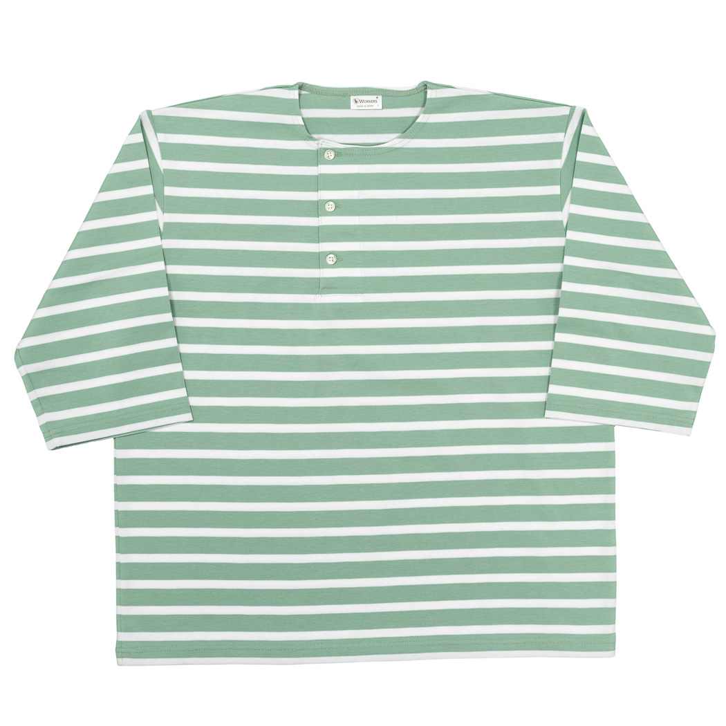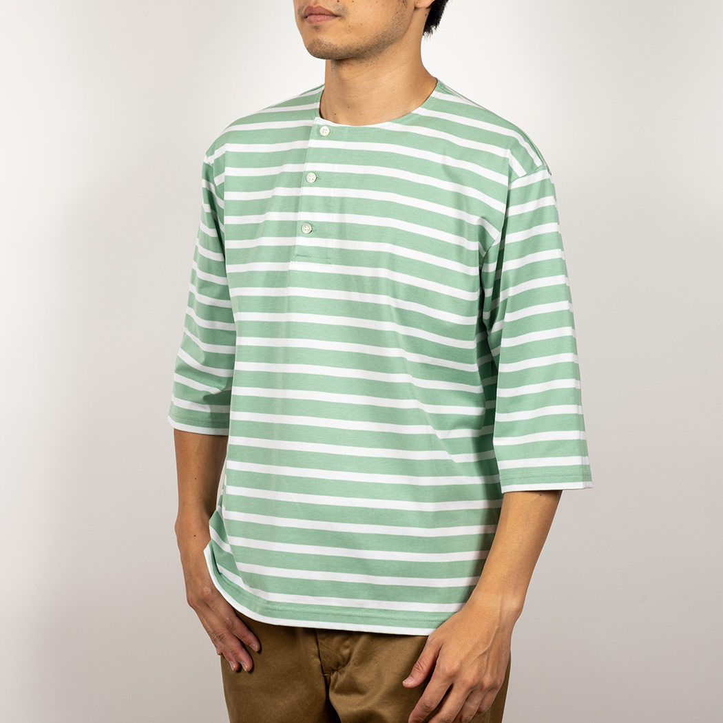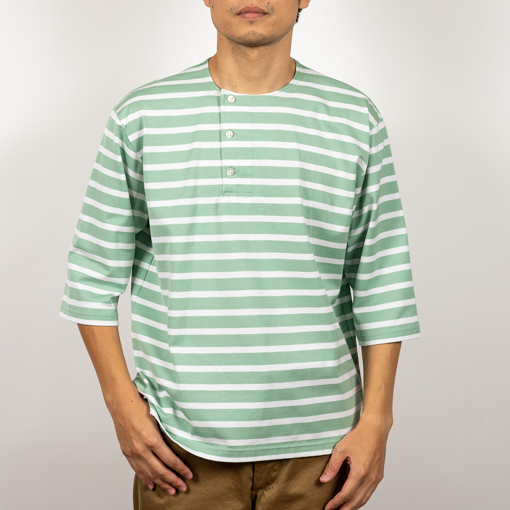 ヘンリーネックはボタンを開 けると着脱ぎが楽。締めれば首回りはしっかり収まる。カットソーを作る時の命題 「頭は通る、でも首回りにはしっかりフィットさせる」一つの回答がヘンリーネック。